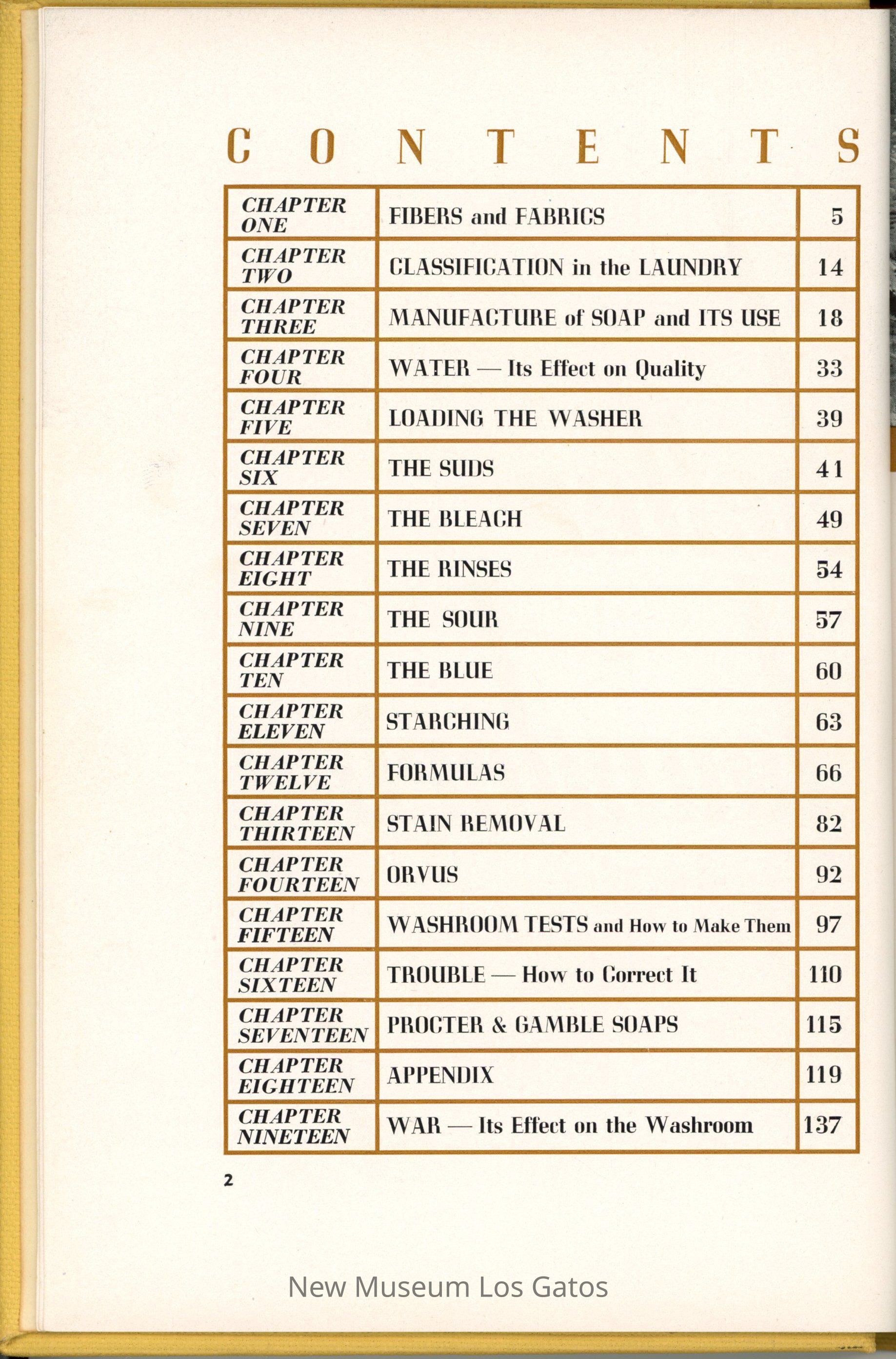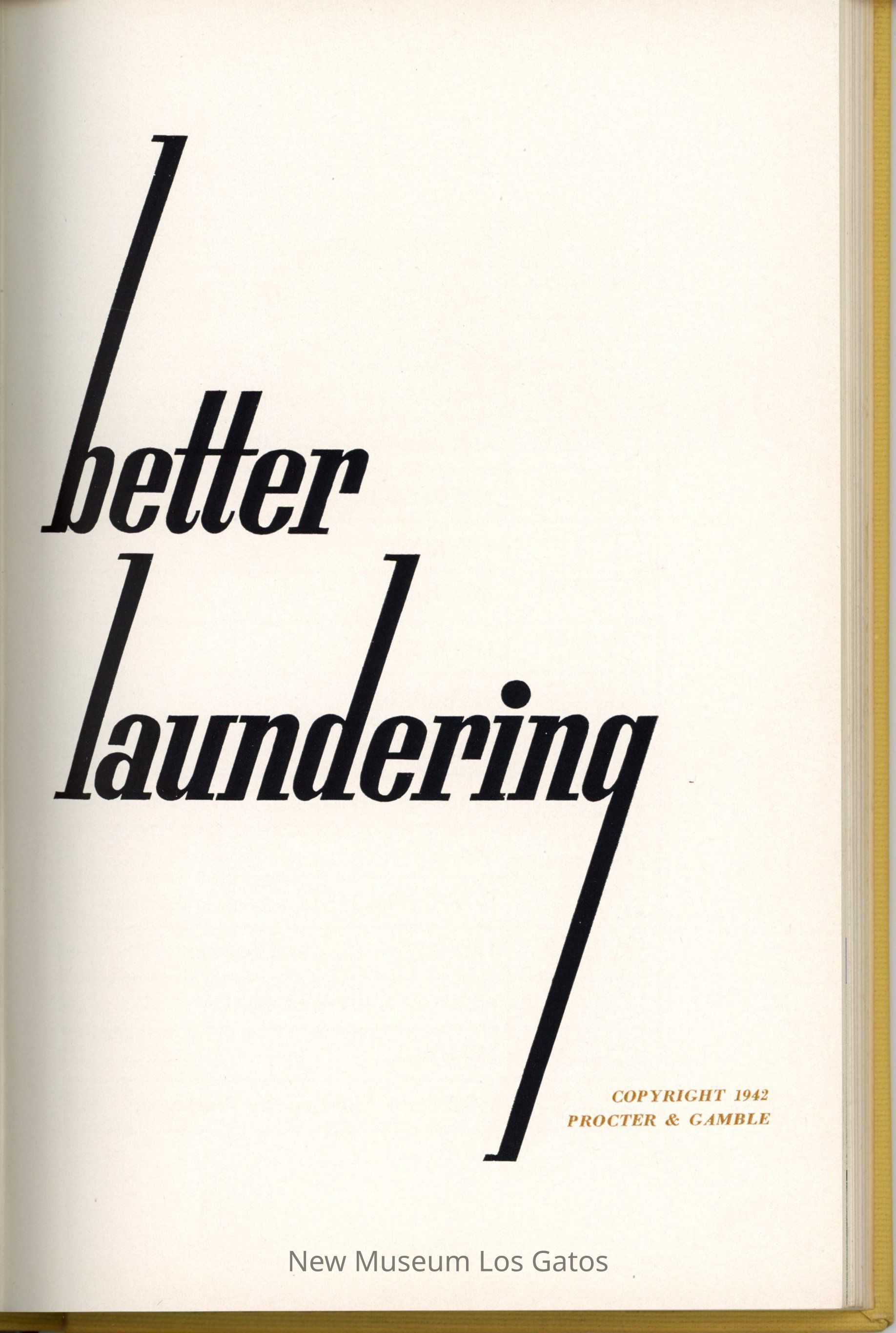 A yellow fabric-bound book about how to launder different types of fabrics, as well as laundry techniques.Collection