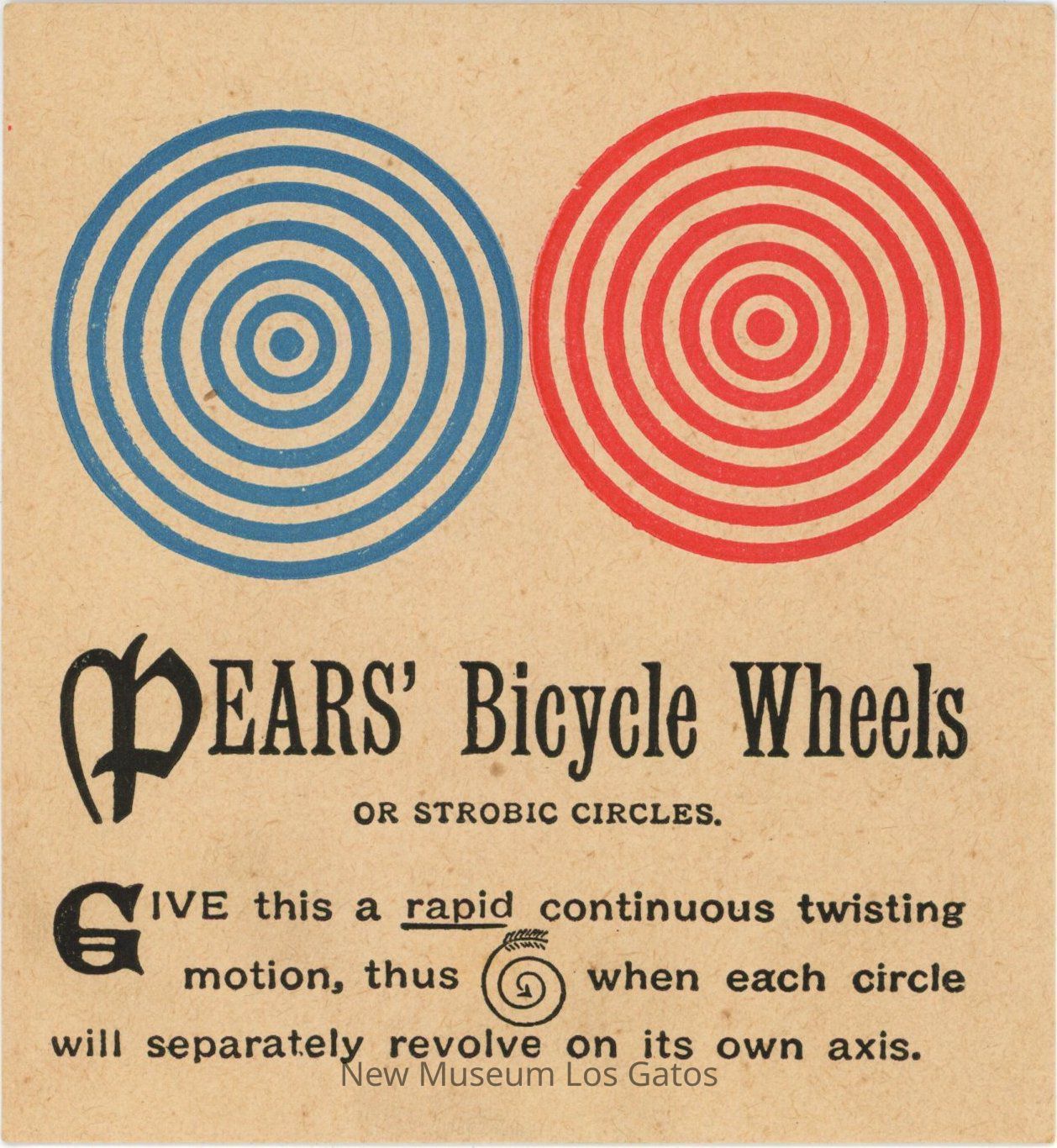 An advertising card, featuring the "bicycle wheels" or "strobic circles" illusion. The front of the card has a set of blue concentric circles and a set of red concentric circles, as well as the instructions for the illusion. The back of the card has more advertising information.Collection