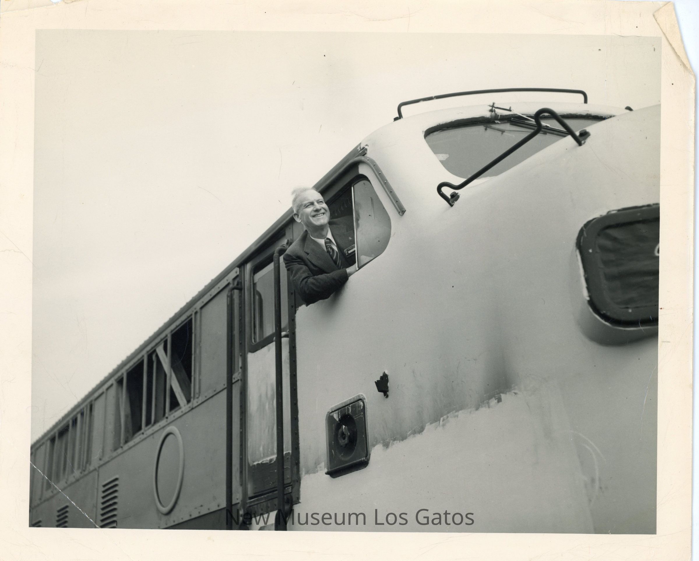 A black and white photograph featuring Billy Jones inside of a train engine. Jones is wearing a dark suit, and is leaning outside a window in the engine, smiling and looking off into the distance.
