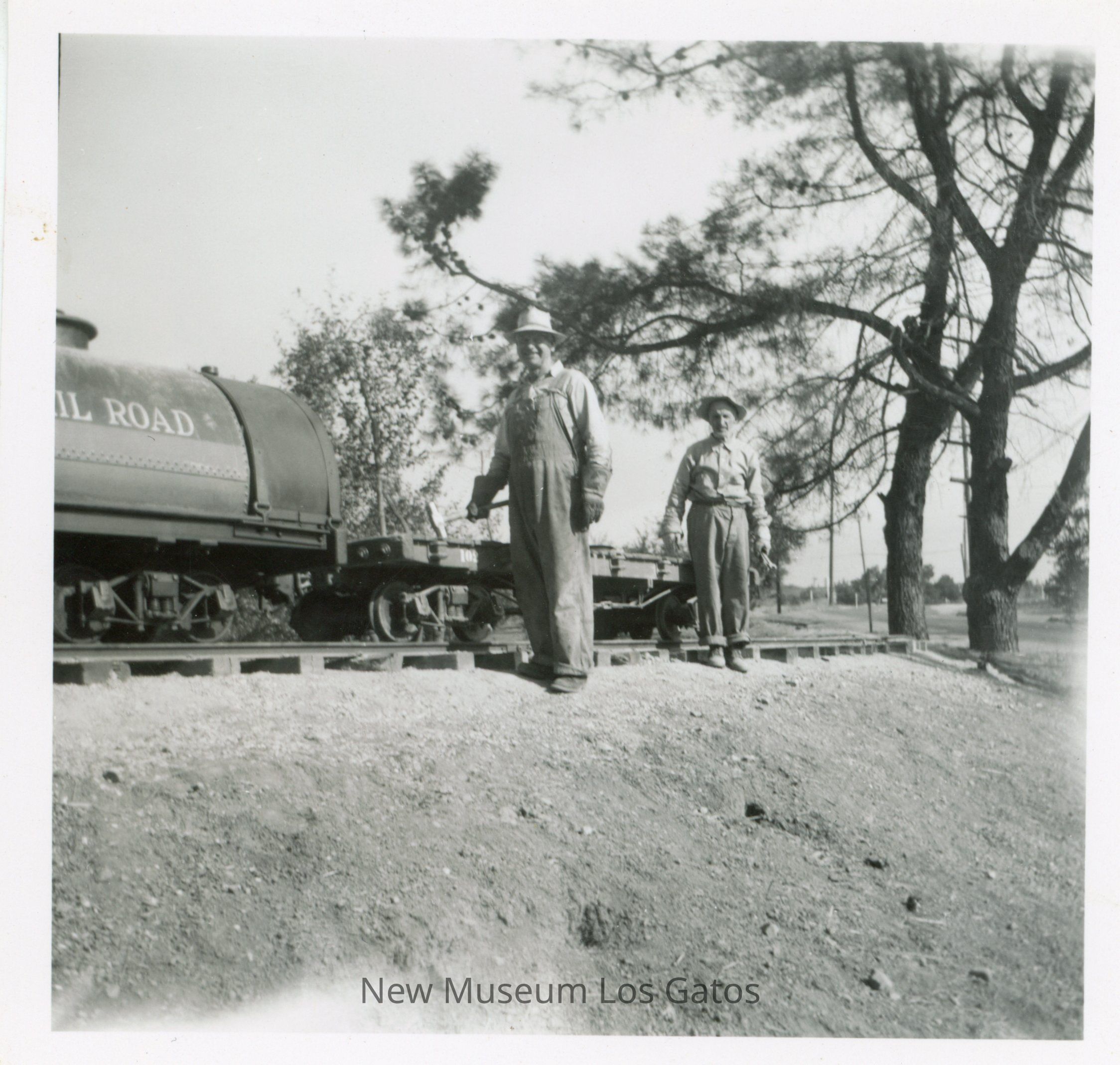 A black and white photograph featuring Billy Jones and his brother. The two men are wearing overalls, work clothes, and hats, and are standing up on a dirt hill. Behind them is the back side of a train engine connected to a flat car. The image is surrounded by a white border.Photograph Details