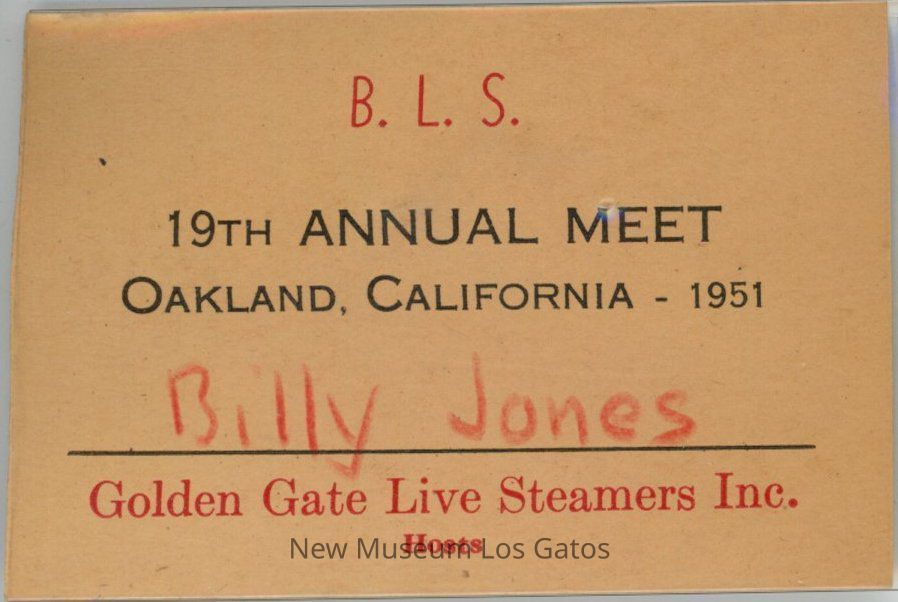 A nametag for Billy Jones for the B.L.S. (Brotherhood of Live Steamers) annual meeting in Oakland in 1951. The nametag is on a tan piece of paper, inside of a plastic sleeve with a silver clasp on the back.Collection