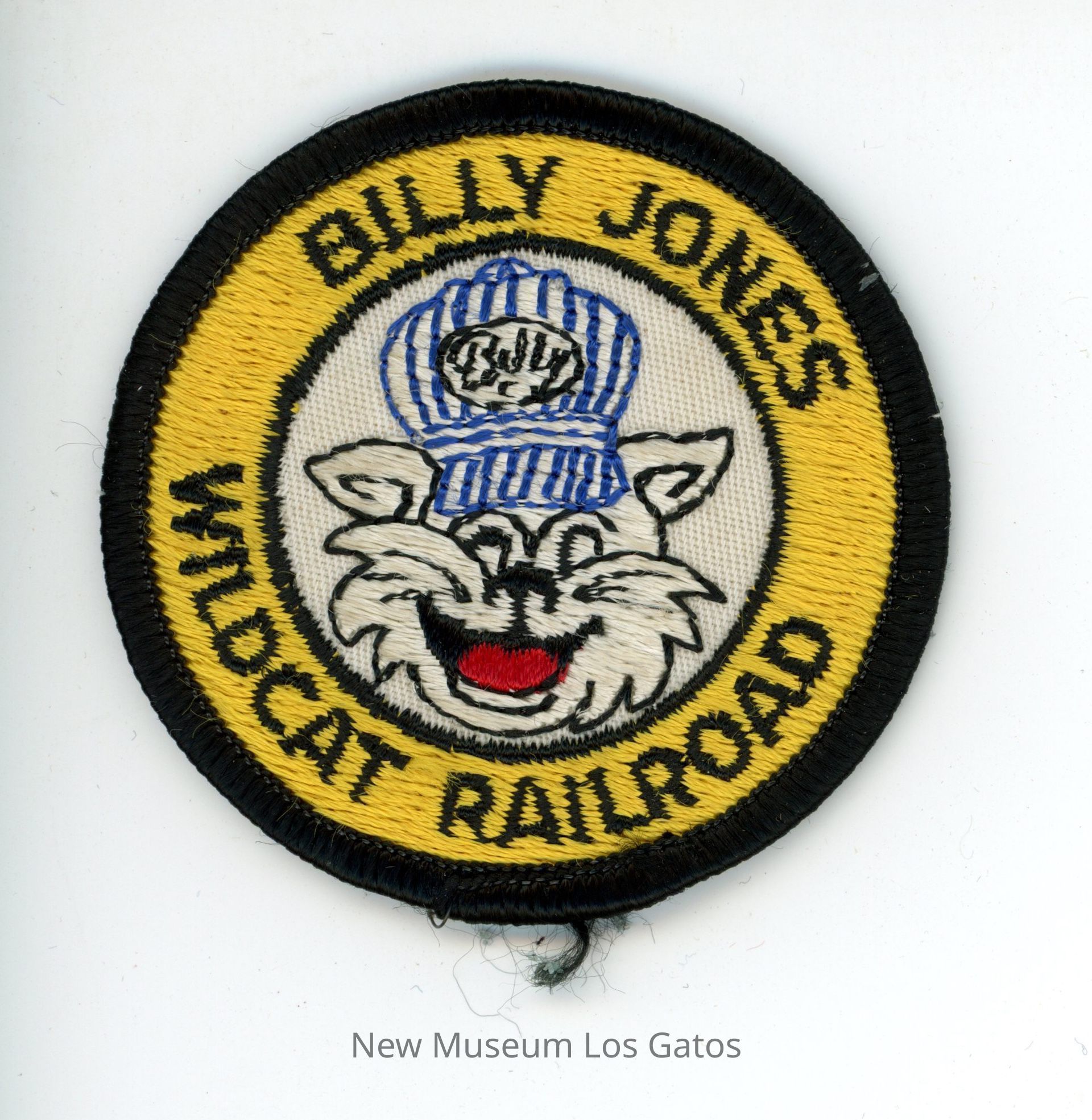 A circular, fabric patch for the Billy Jones Wildcat Railroad. The patch features an illustration of a cat wearing a railroad cap, inside a yellow circleCollection