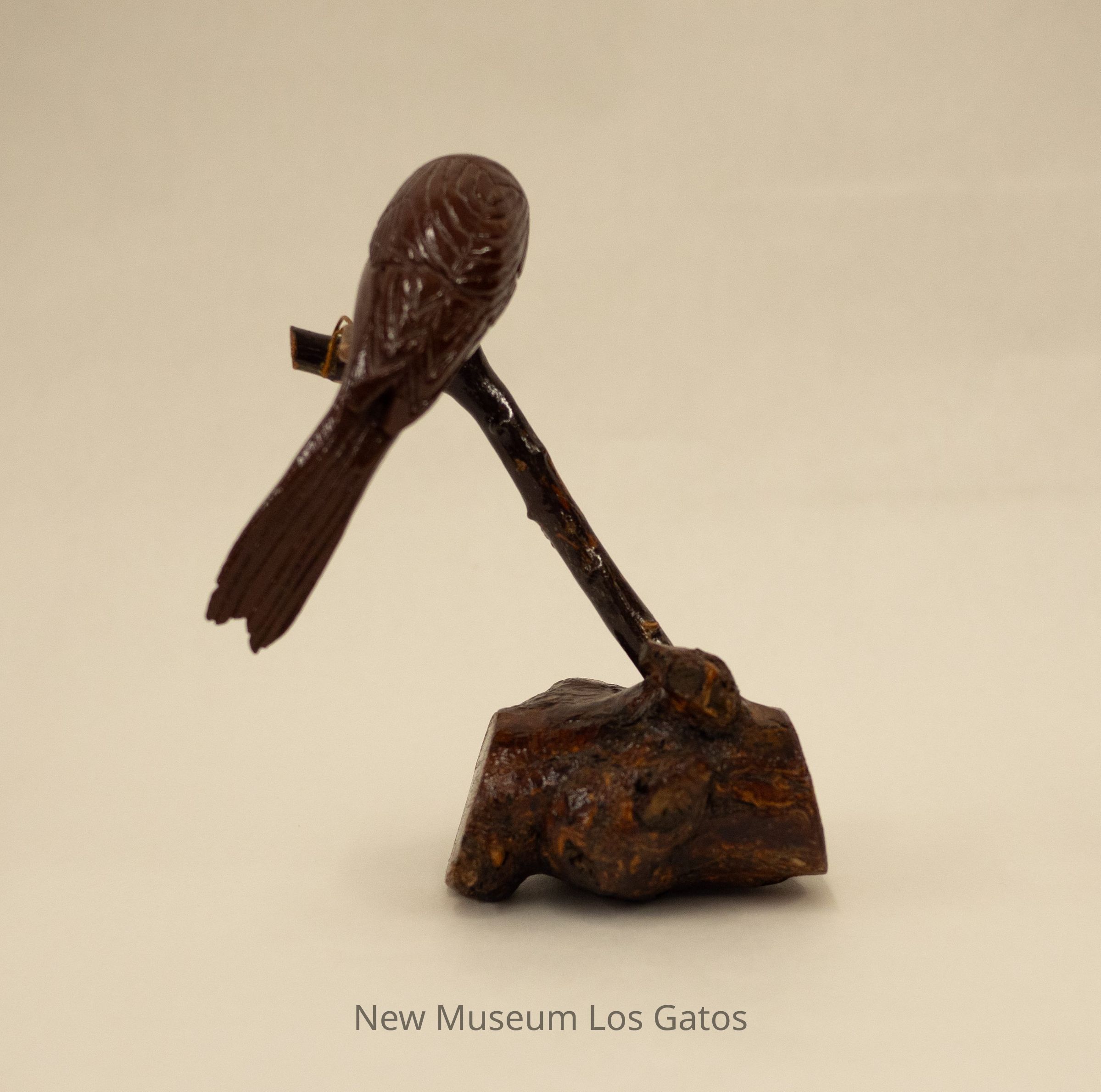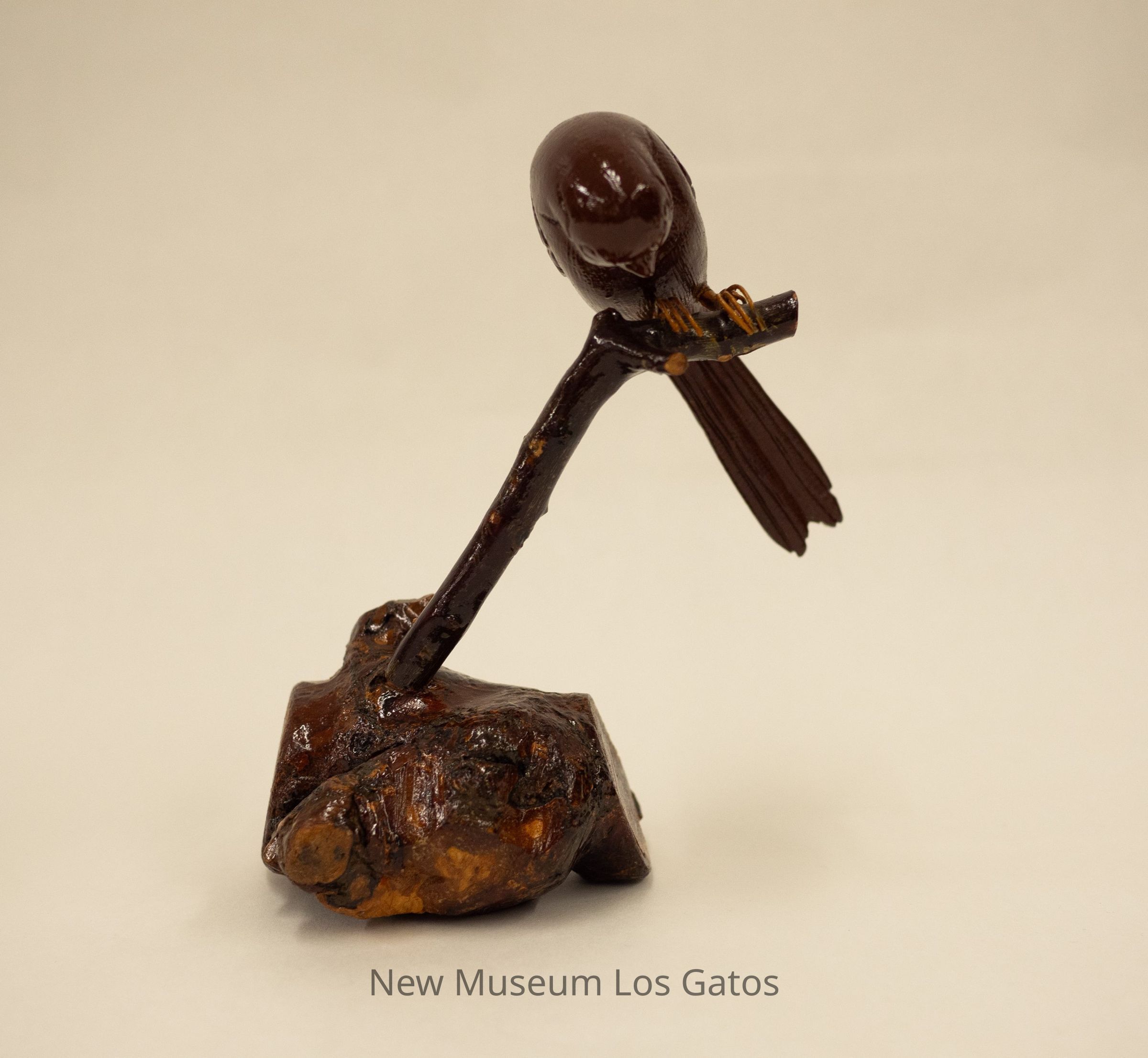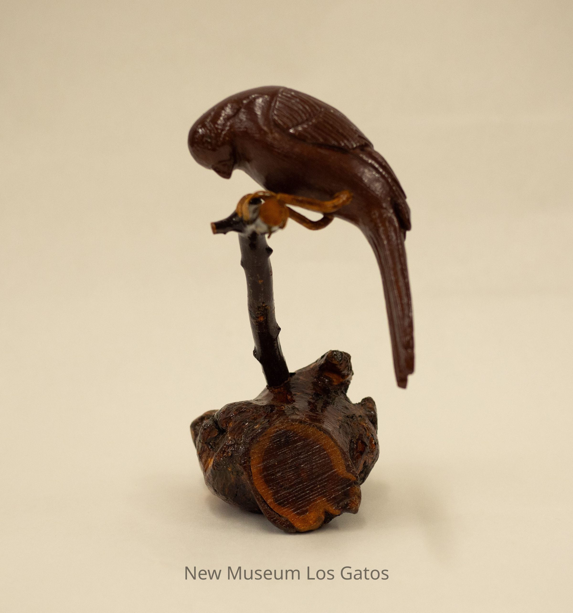 A dark brown hand-carved wooden sculpture of a bird perched over a stick that is standing up from a dark/mottled wooden base that looks like a log.Type of Sculpture