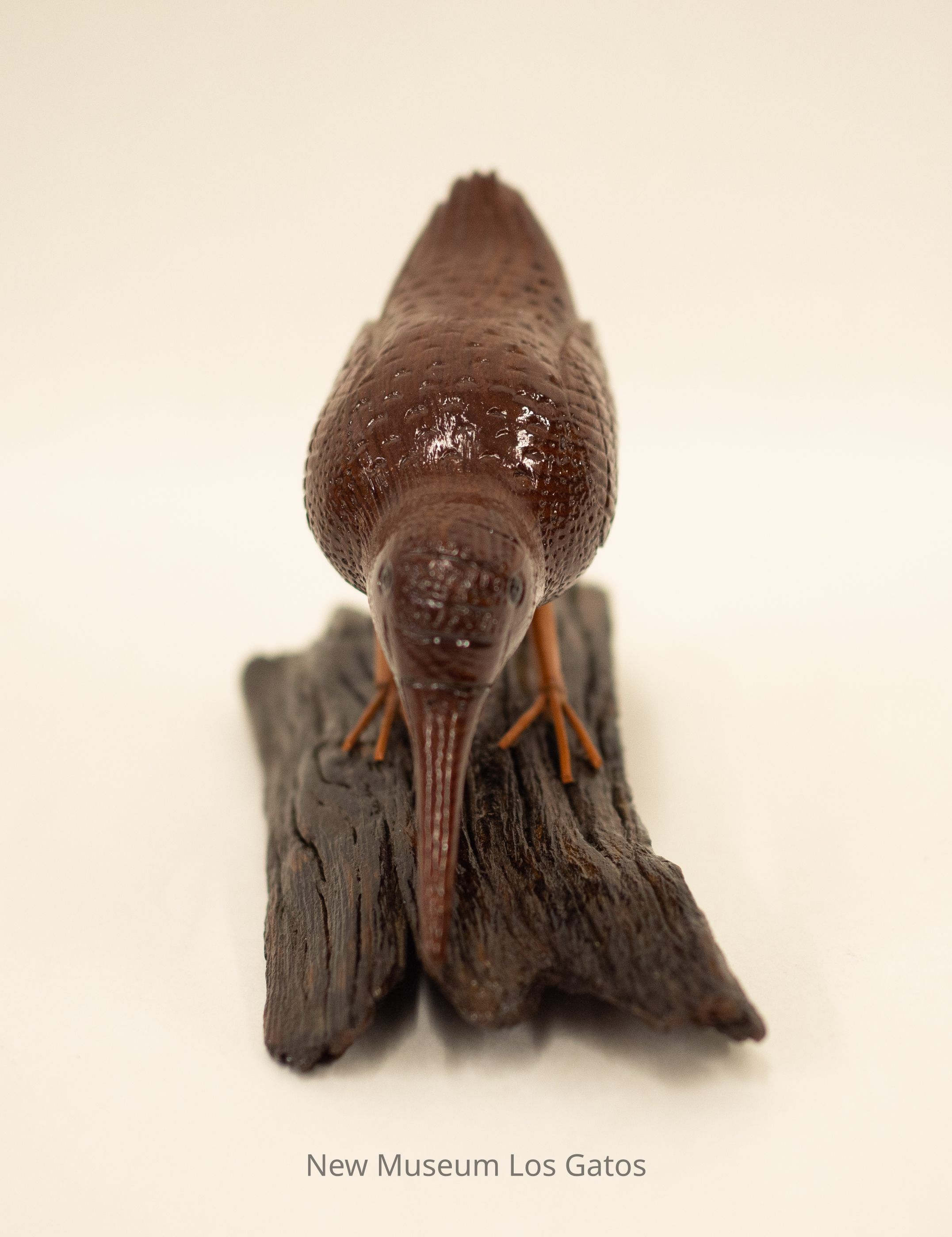 A reddish brown hand-carved wooden sculpture of a bird with a long beak, crouching forward on a dark wooden base.Type of Sculpture