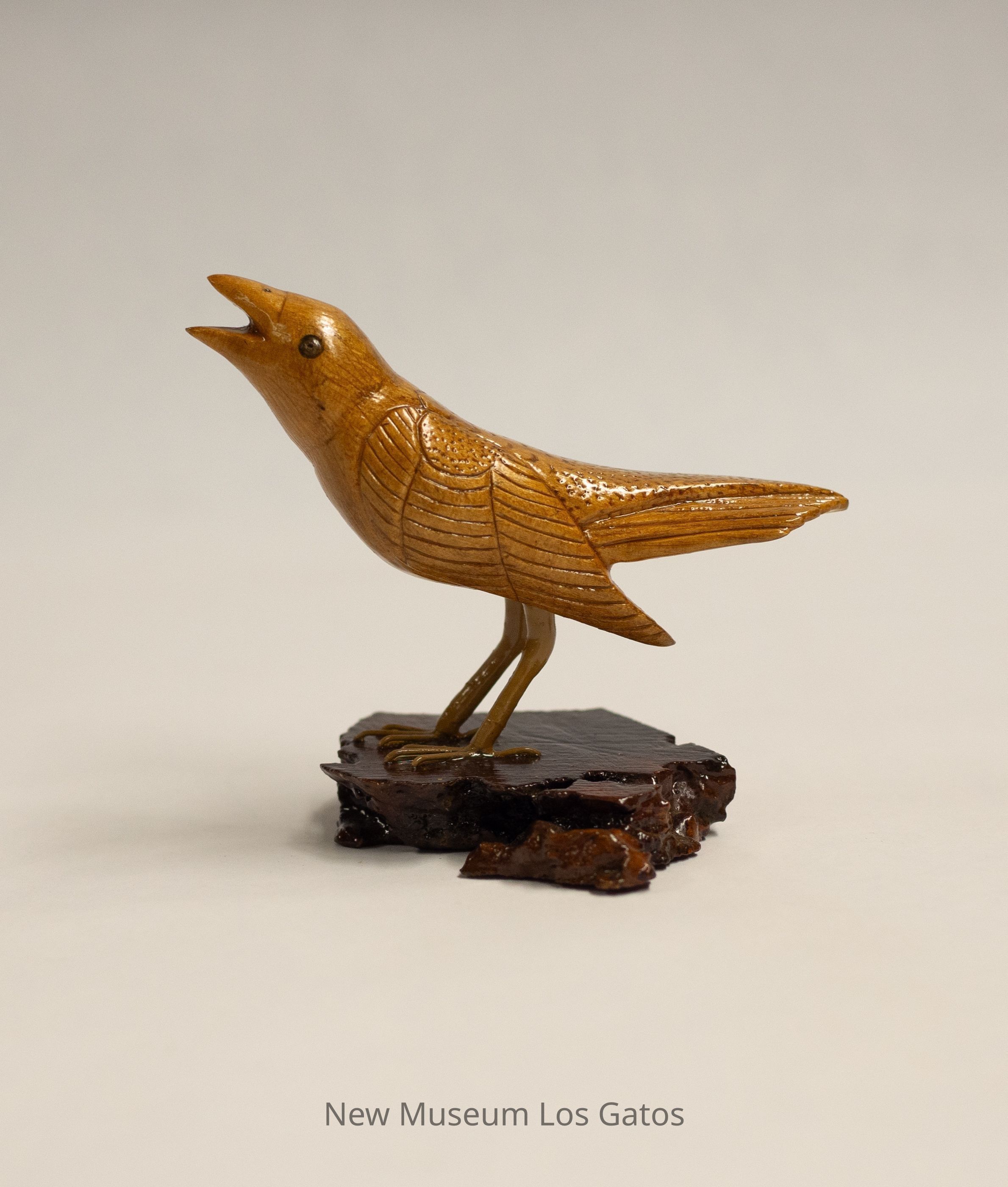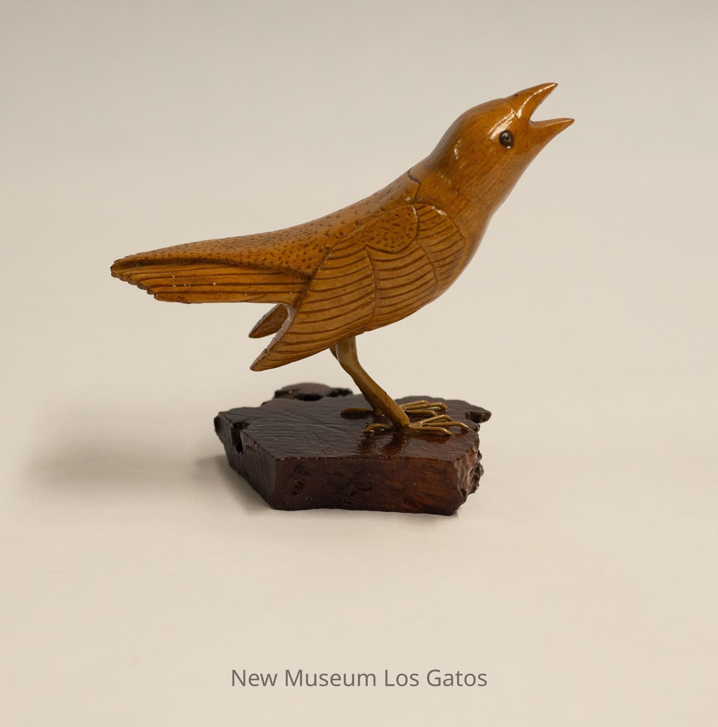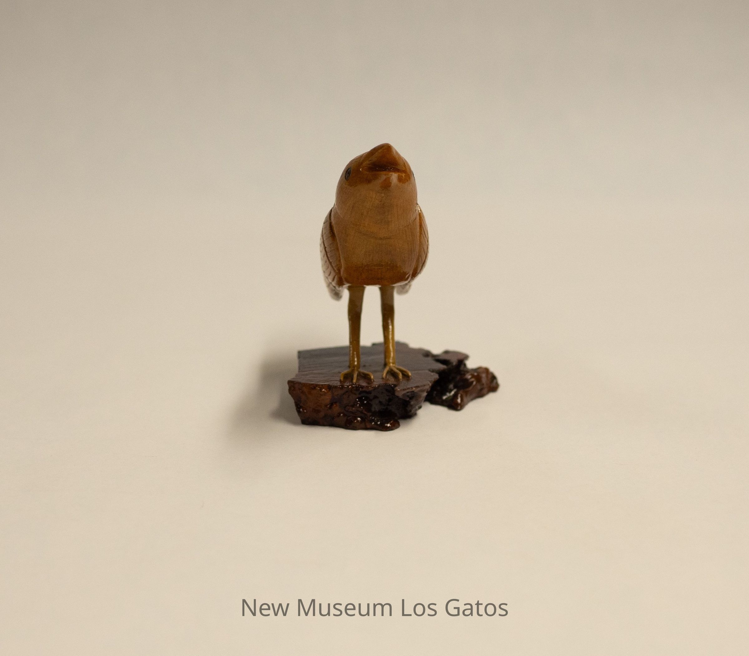 A small tan/light brown hand-carved wooden bird, standing on a dark reddish-brown base. The bird is slightly looking up, with its beak open.Type of Sculpture
