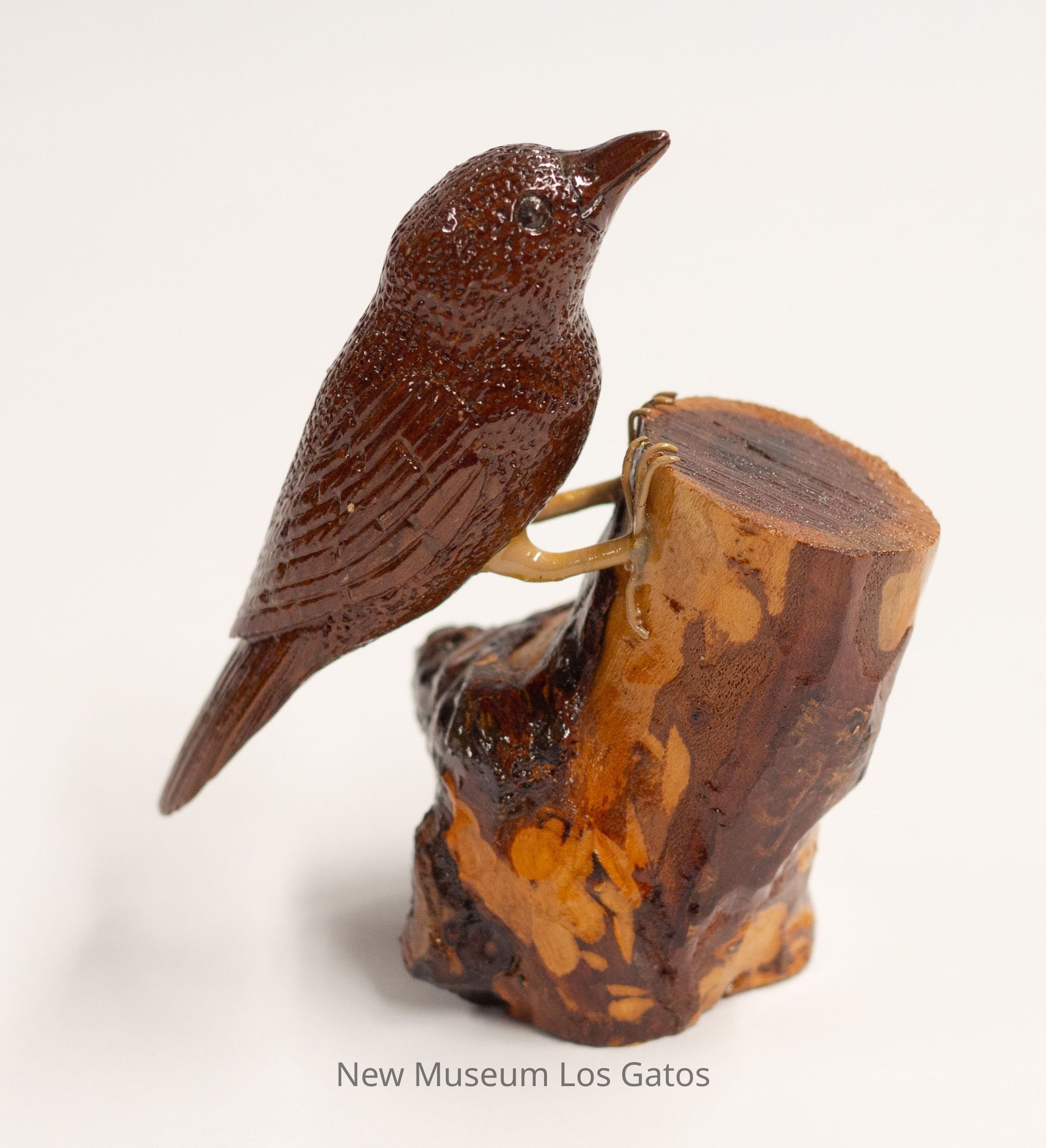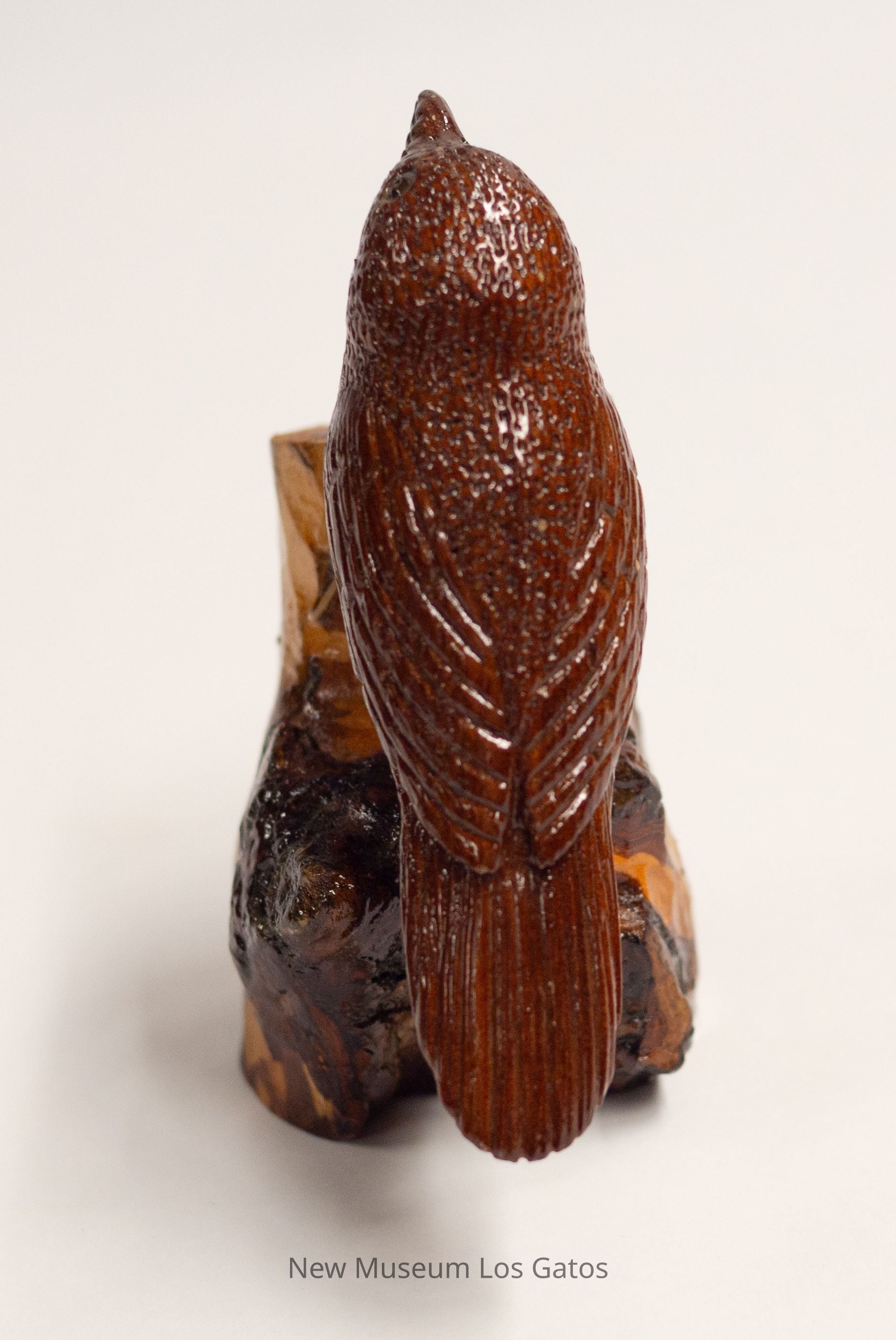 A dark reddish brown hand-carved wooden sculpture of a bird. The bird is perched on a stump that is mottled brown. The bird is looking up with beak closed.Type of Sculpture