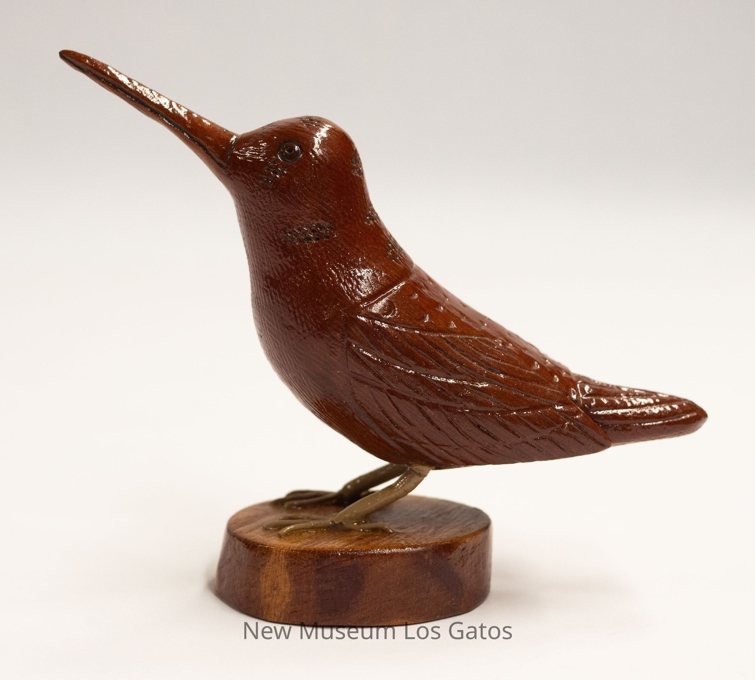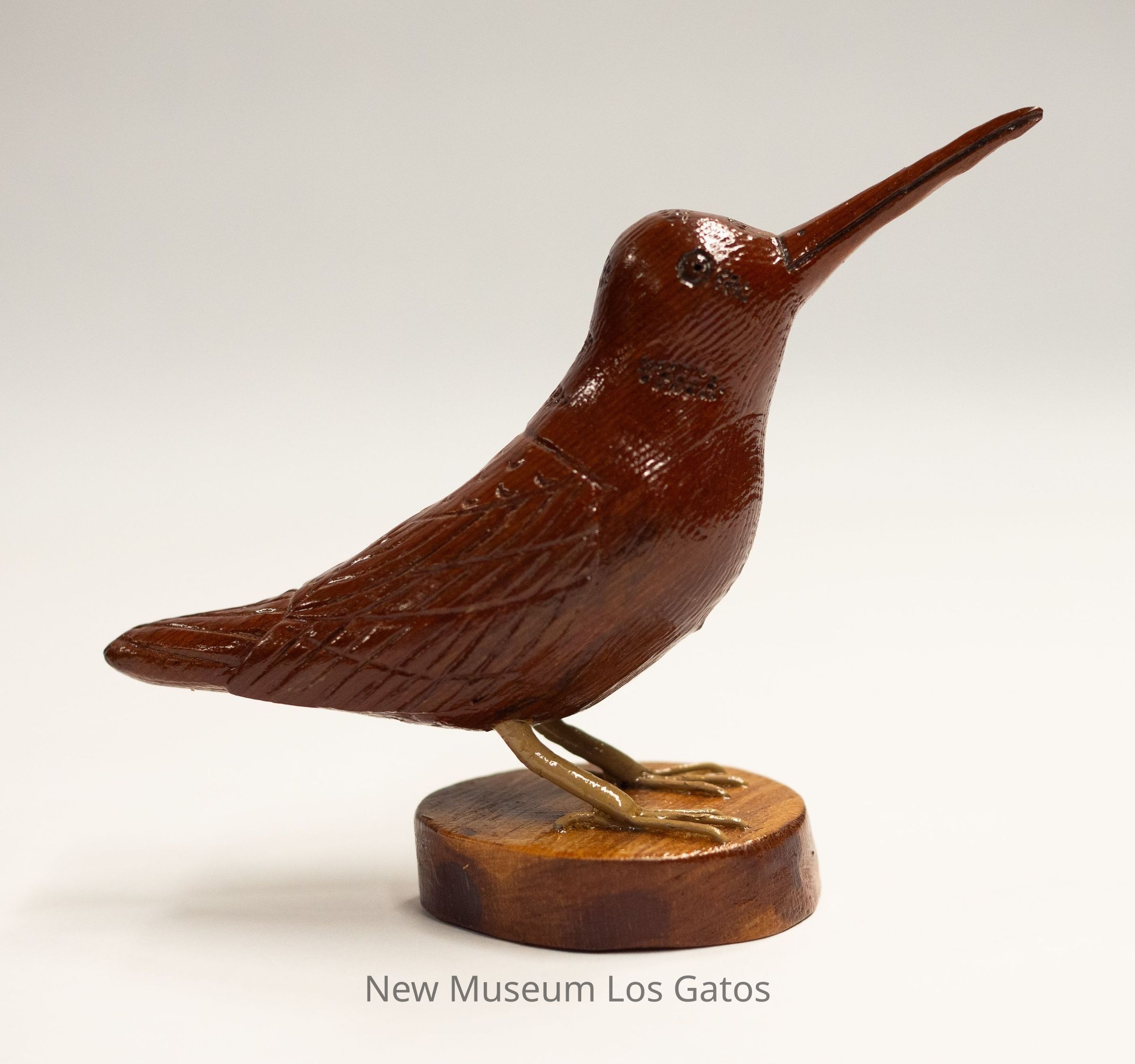 A dark reddish brown hand-carved wooden sculpture of a bird, with dull yellow legs, on a light brown circular base. The bird's head is angled upwards, with beak closed.Type of Sculpture