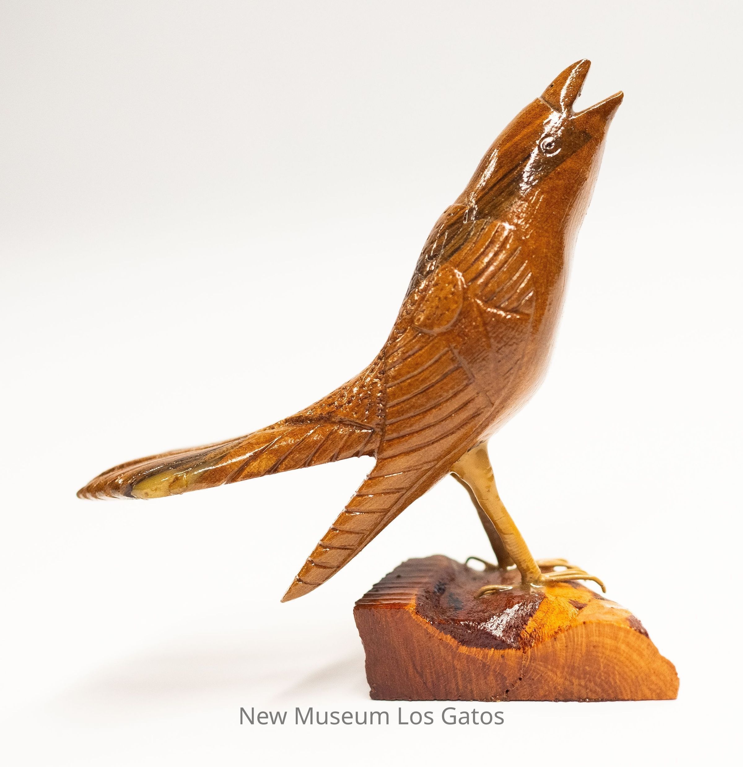 A dark yellow and brown hand-carved wooden sculpture of a bird, with yellow legs, on a red and yellow mottled base. The bird tail is horizontal, with the bird body angled upwards and to the right, with the beak open.Type of Sculpture