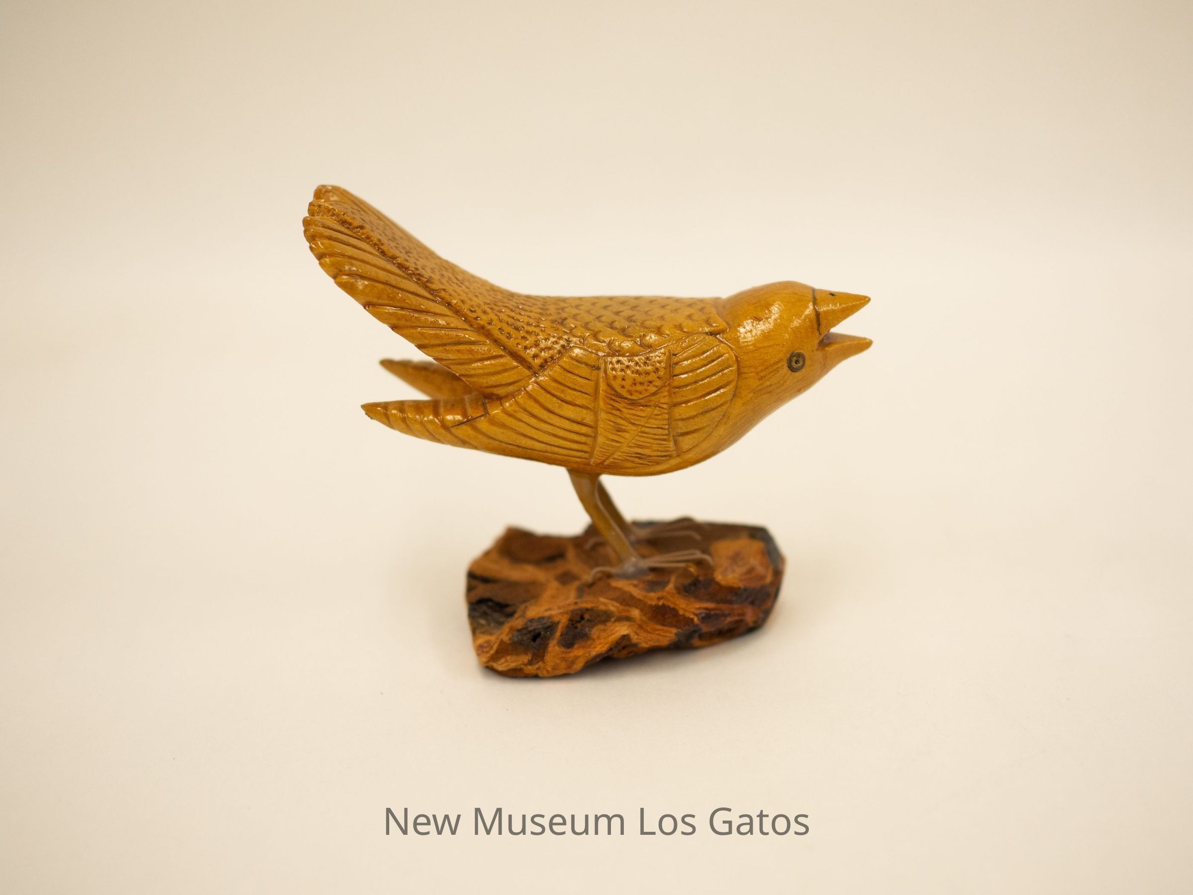 A light brown hand-carved wooden sculpture of a bird with an open mouth, crouched on a mottled wooden base.Type of Sculpture