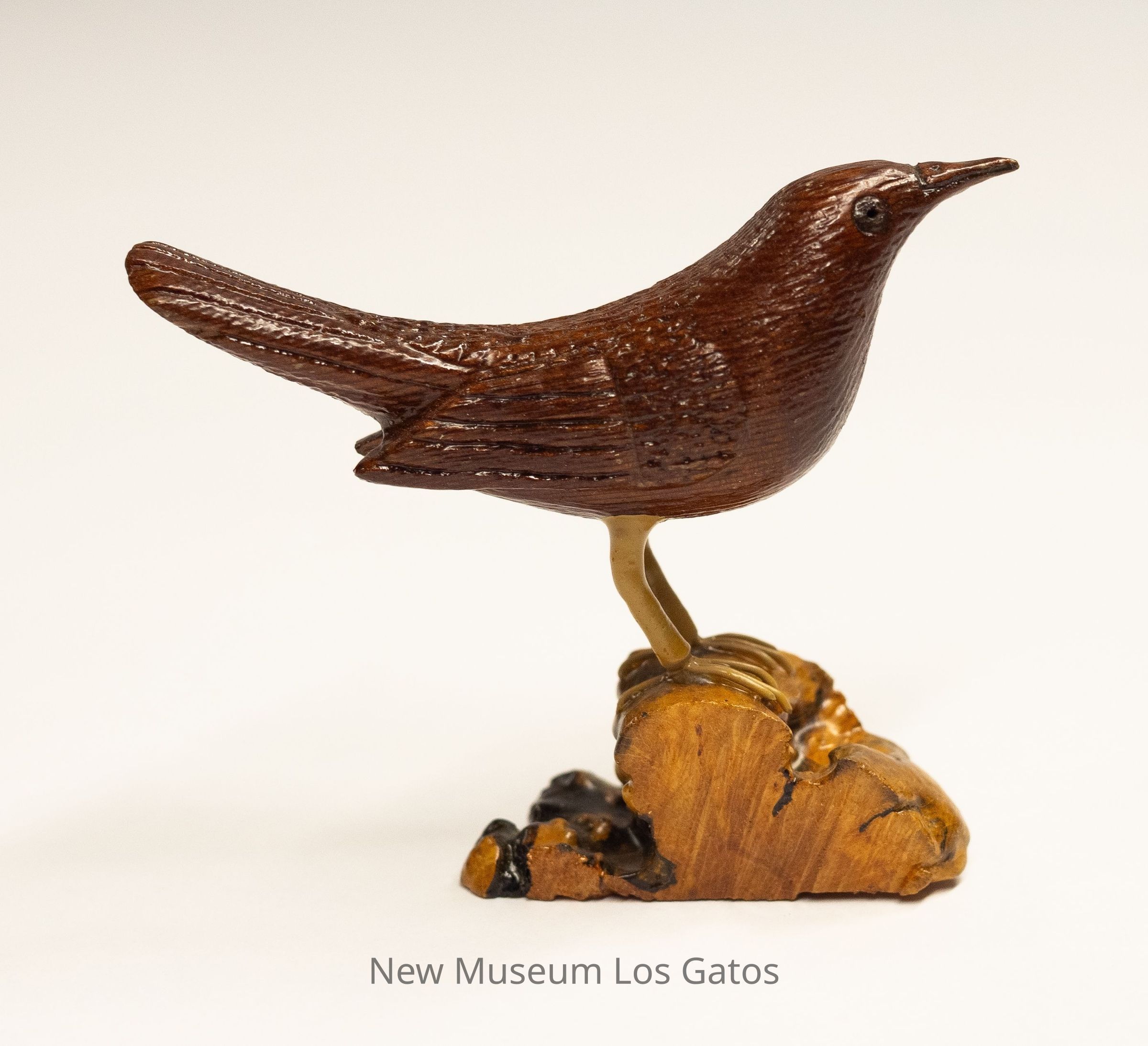 A dark reddish brown hand-carved sculpture of a small bird, with yellow legs and a yellow and black base. The bird's head and tail are angled upwards with beak closed.Type of Sculpture