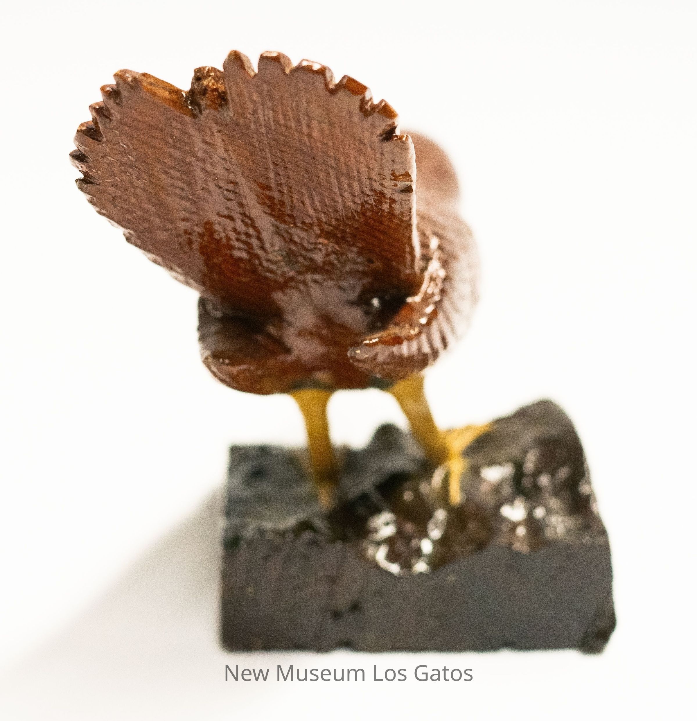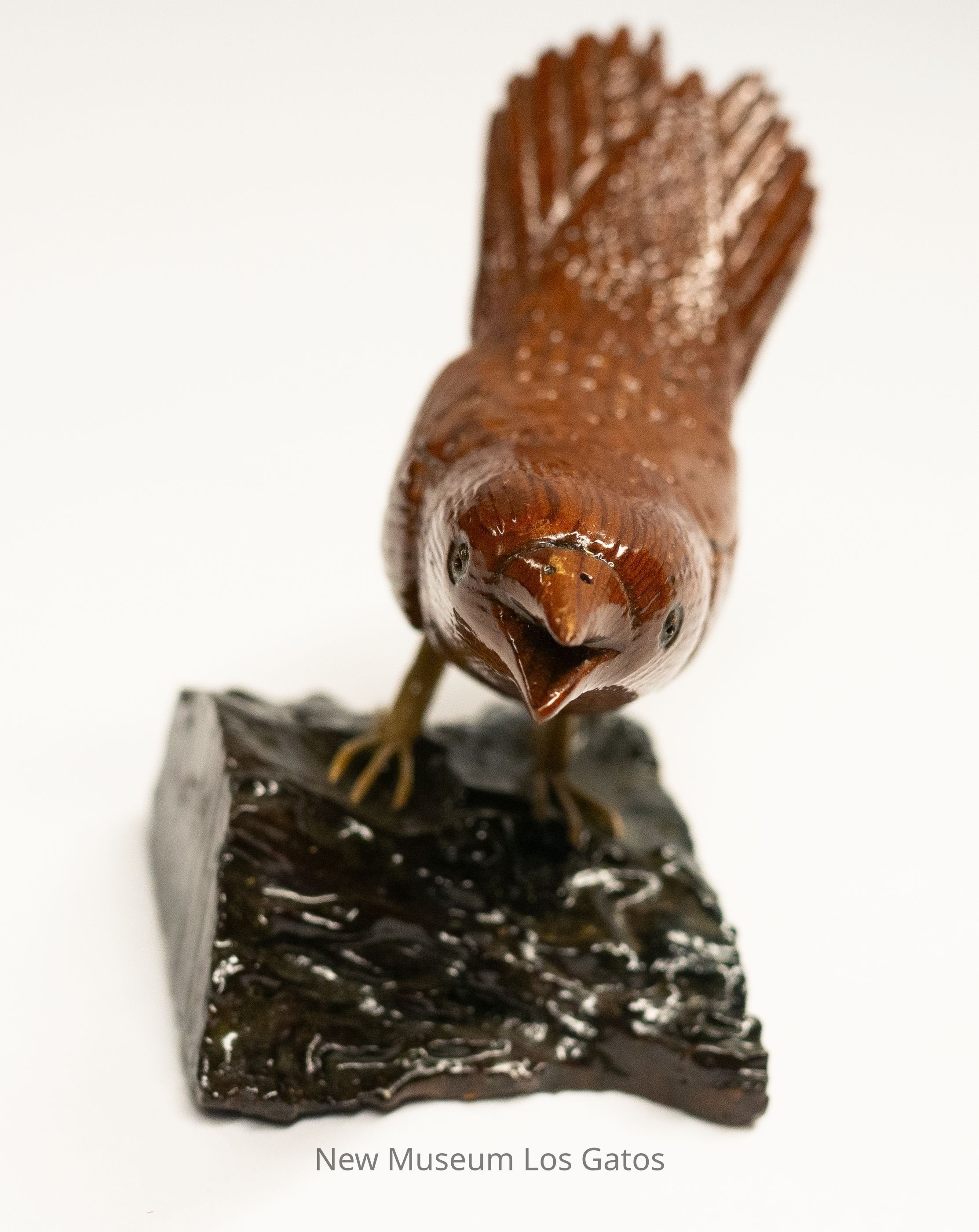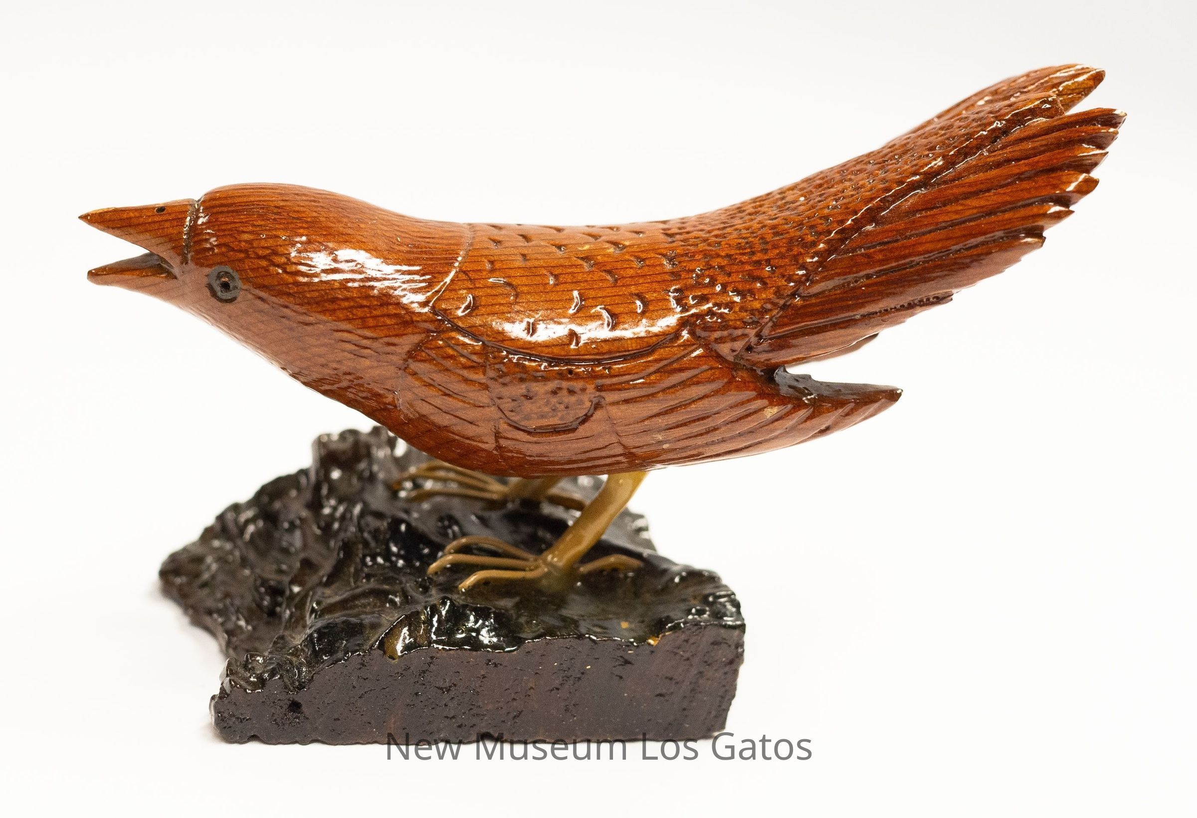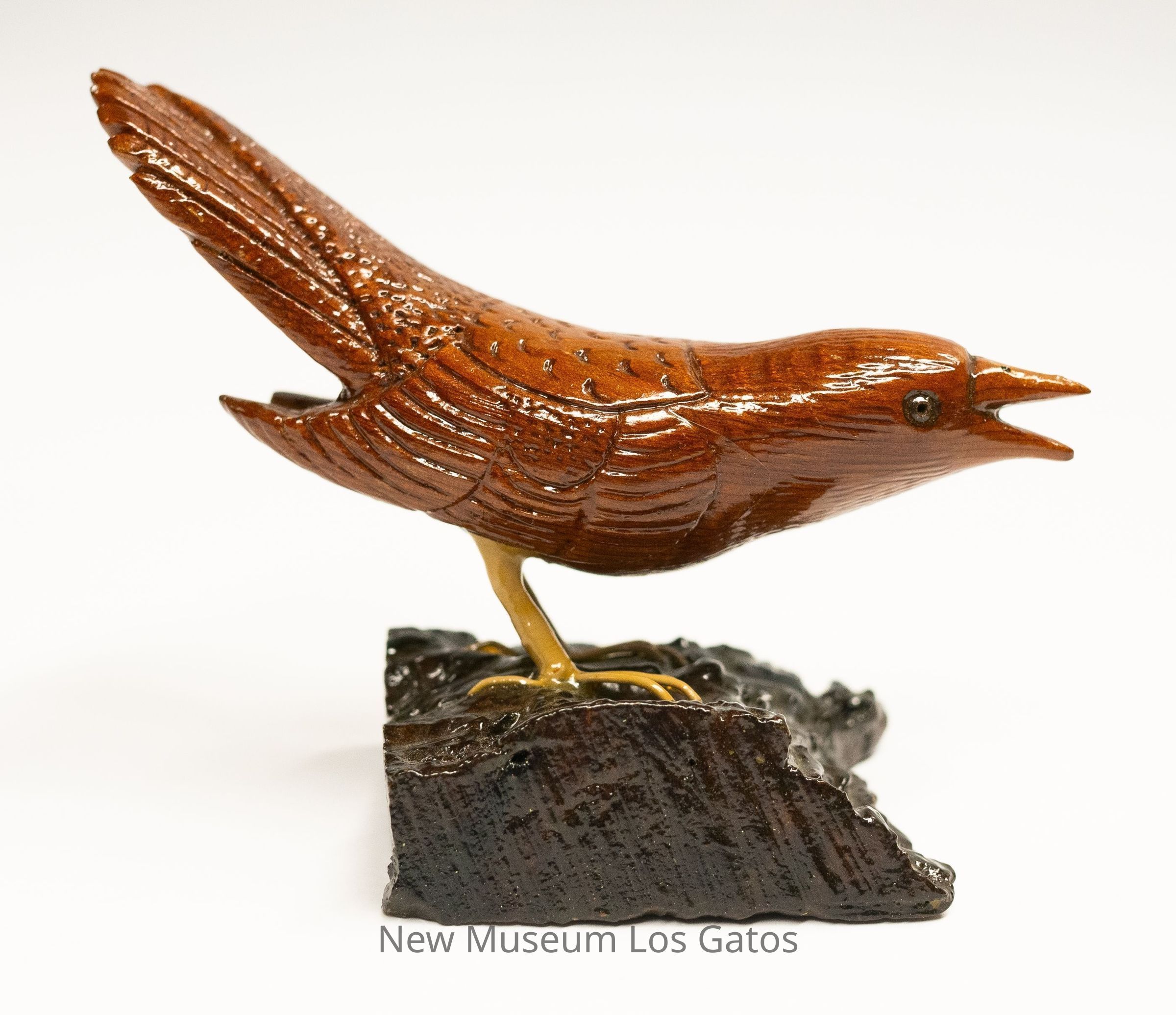 A reddish brown hand-carved wooden sculpture of a bird, with yellow legs, on a black base. The bird is crouched down, leaning to the right, with tail angled upwards and beak open.Type of Sculpture
