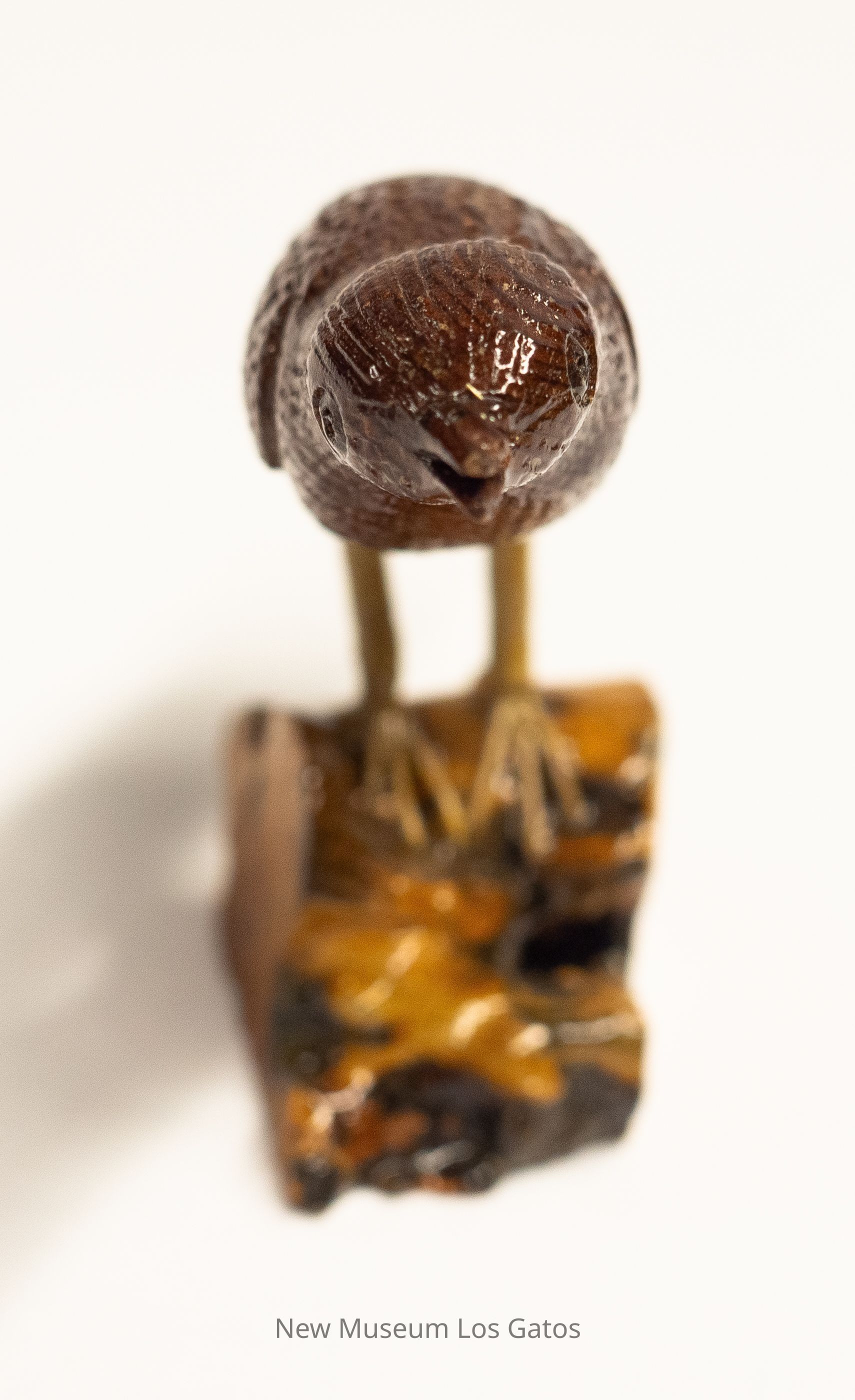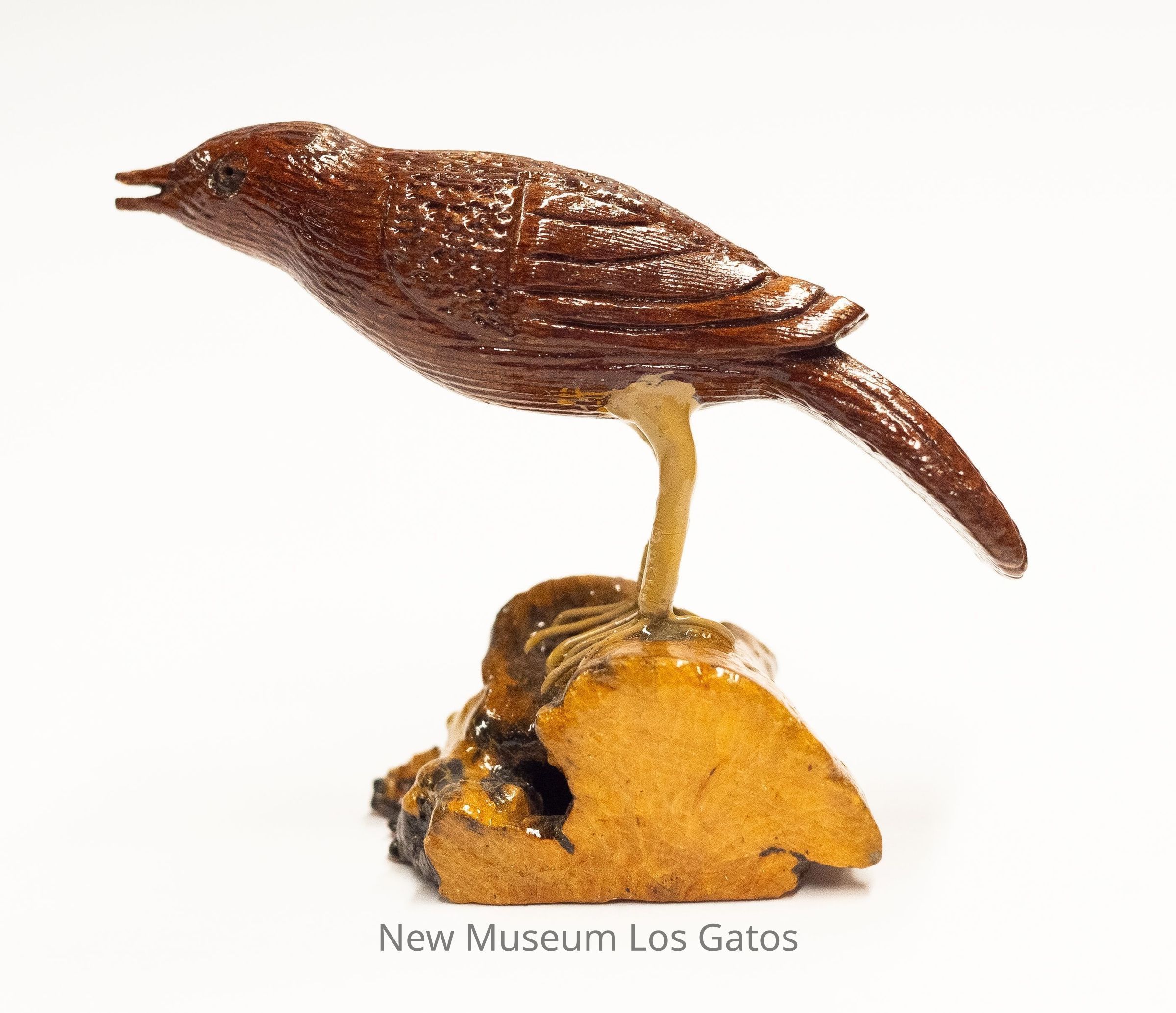 A dark reddish brown hand-carved wooden sculpture of a small bird, with yellow legs on a mottled yellow and brown base. The bird body is angled forward and leaning to the left, the tail is angled downward, and the beak is open.Type of Sculpture