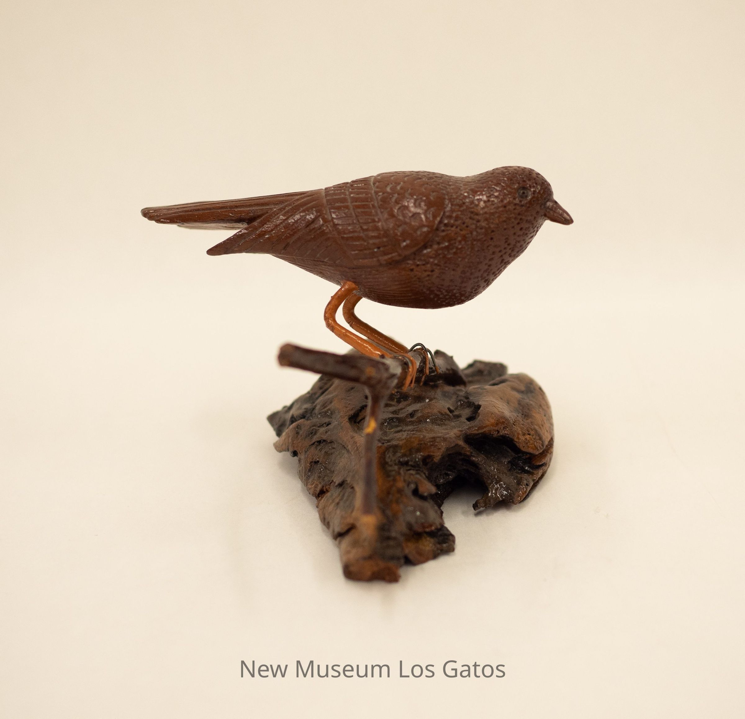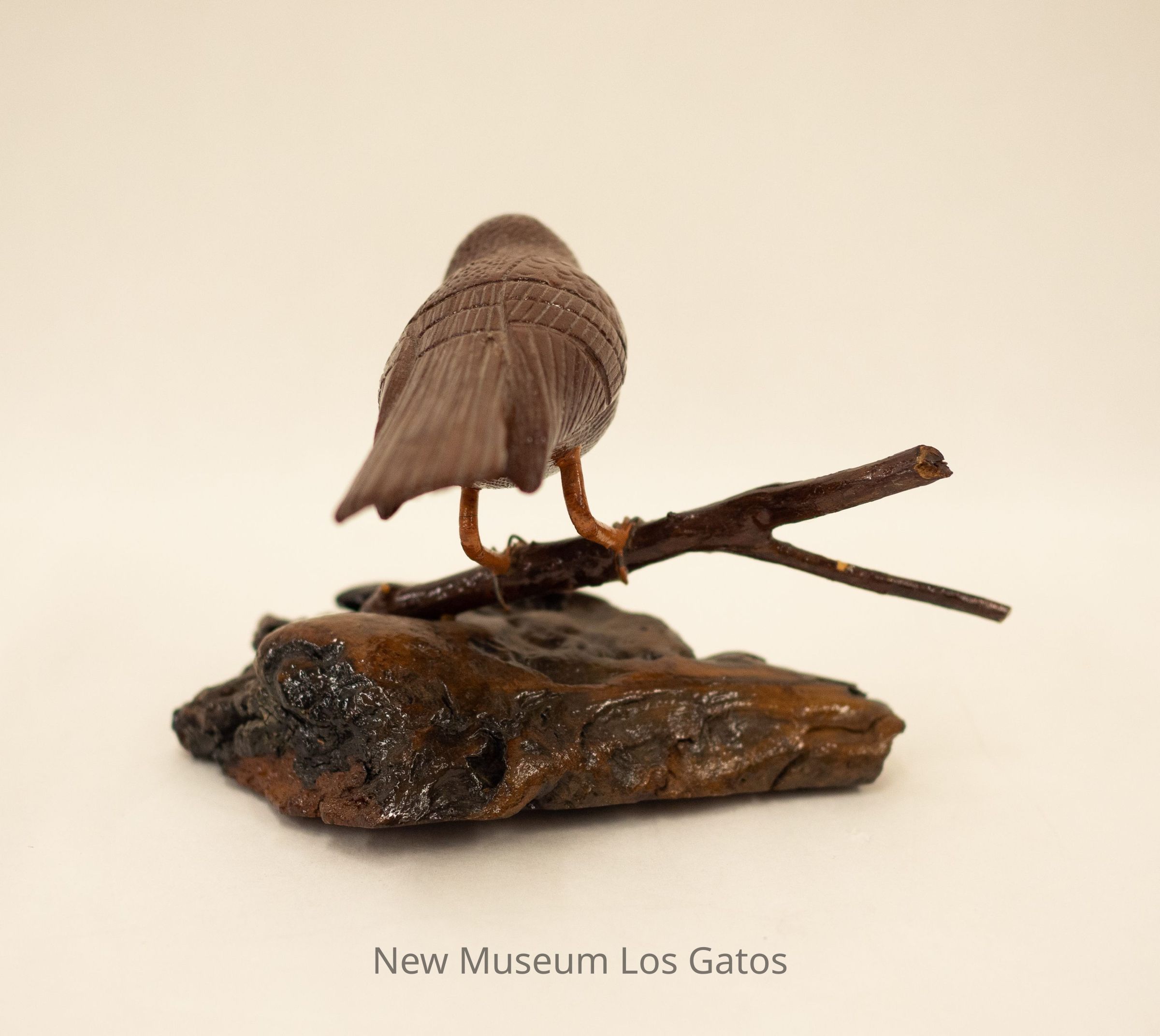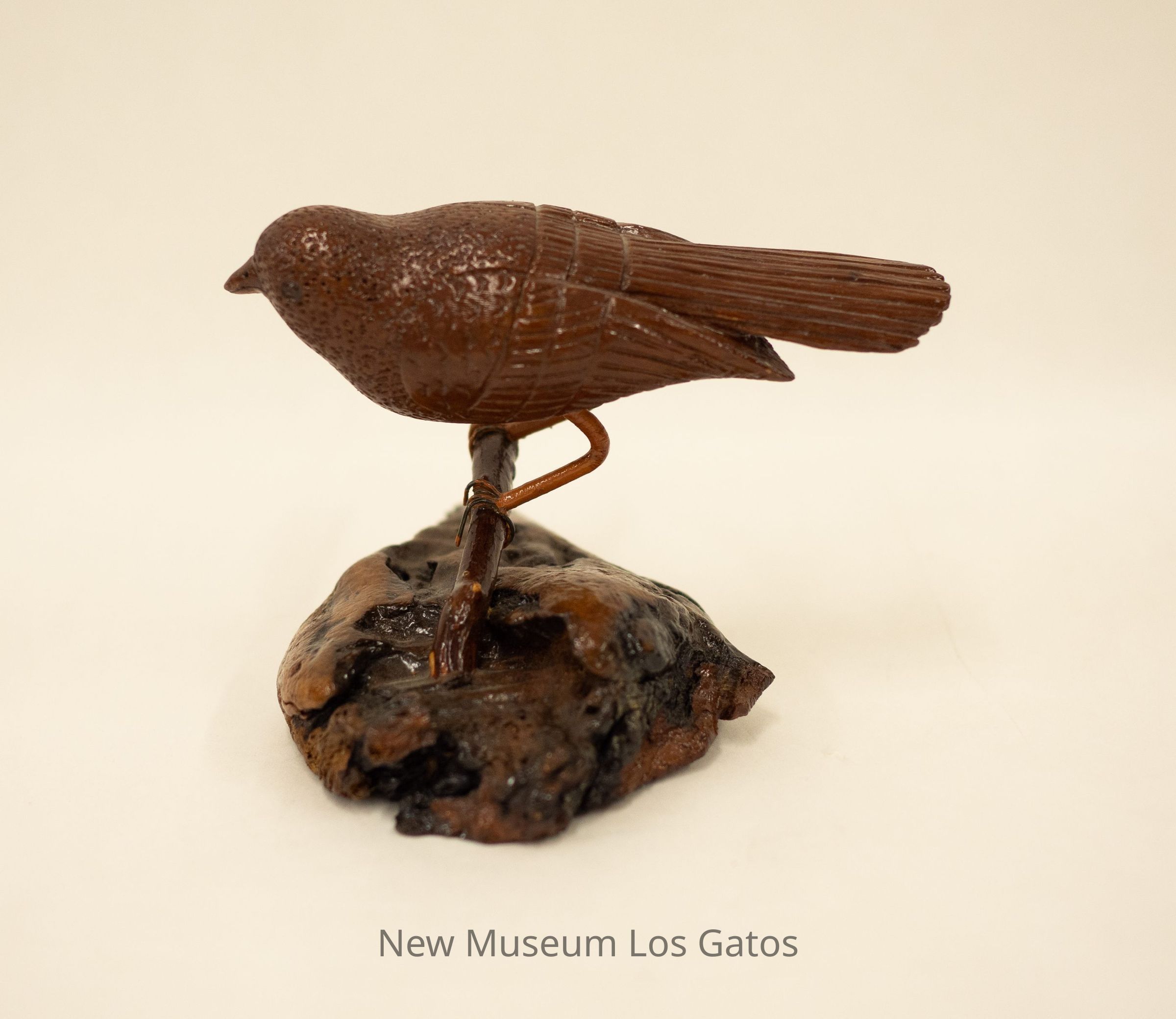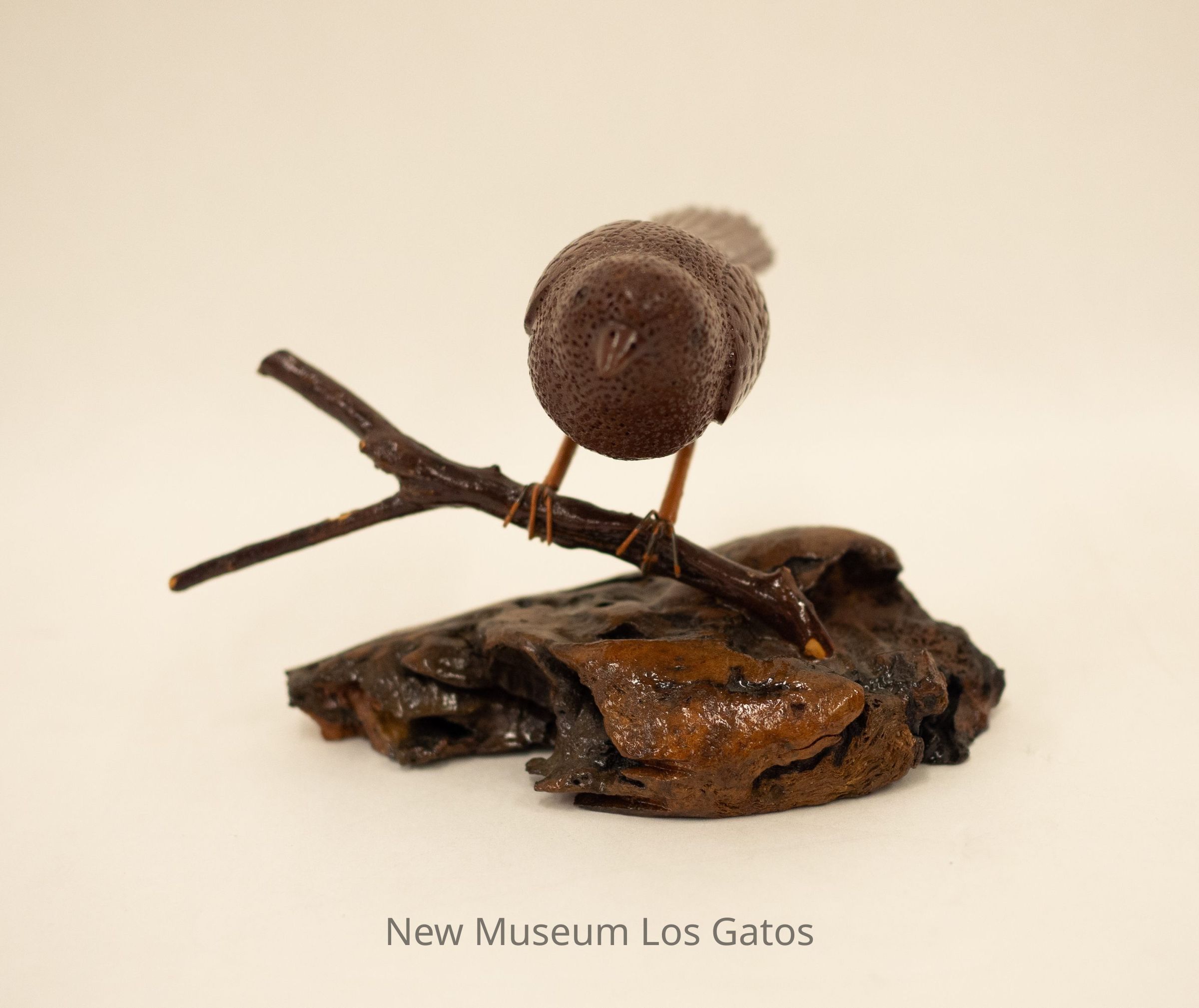 A hand-carved wooden sculpture of a dark brown bird perched on a branch that is attached to a wooden base.Type of Sculpture