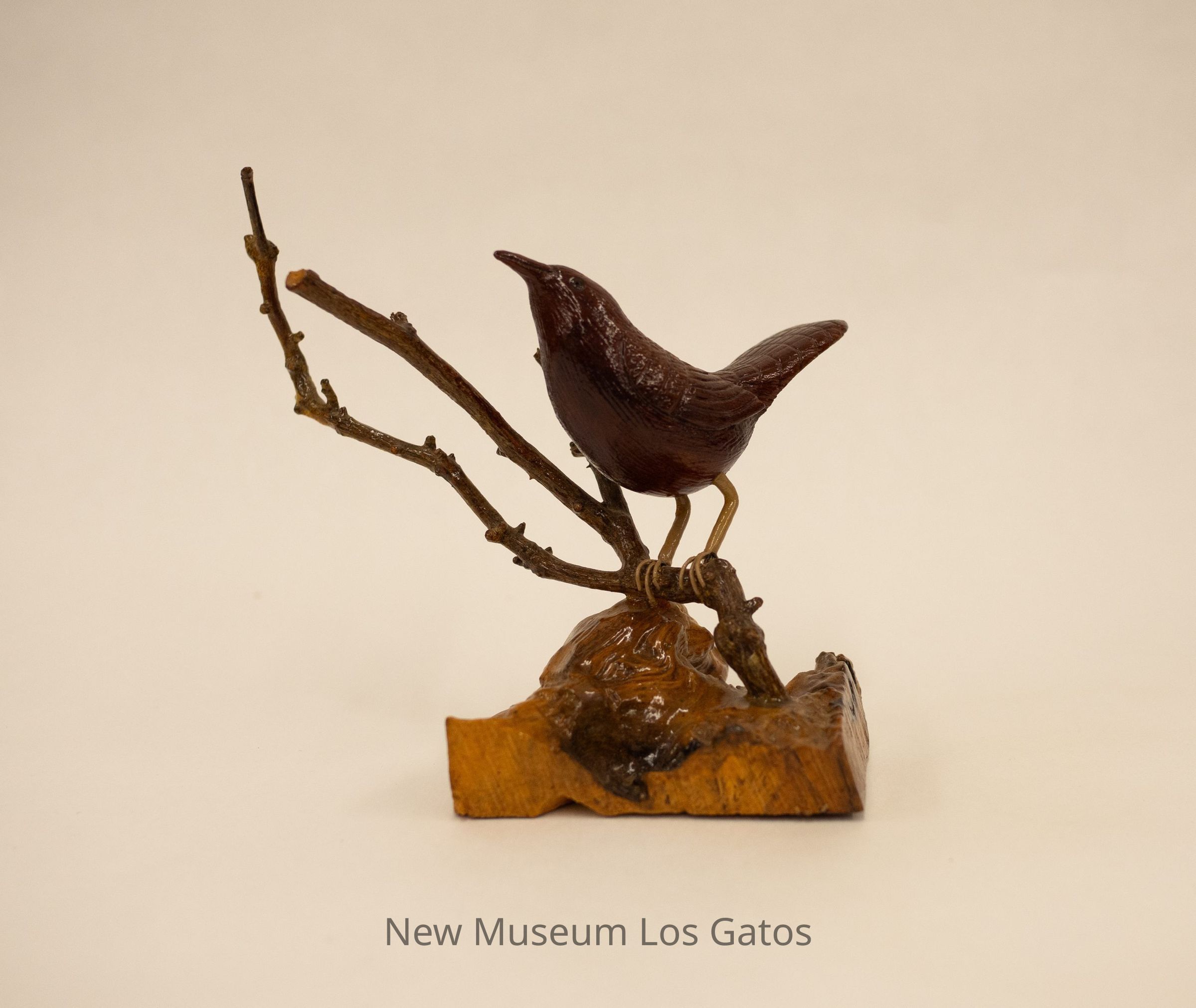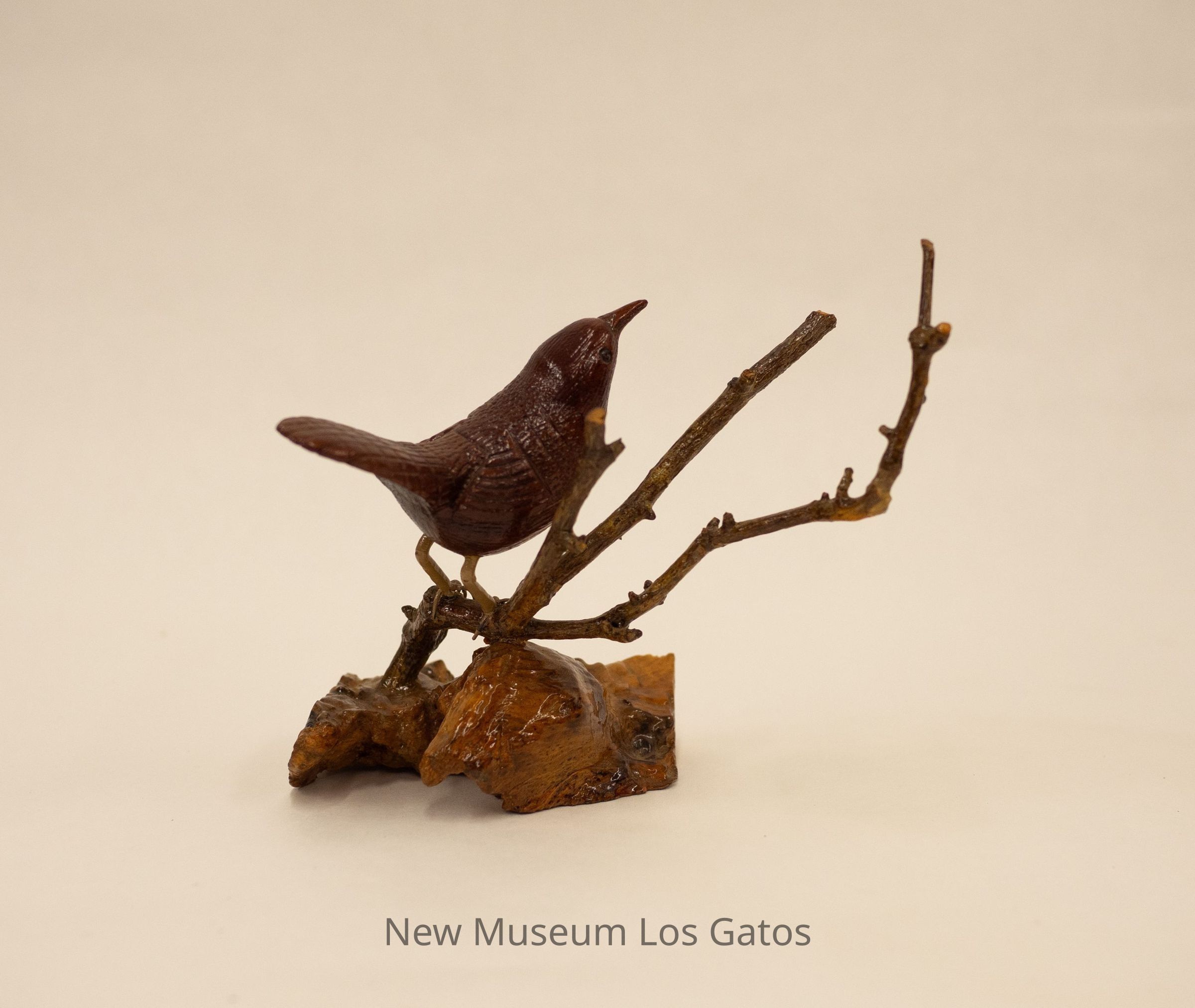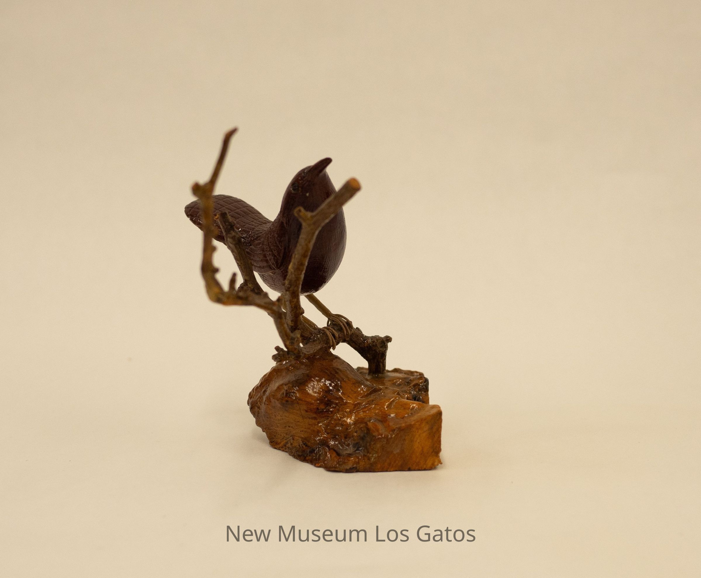 A dark brown hand-carved wooden sculpture of a bird perched on a thin stick that branches out into three parts, which is coming out of a lighter brown/mottled wooden base.Type of Sculpture