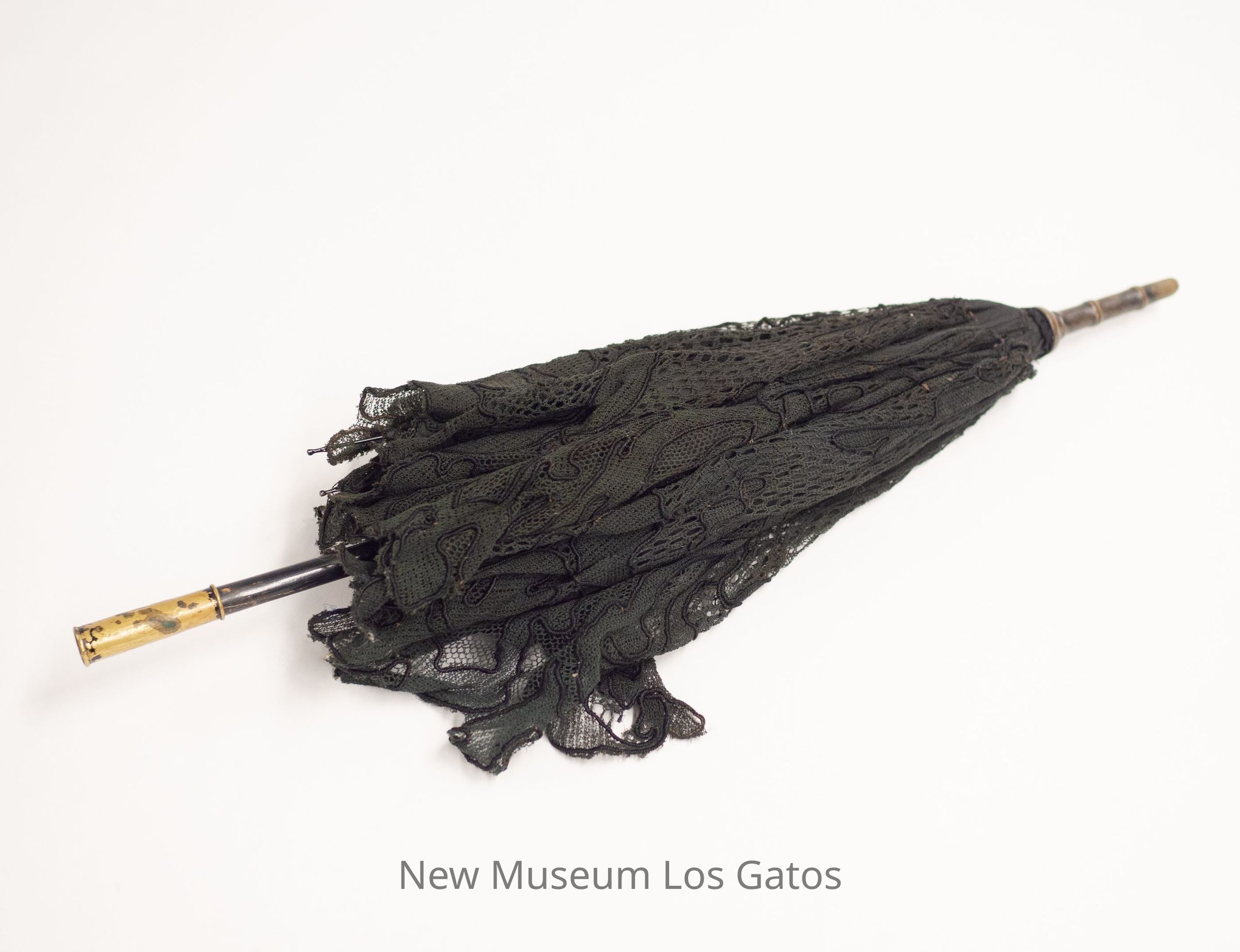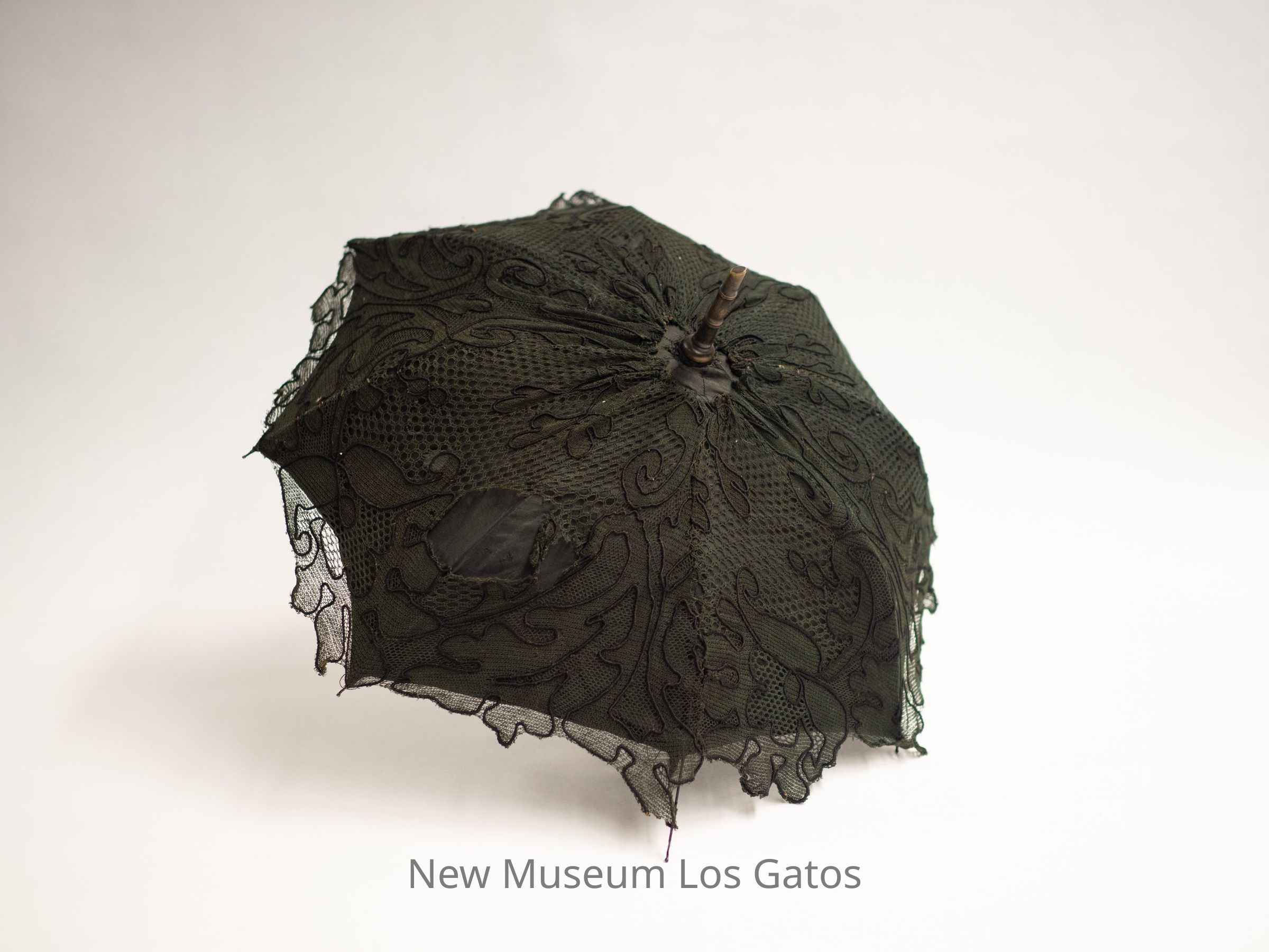 A small black umbrella with chantilly lace, and a short metal tip. The inner lining is black. The handle is designed to be foldable, but is missing the lower section of the shaft.Collection