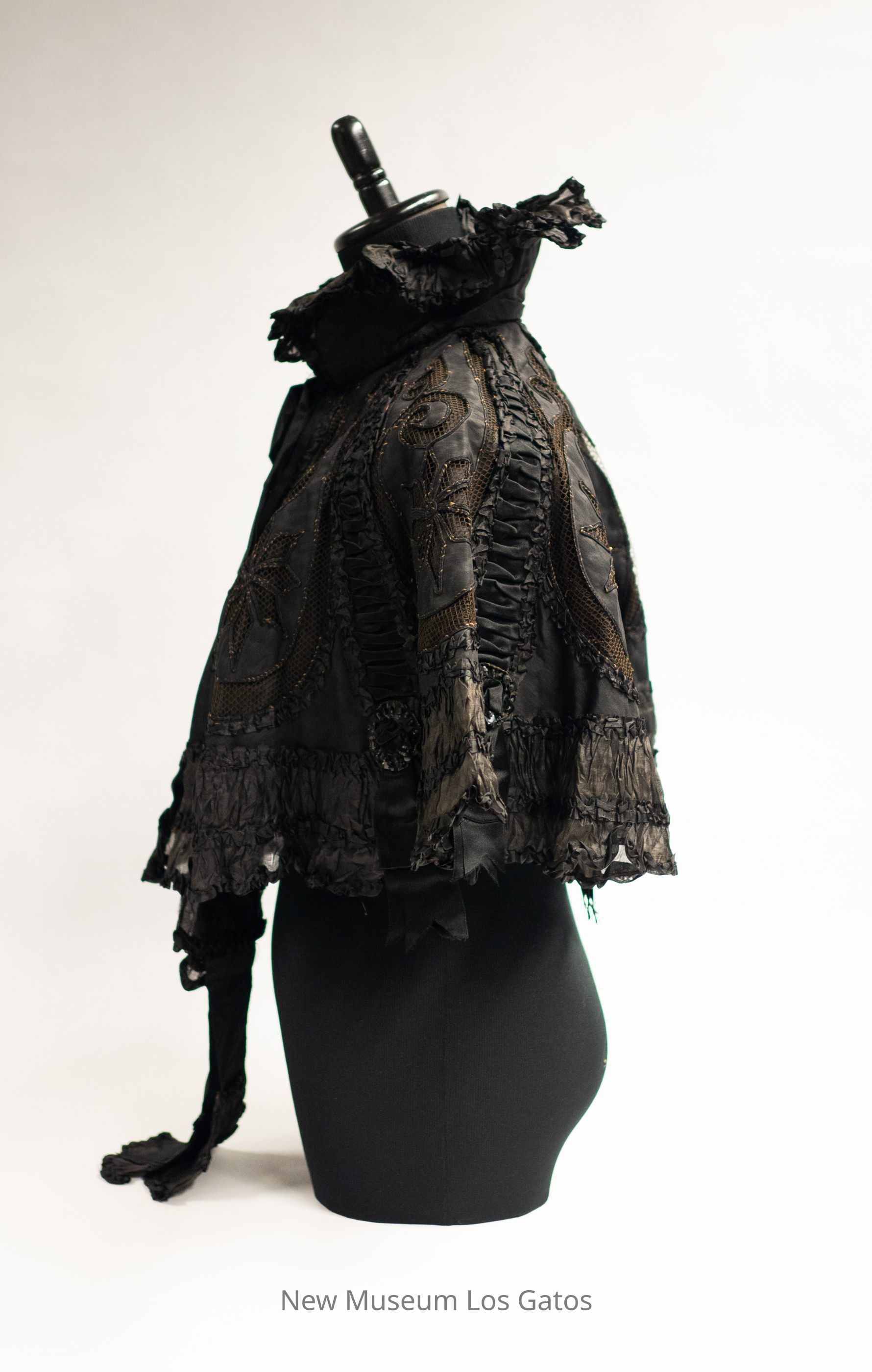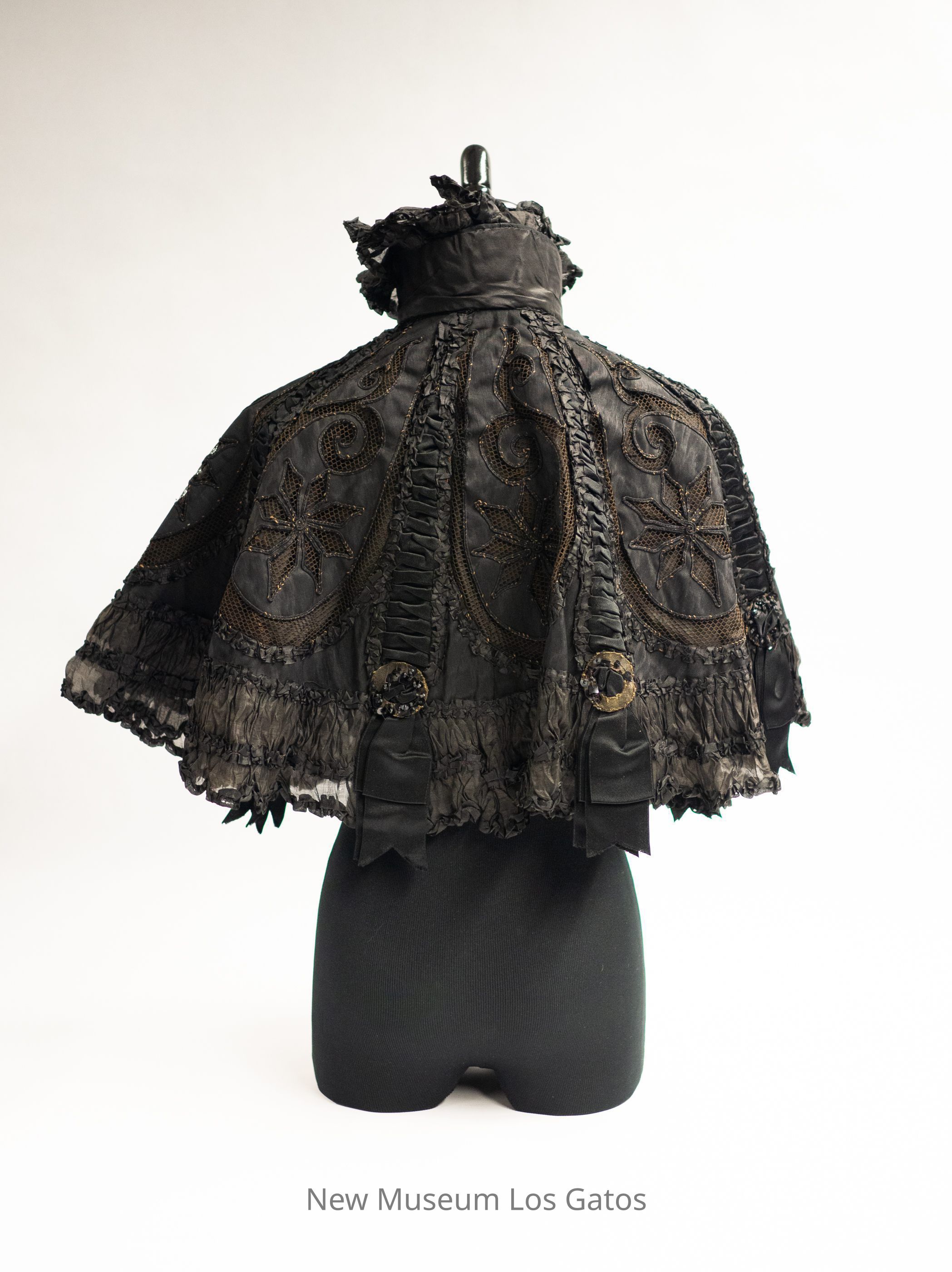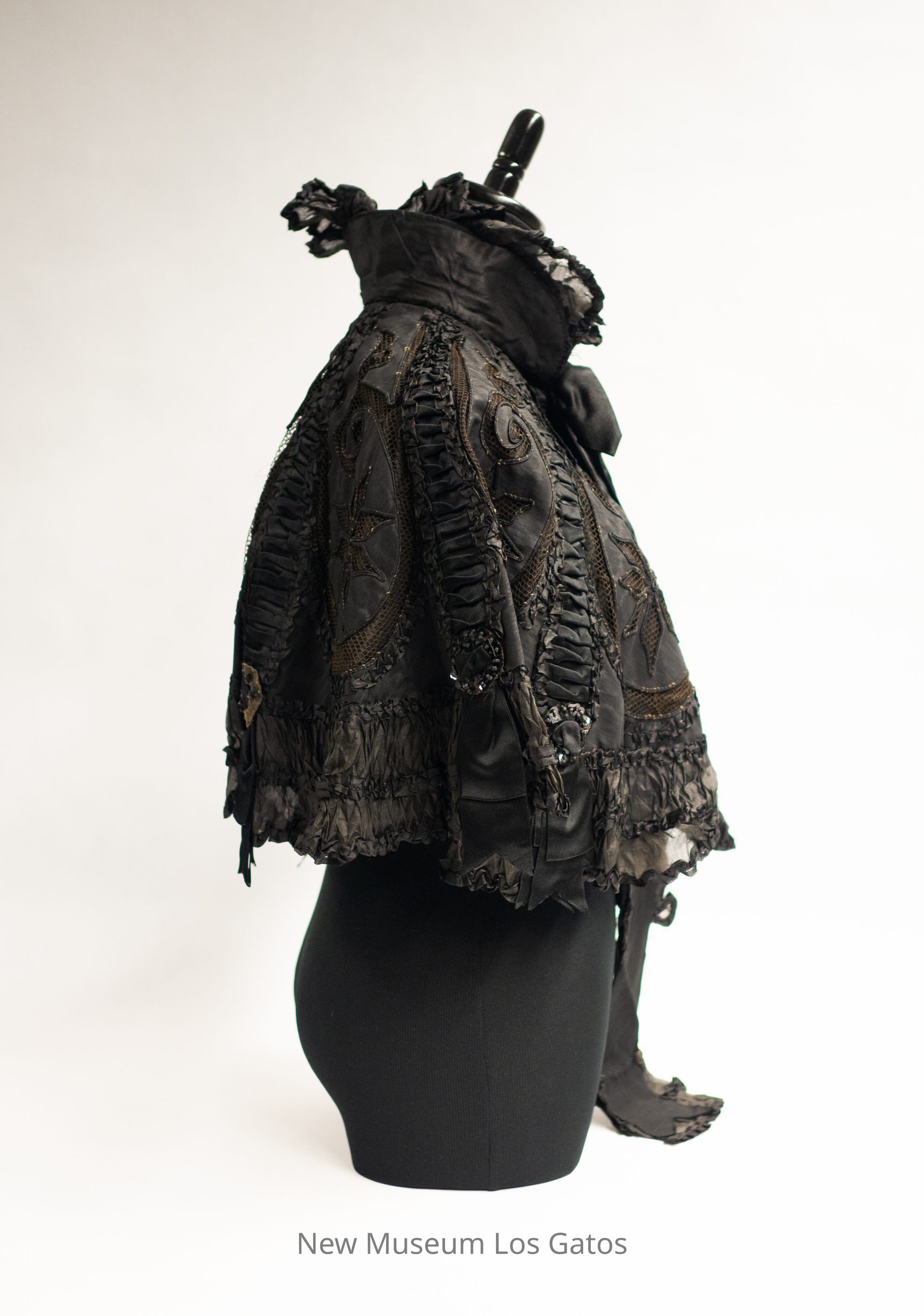 A black silk mantle with a ruffled collar. The cape has ruffle detailing along the bottom hem, as well as in numerous vertical lines throughout the mantle. There are black sequin details and black ribbon at the ends of those vertical ruffles, with black silk flowers over black netting in between the ruffles.Collection