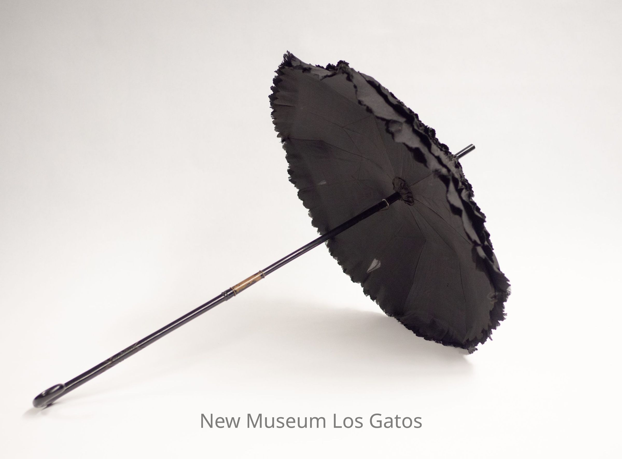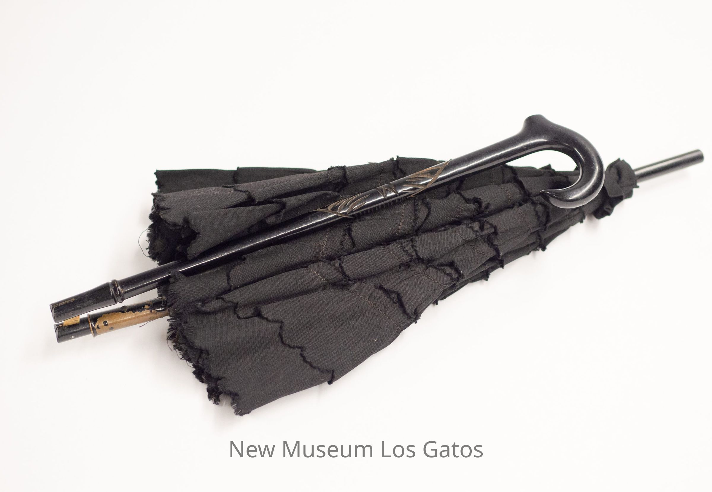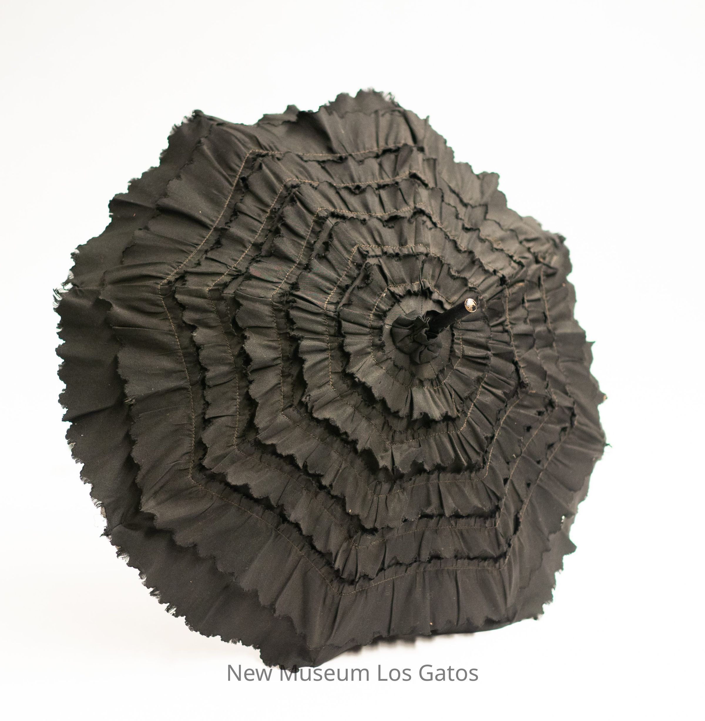 A small black parasol with gathered silk ruffles on the exterior of the umbrella. The thin black shaft has a curved handle. There are geometric etchings on the shaft, near the handle. The umbrella shaft is also able to fold.Collection