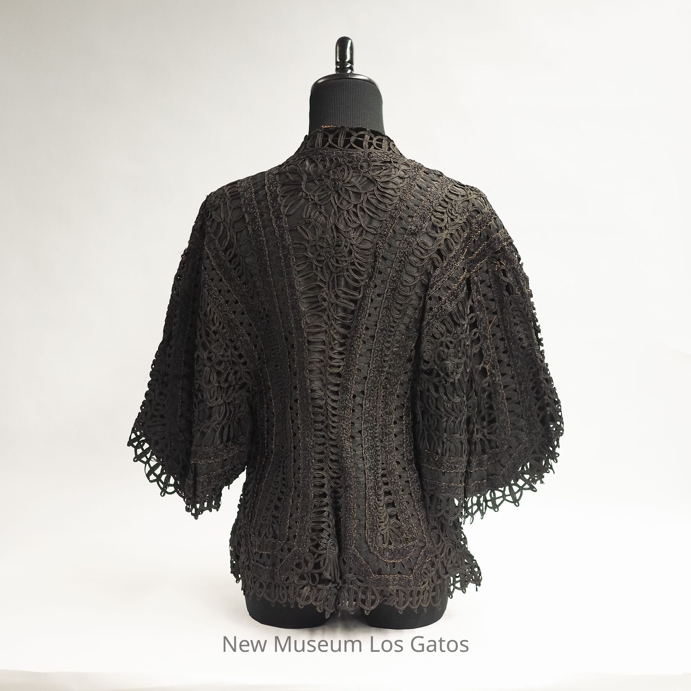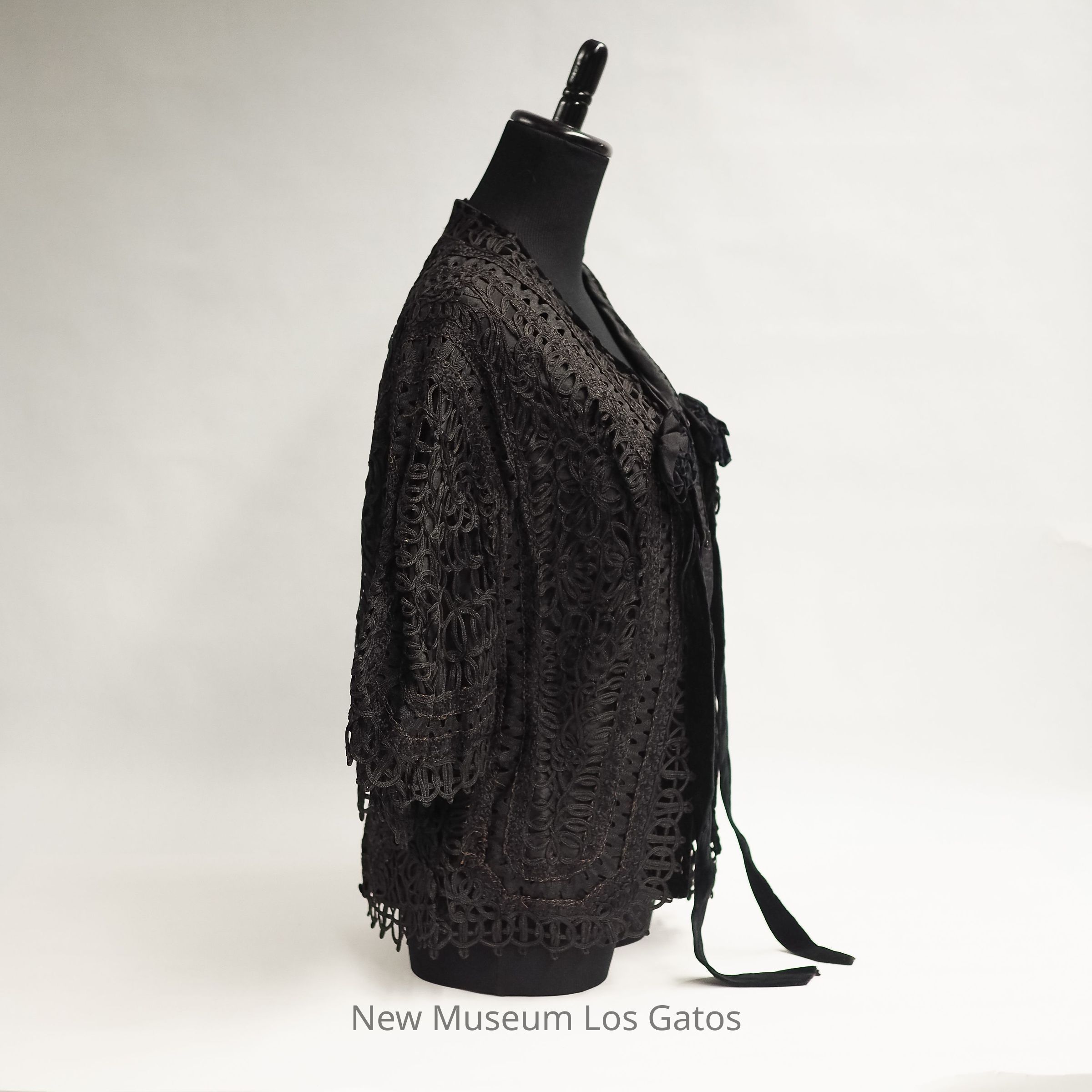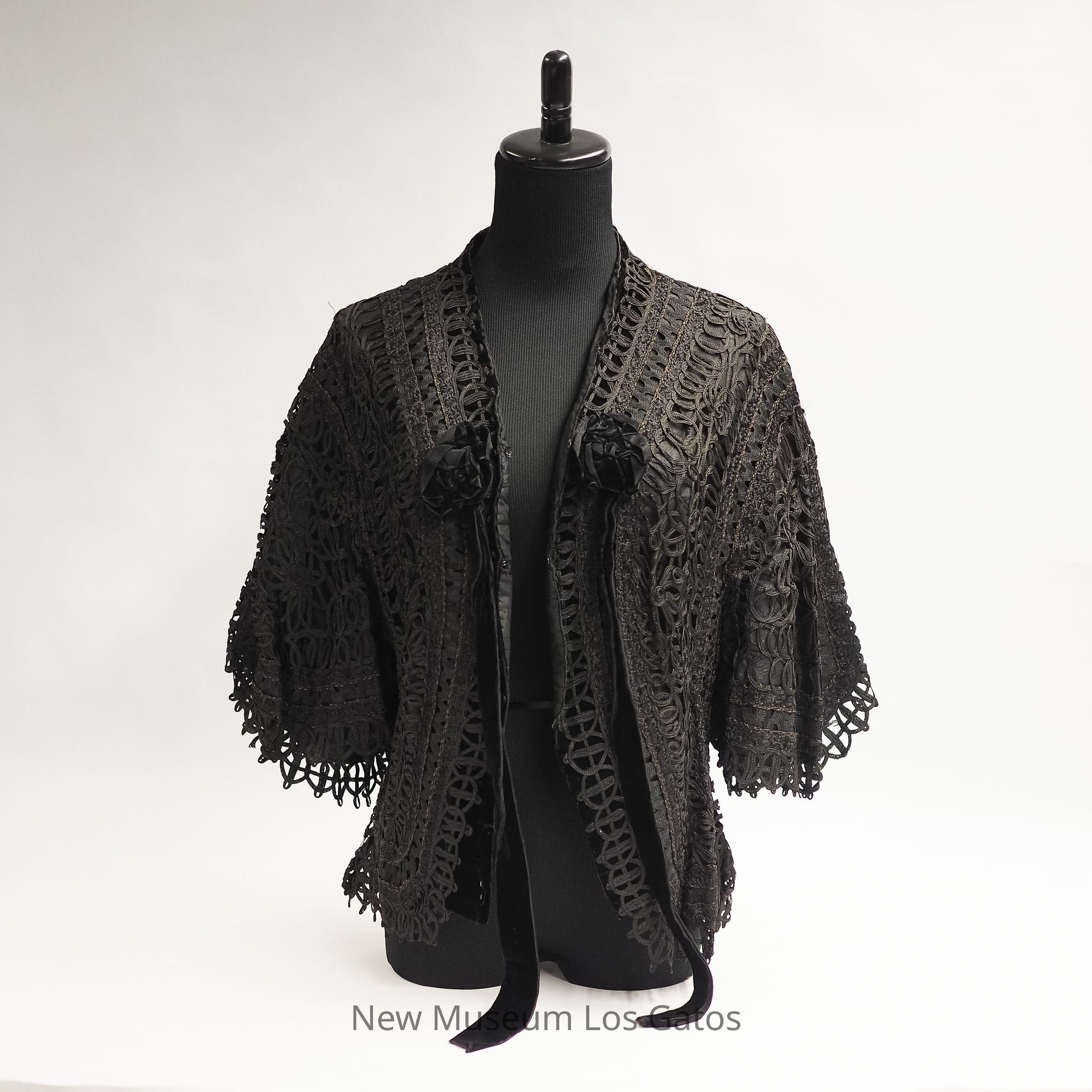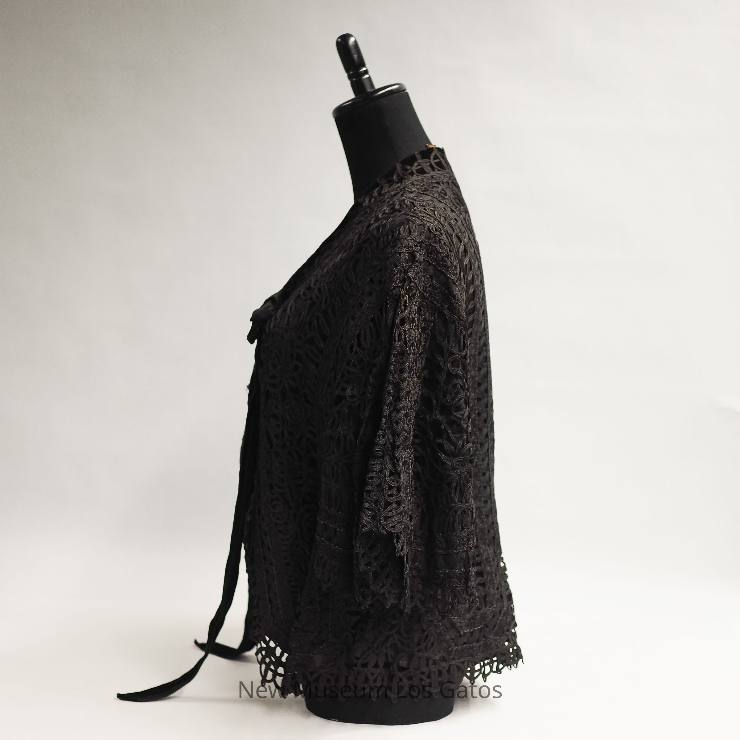 A loose black half-sleeve women's mantle, with lace silk braiding. There are two black velvet flower decorations with long ribbons on the upper front of the piece.Collection