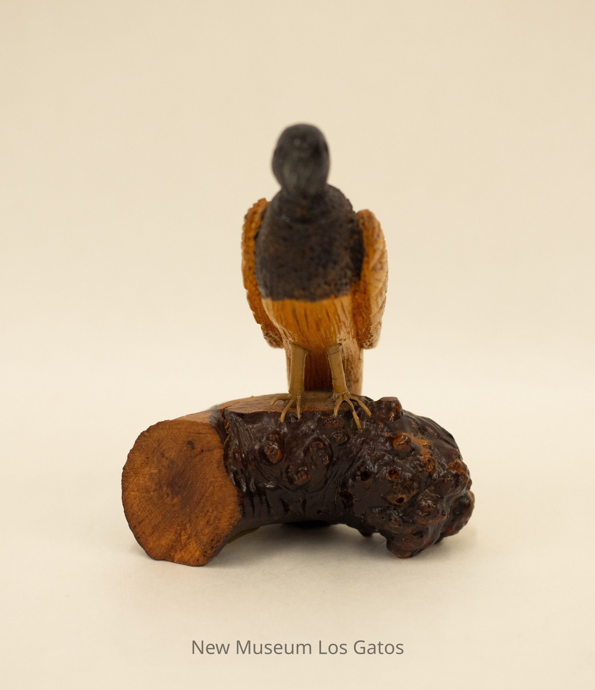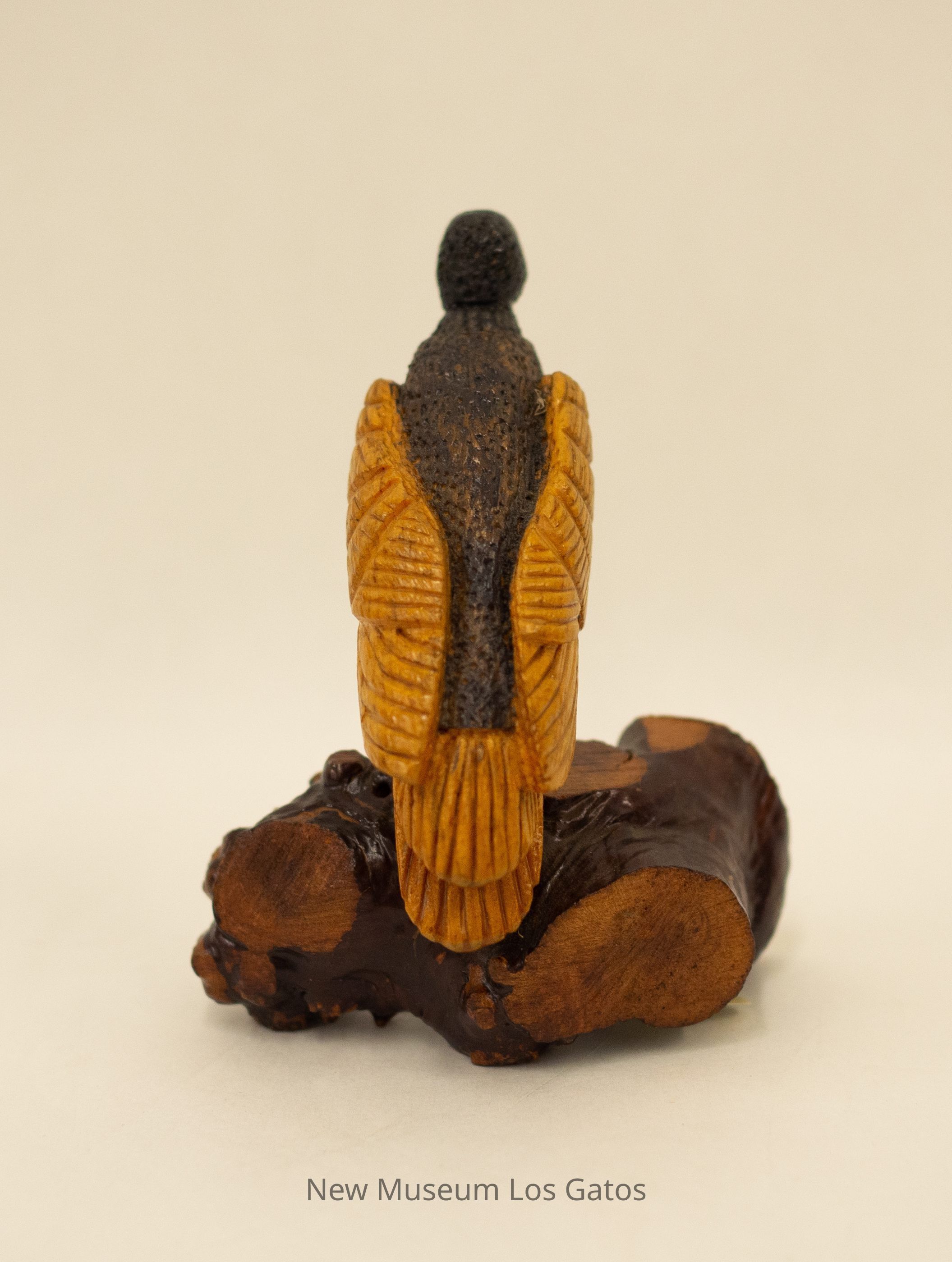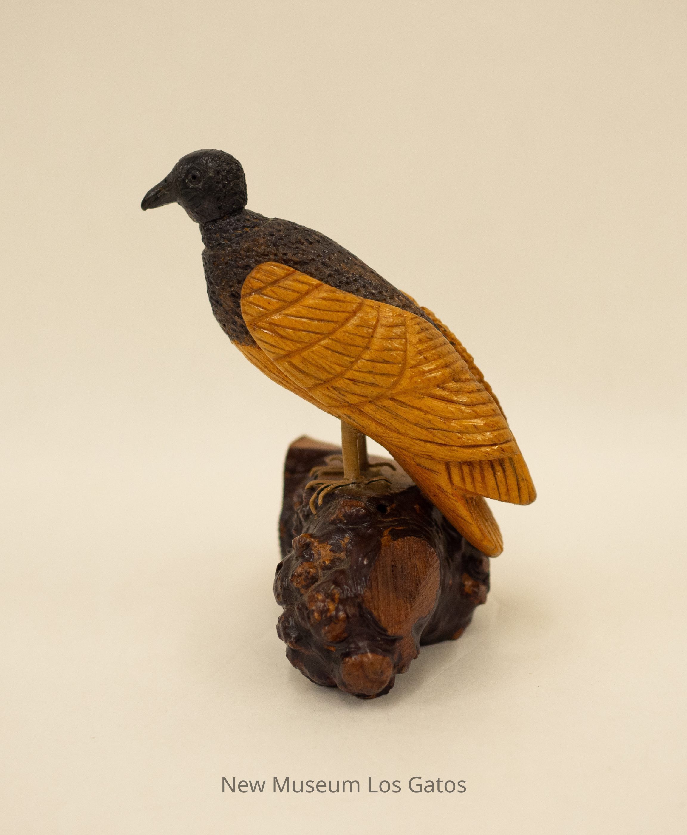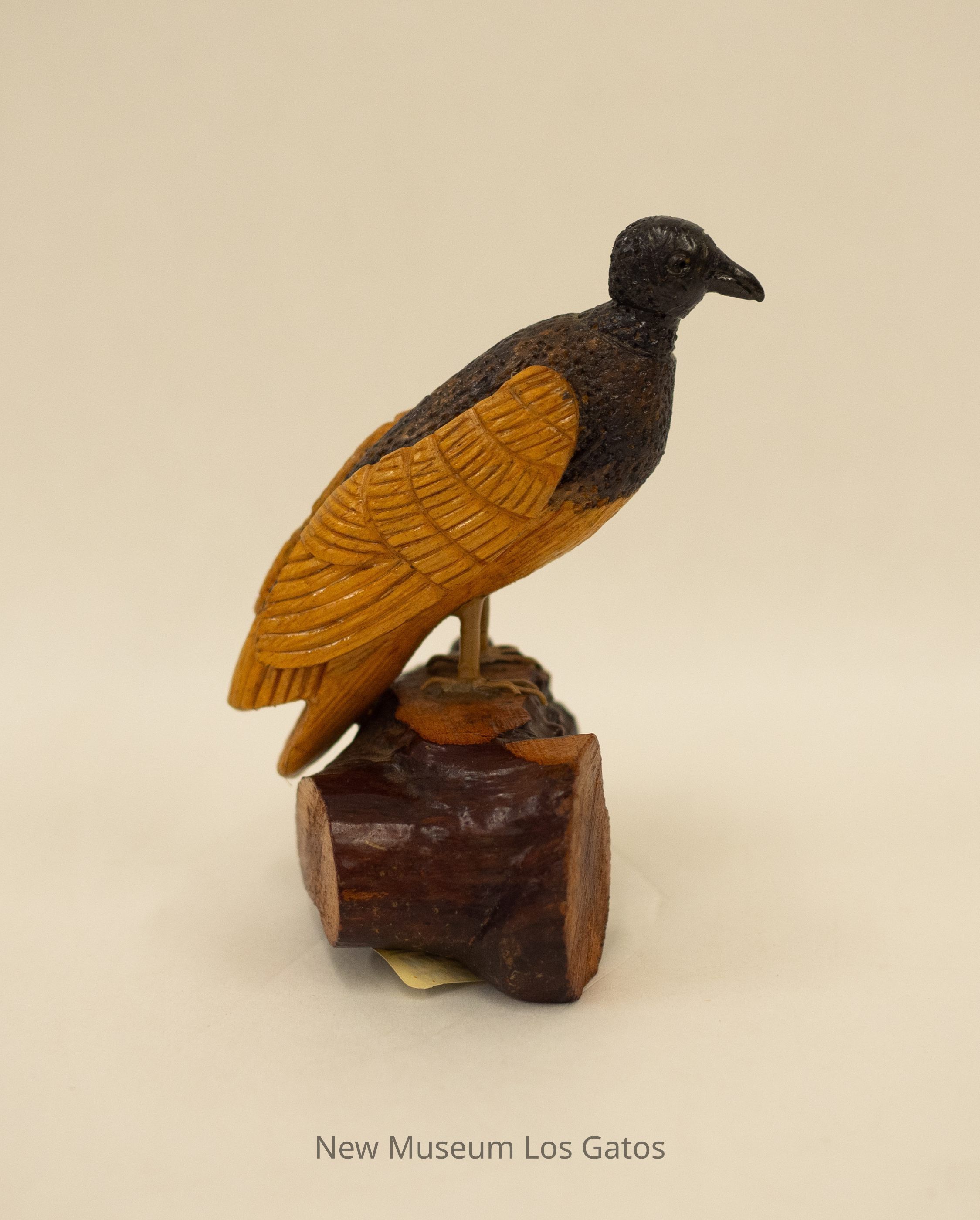 A hand-carved wooden sculpture of a black vulture with a wood base. The bird is two-toned with a black head, upper torso, and back and light brown wings, tail feathers, and belly.Type of Sculpture