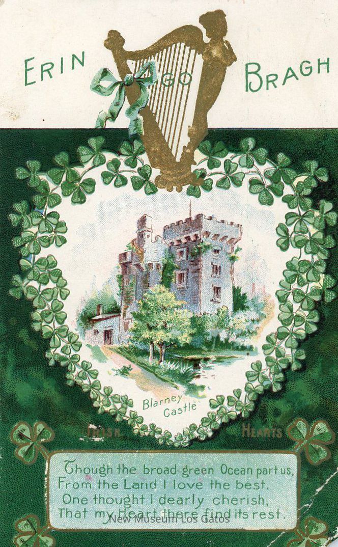 A postcard of with illustrated clovers shaped into a heart, with an illustration of Blarney Castle in the middle, as well as a harp.Subject