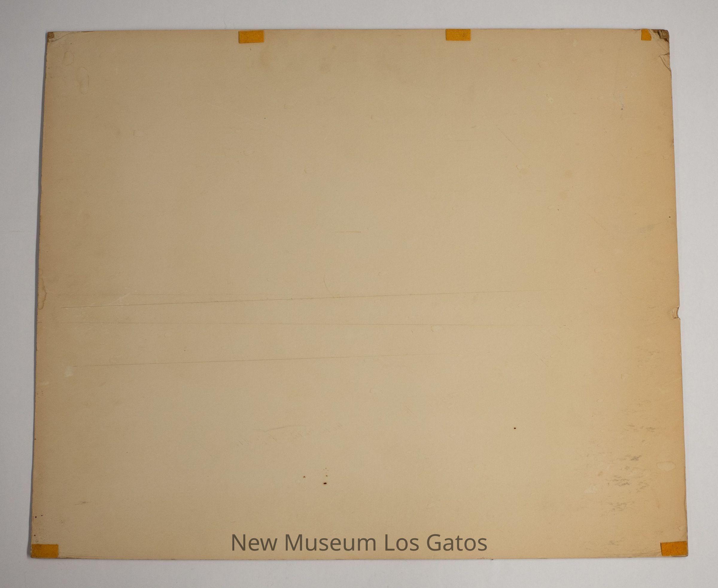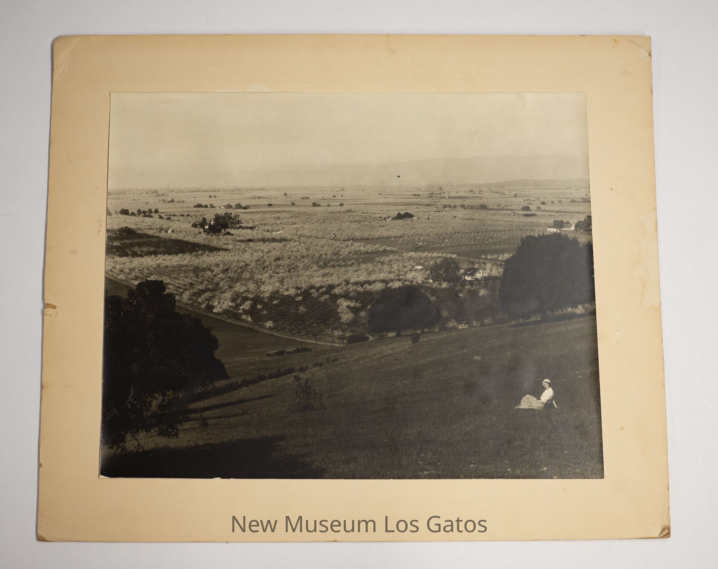 A large black and white photograph, on a cardboard mat. The photograph depicts Blossom Hill before Blossom Hill Road existed, and features a grassy hill with orchards stretching off into the background, with scattered houses and structures throughout. There is a woman in a white blouse, a darker skirt, and white hat sitting on the hill, looking back at the photographer.Photograph Details