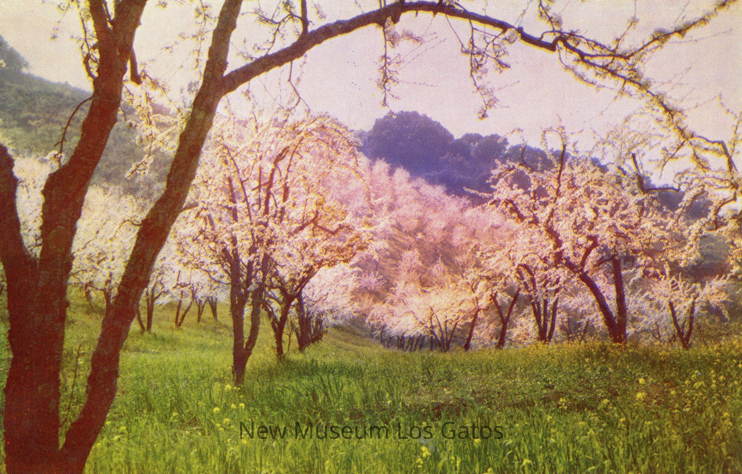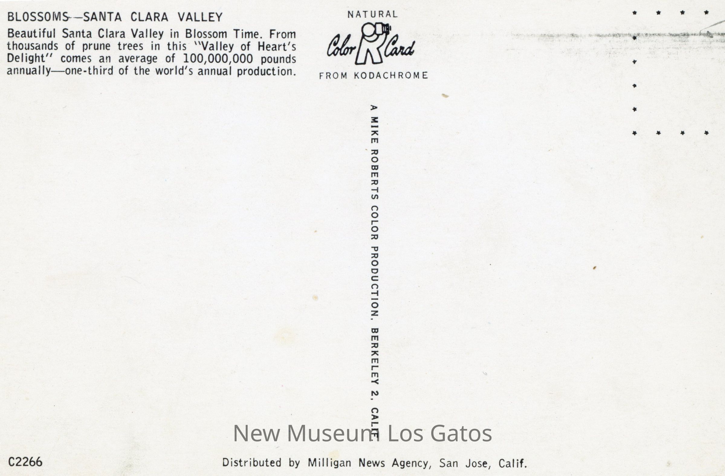 A postcard depicting prune trees in blossom in Santa Clara Valley, San Jose.Subject