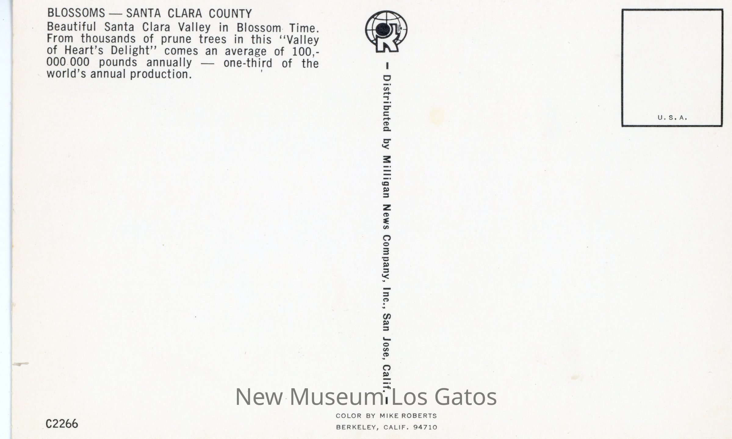 A postcard depicting prune trees in blossom in Santa Clara Valley, San Jose.Subject