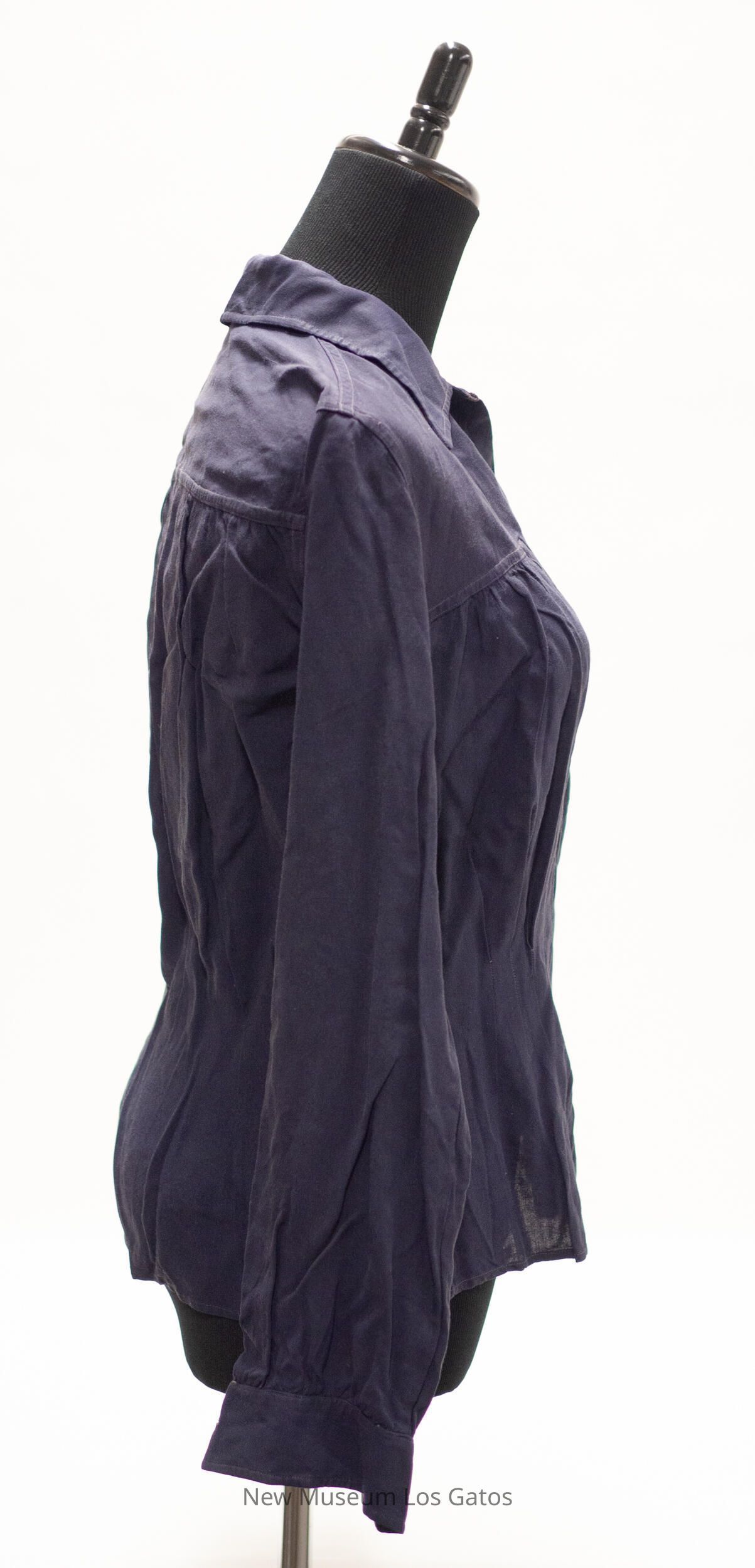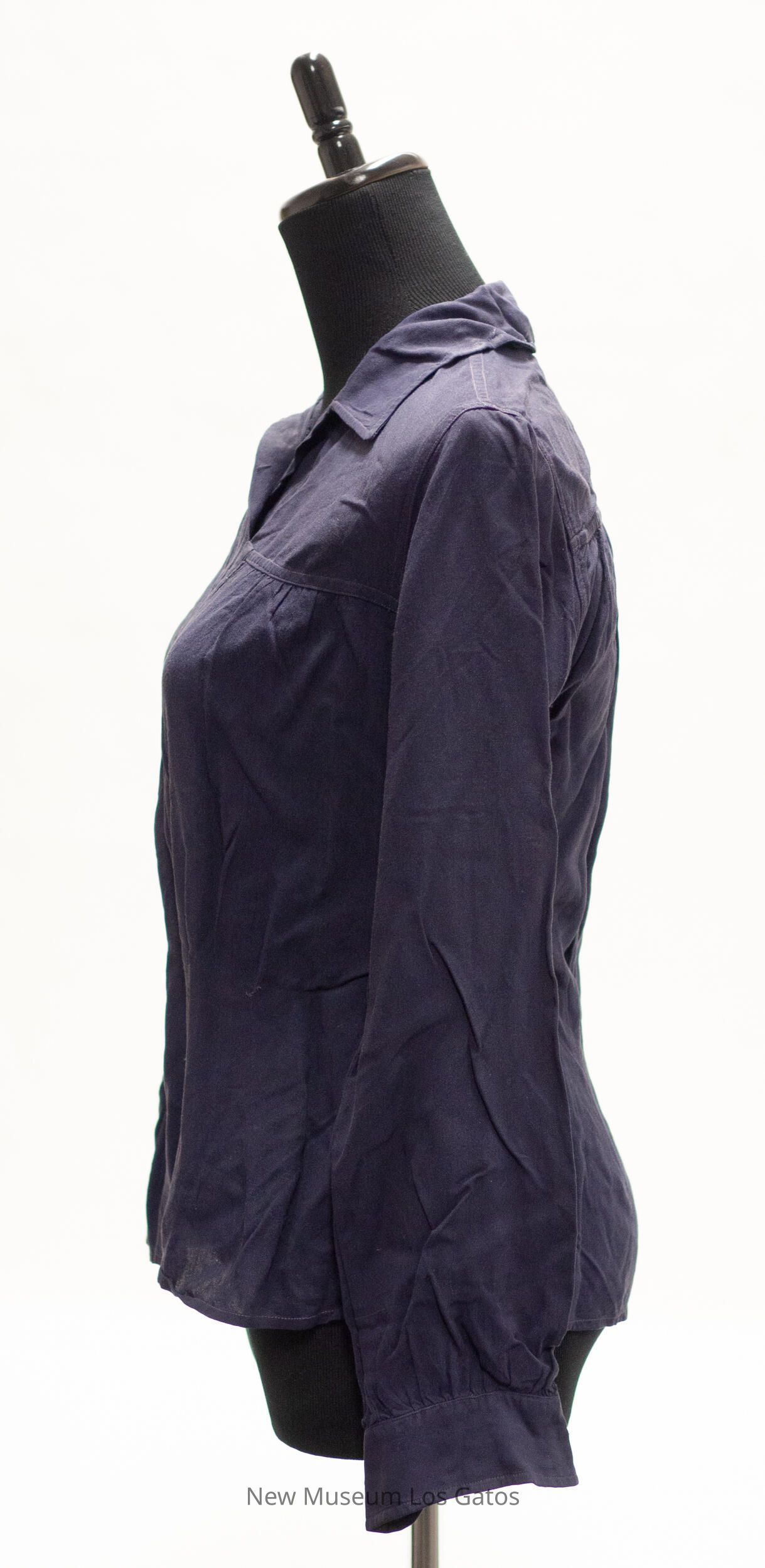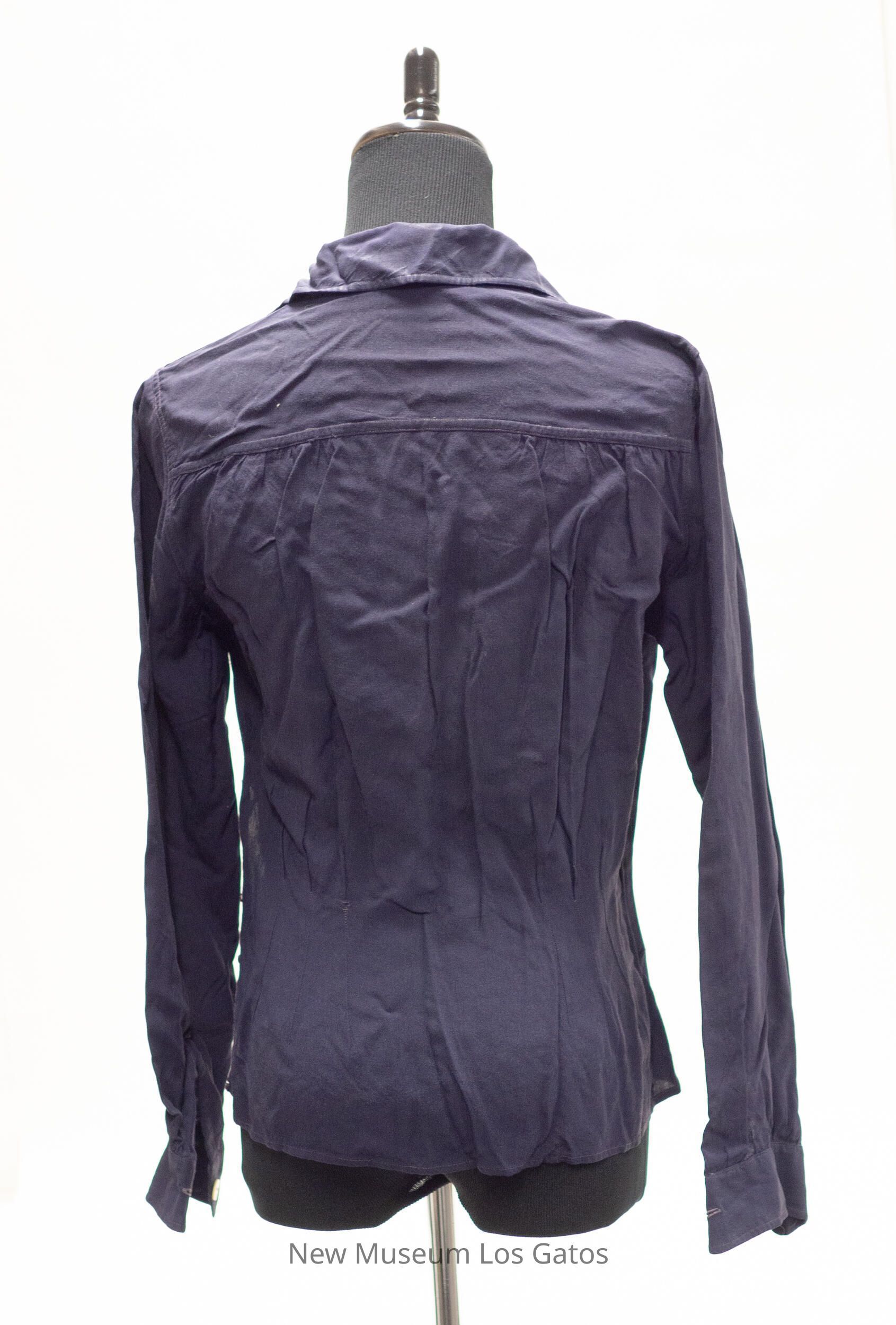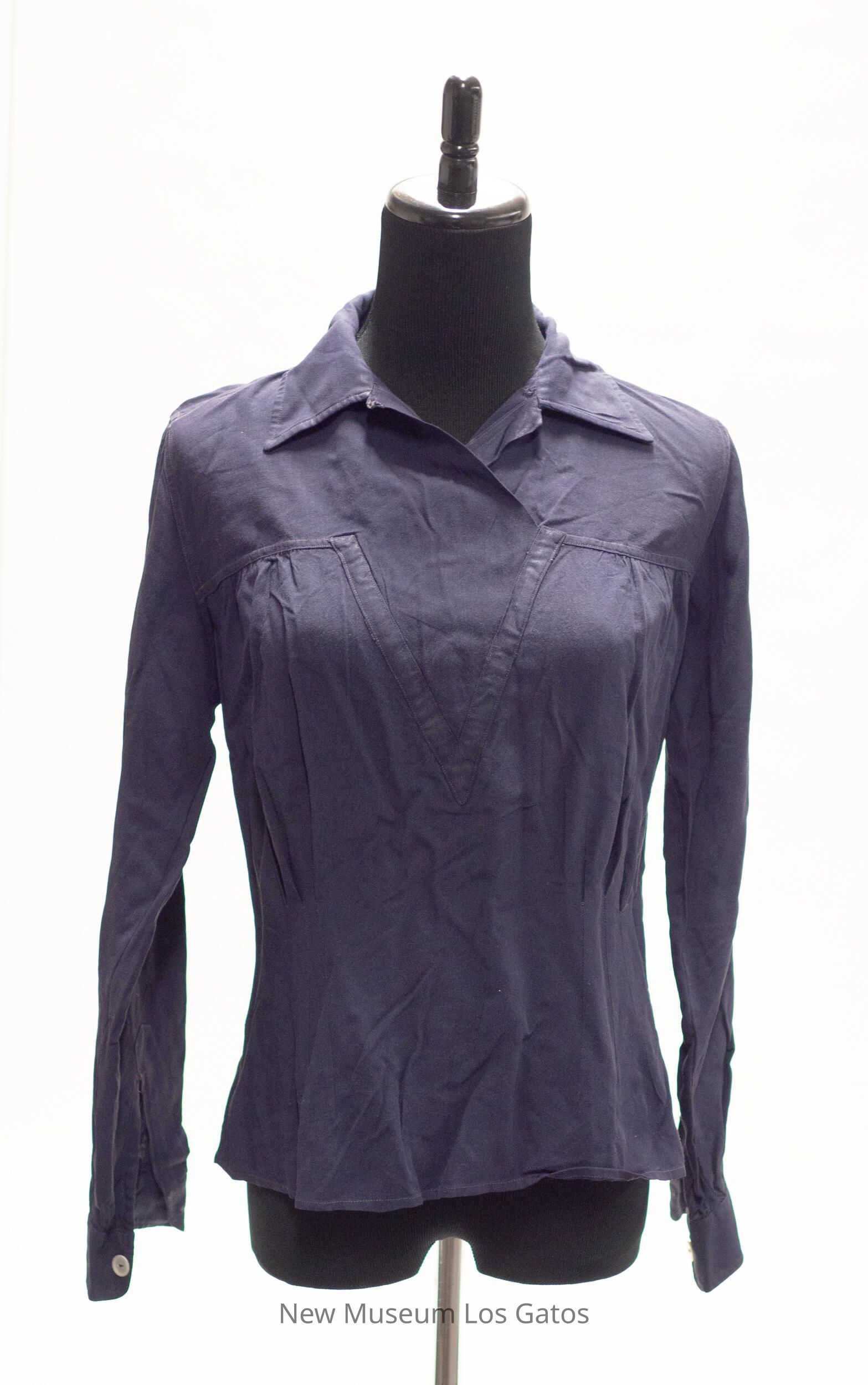 A dark navy, cotton, collared long-sleeved blouse. There is a navy, fabric "V" decorating the front of the blouse, as well as ruching along the sides. There is a slit on the left side of the blouse, that closes with five black snaps. There are also medium-sized white buttons to close the cuff of each sleeve.Collection