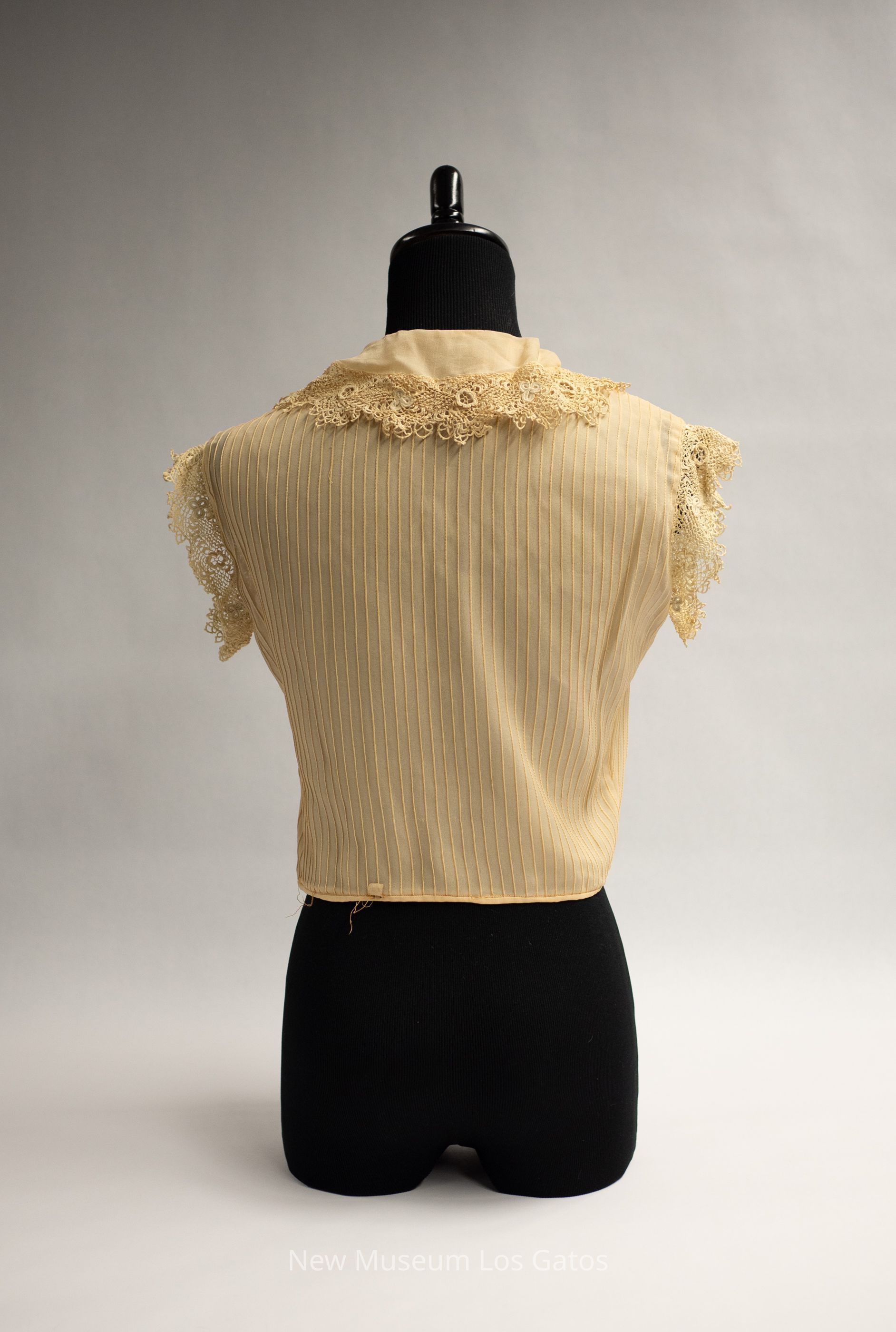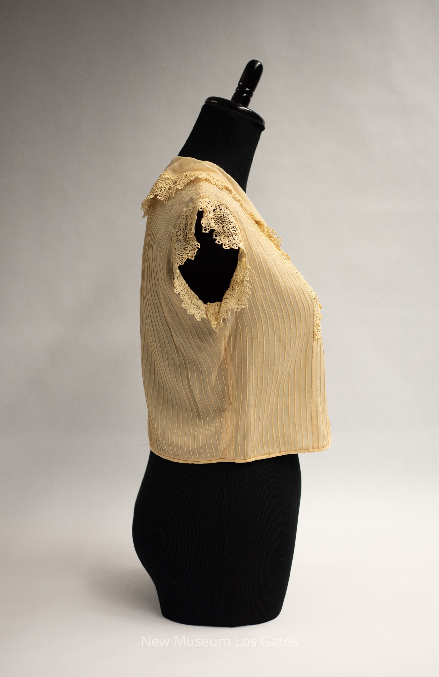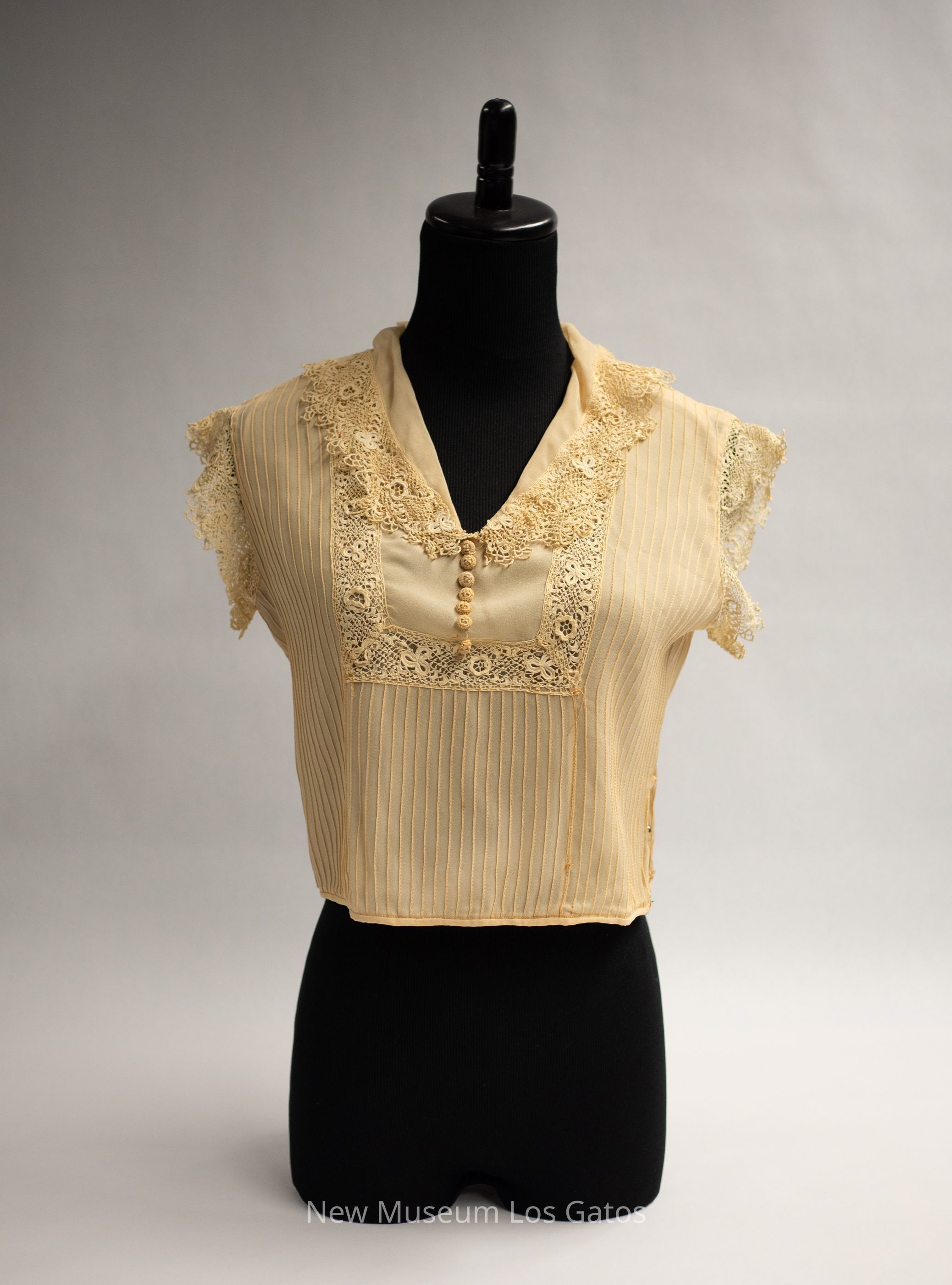 A small light brown/cream colored (ecru) silk blouse. There is vertical stitching, forming a line pattern throughout the blouse. There is tatted decorative trim at the edges of both sleeves, as well as around the collar and neckline There are seven ornamental buttons in the bodice, and two functional snaps at the bottom edge, on the left side of the blouse.Collection