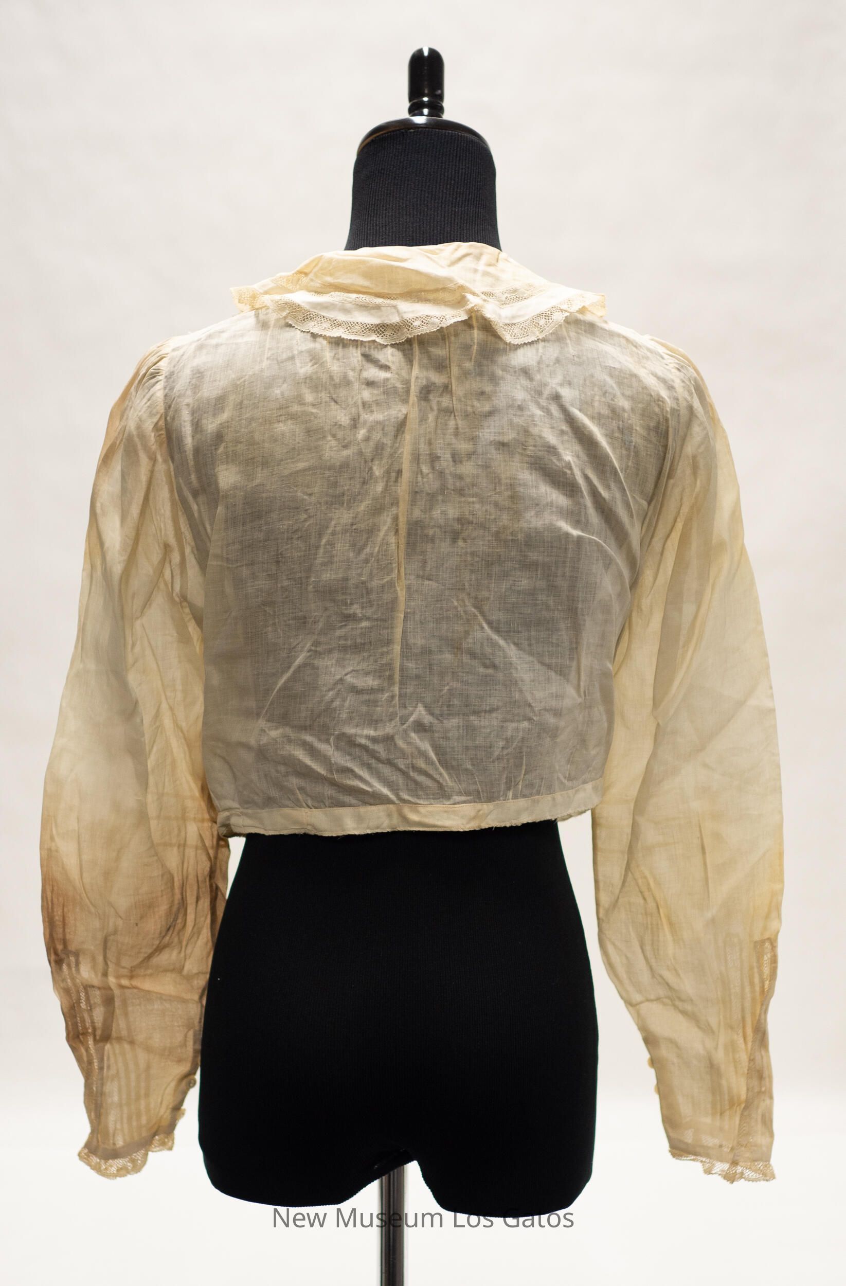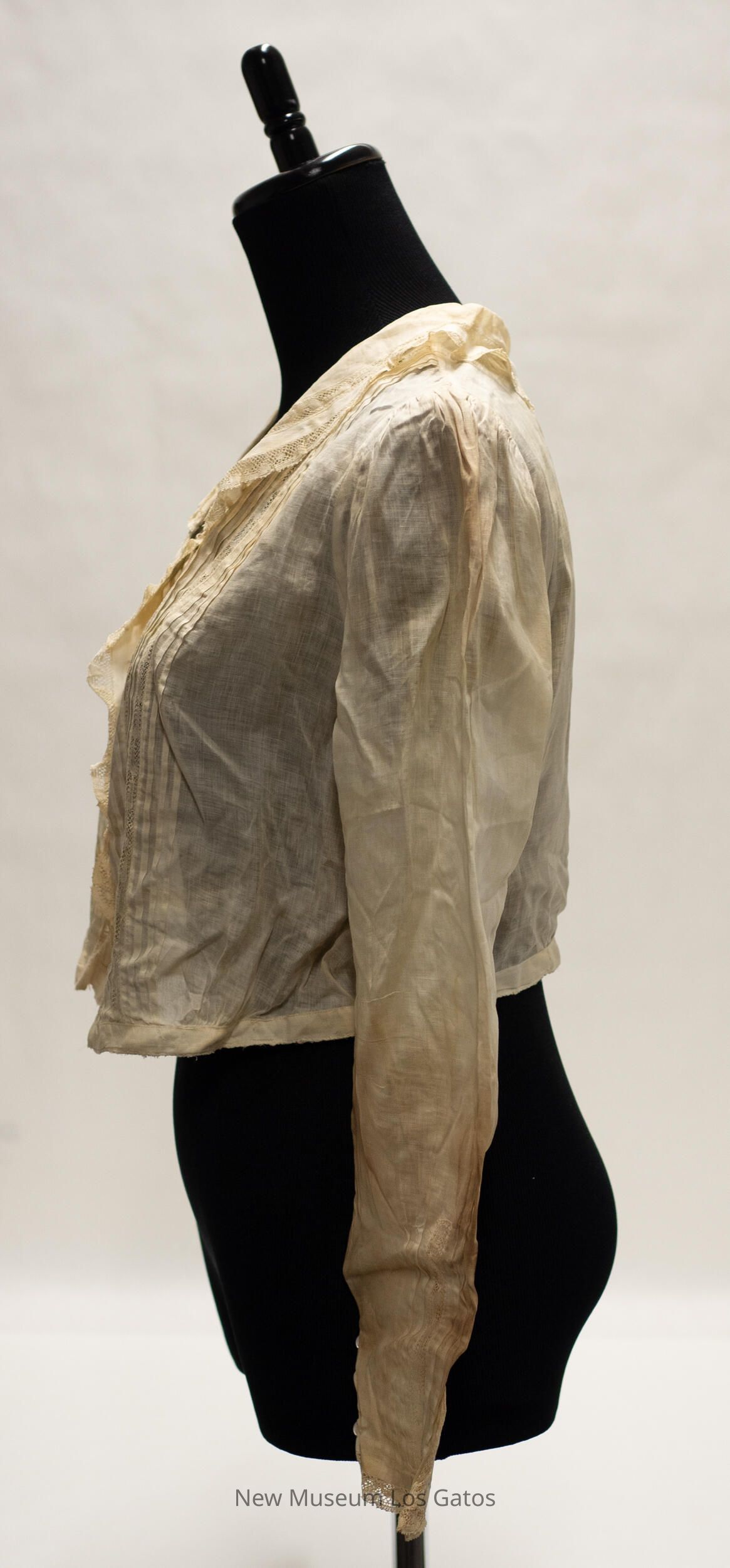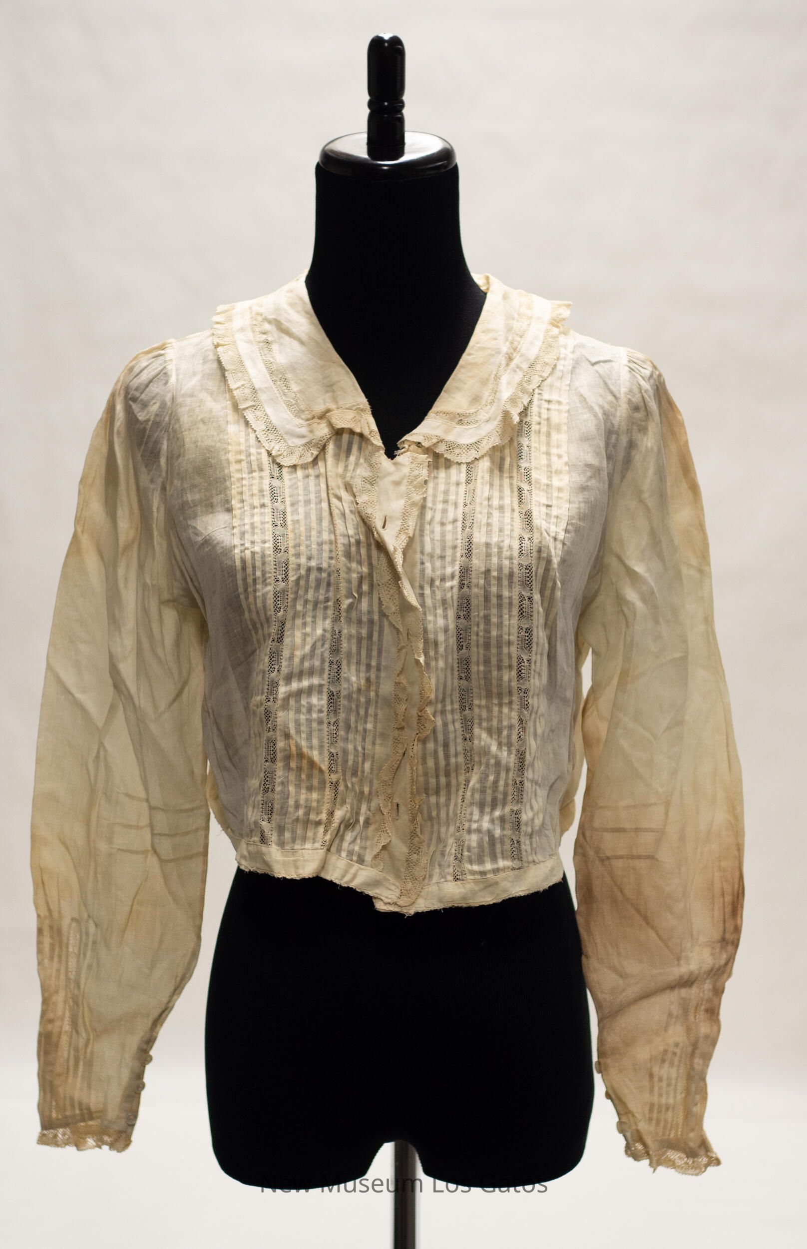 A cream-colored, batiste long-sleeved blouse. The blouse opens down the center front, and closes with six small, white iridescent buttons and two snaps, one at each end. There are three bands of vertical pin tucks on each side of the blouse, with a band of lace separating each band of tucks. There is ruffled lace detailing down the center of the blouse and around the edge of the collar. There is lace along the edge of each sleeve, as well as three small white buttons, and two bands of vertical stripes separated by a band of lace.Collection
