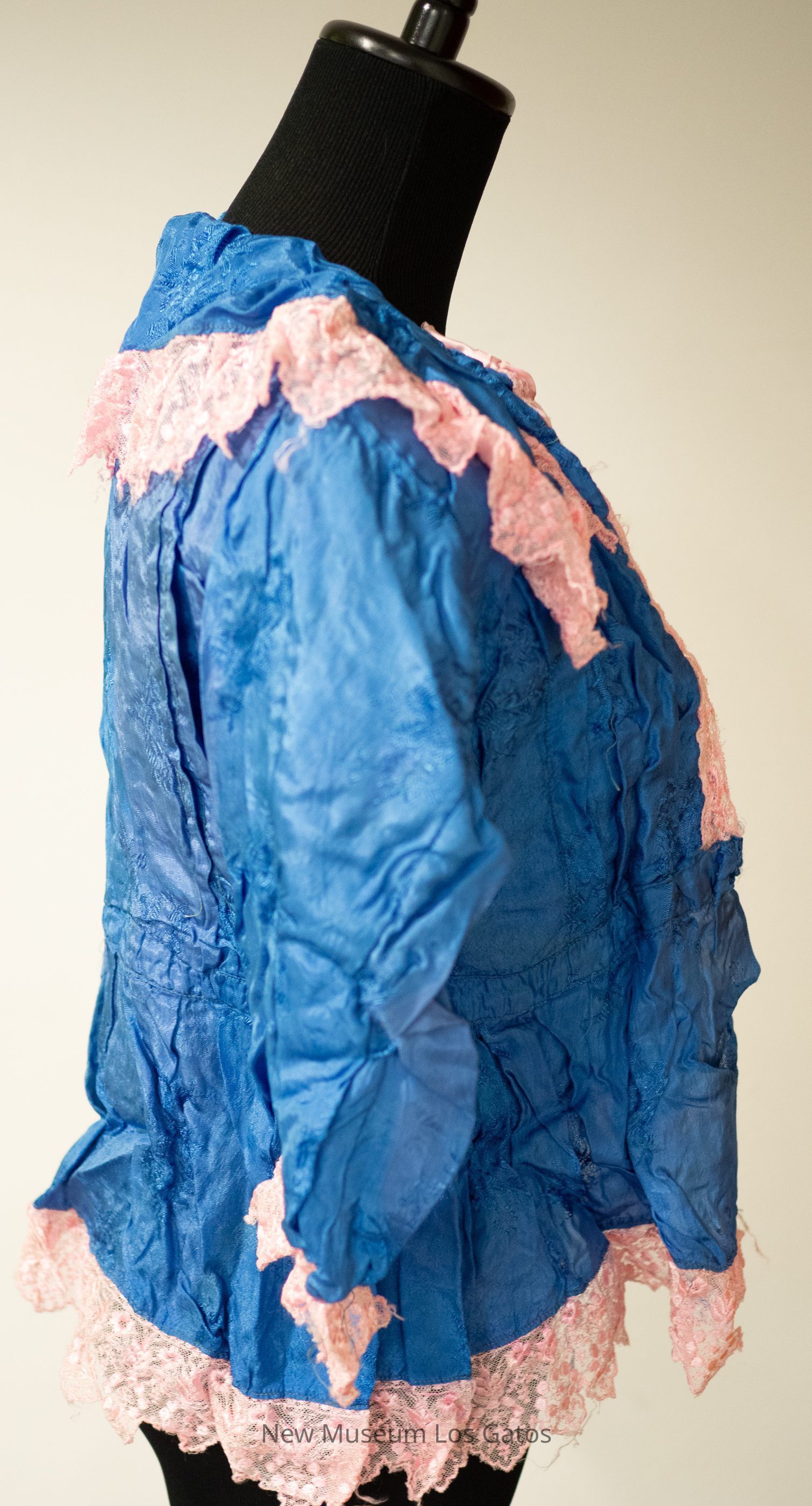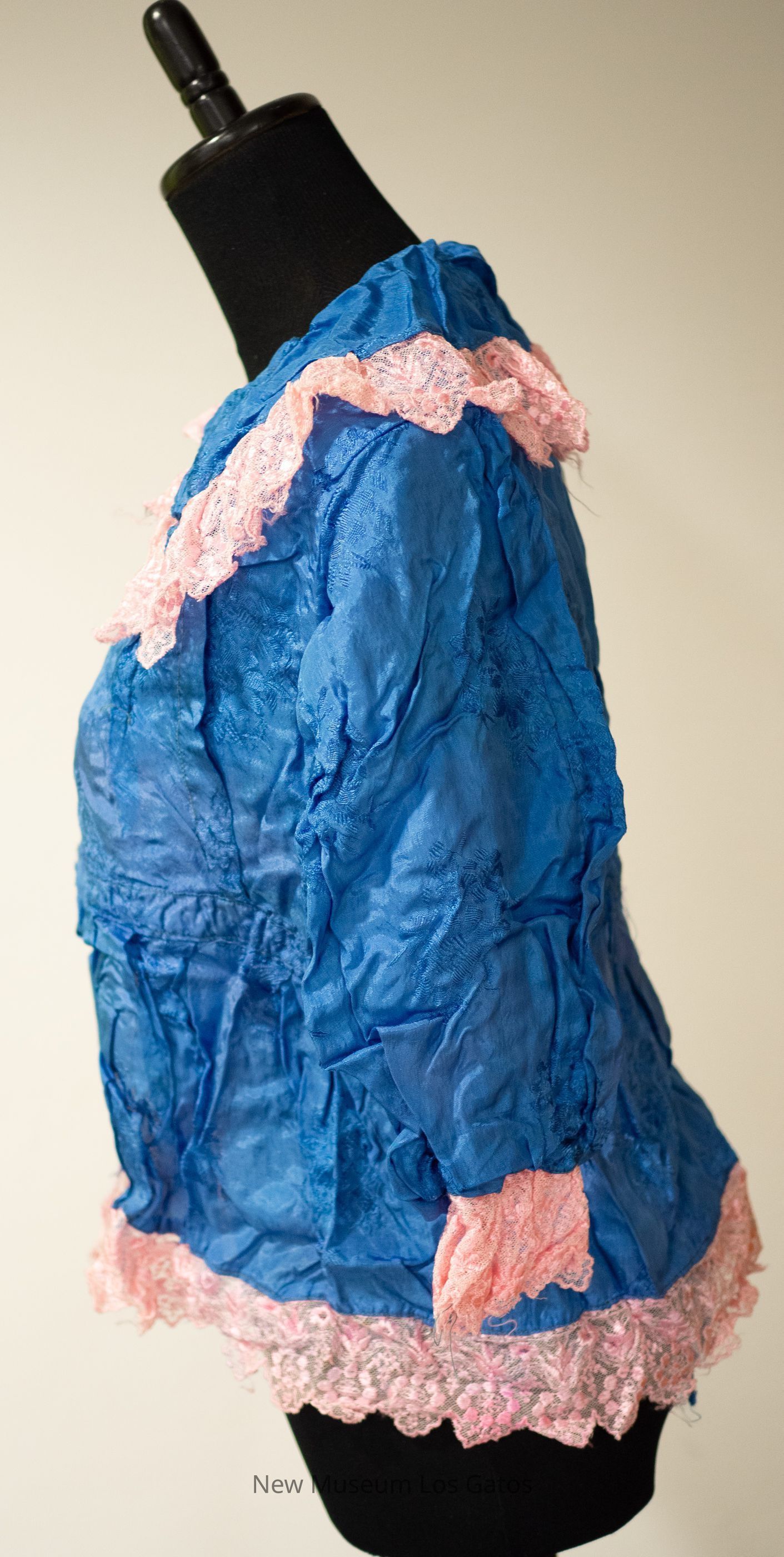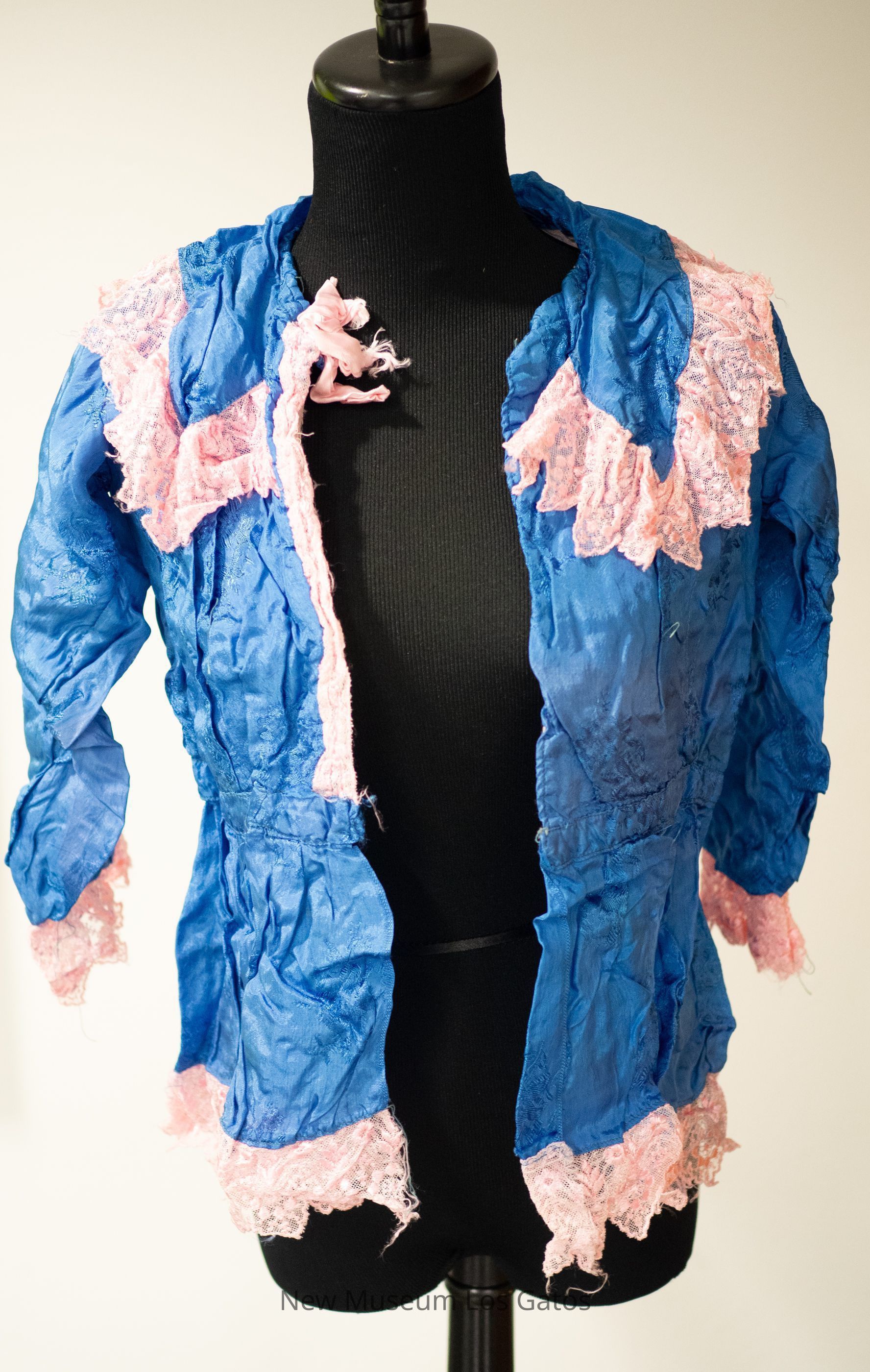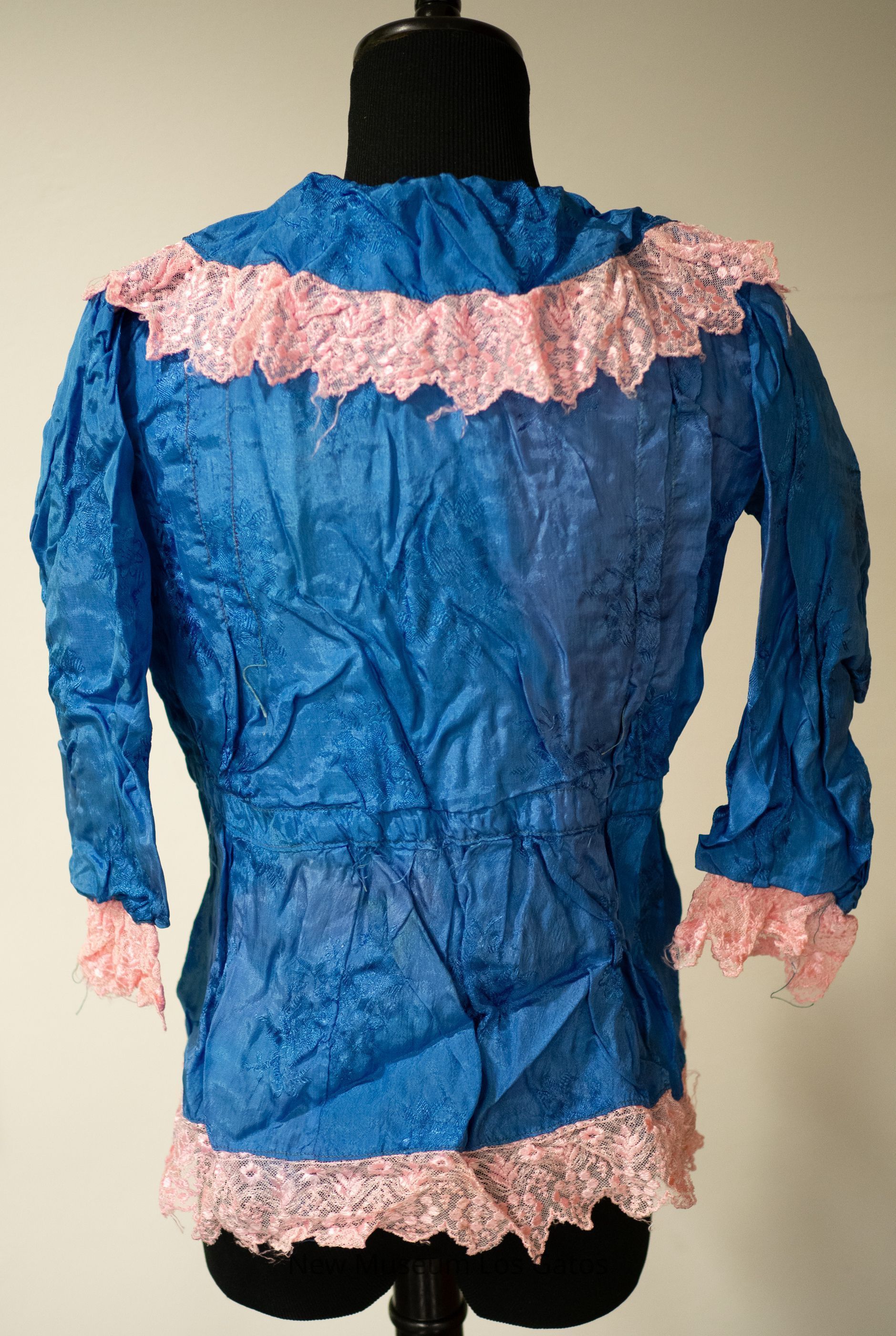 A women's blue silk bodice with pink machine-made lace trim at the collar, hem, and sleeve. The blue silk portion has a embroidered floral design throughout the bodice. There is a half insert of pink lining inside of the bodice. There are pin tucks down the chest and back of the bodice. There is a pink bow on the right side, near the collar of the bodice.Collection