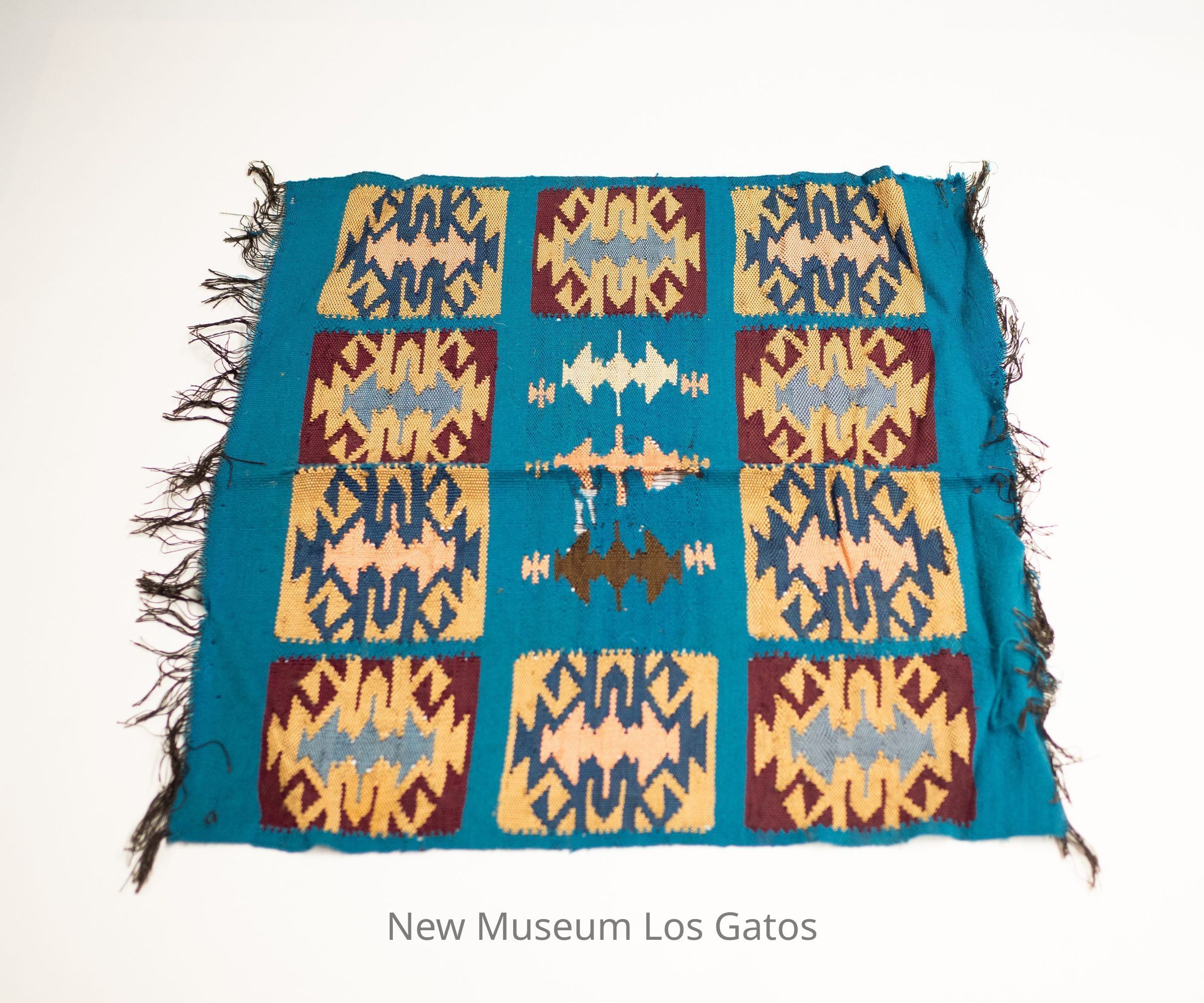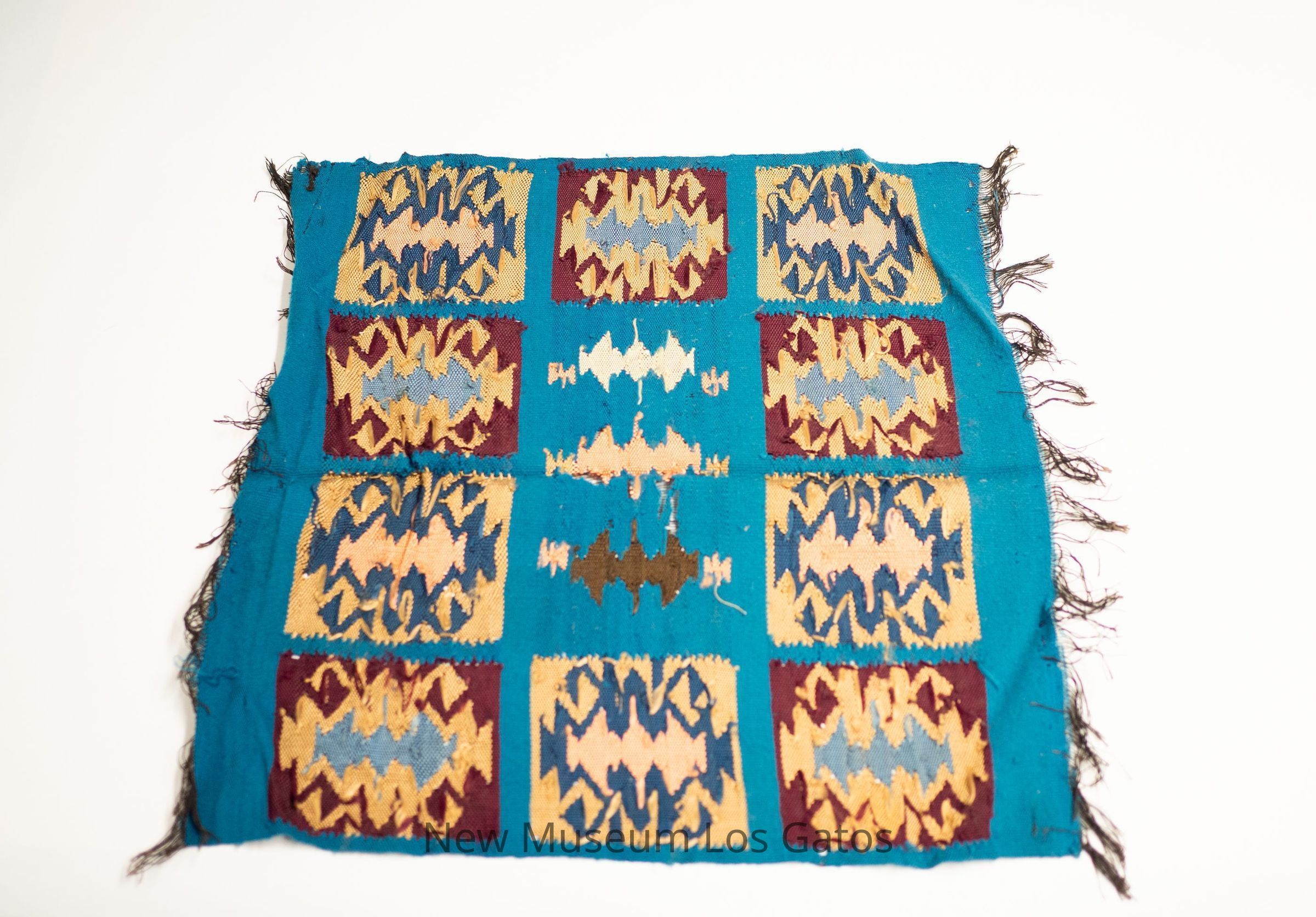A small blue tapestry with multicolored geometric designs and black fringe.