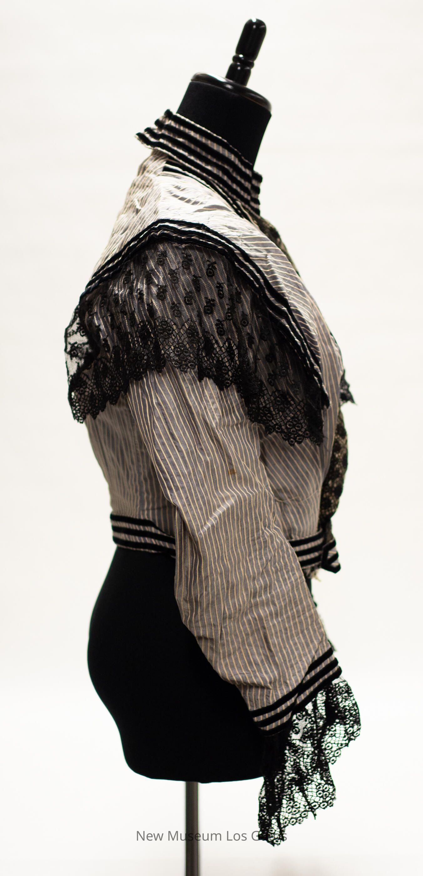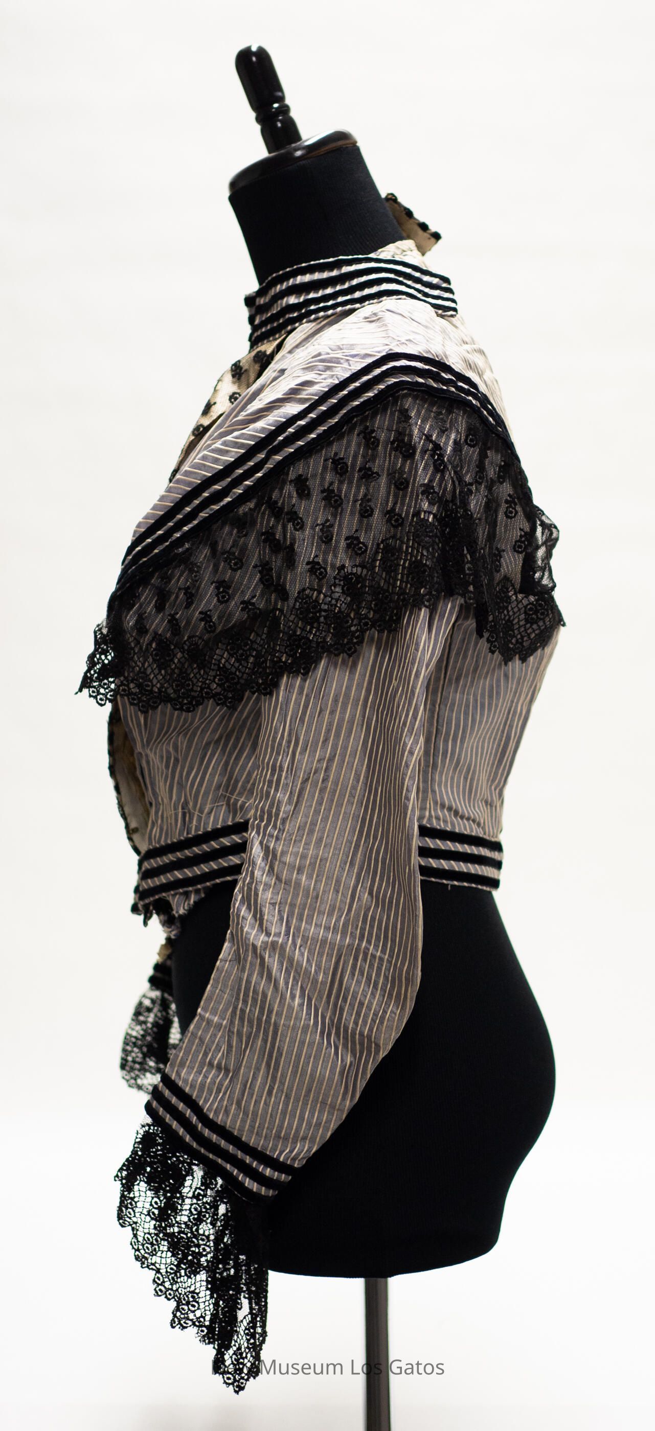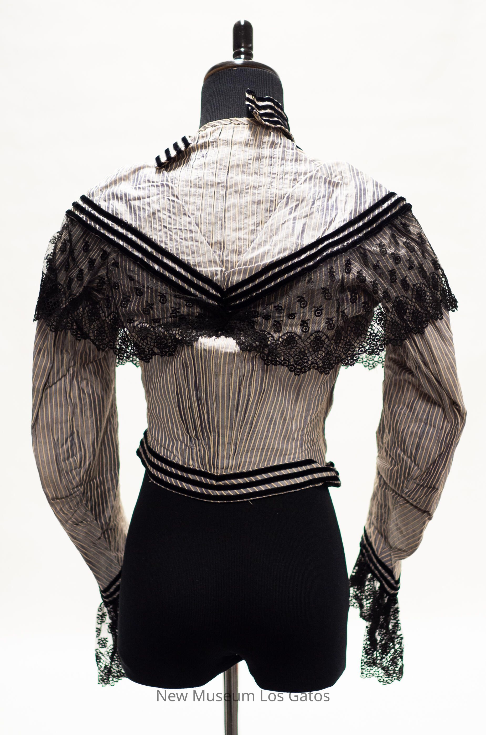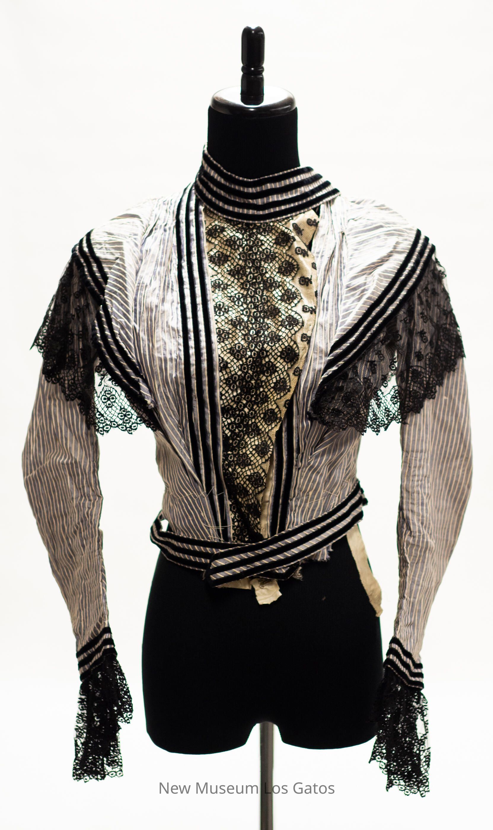 A gray long-sleeved bodice, with raised white stripes throughout. There is black lace trim at the end of the sleeves, and over the shoulders, extending from the bodice to the back. There is also black velvet stripes along the end of the sleeves, around the waist, and along the lace that extends over the shoulders. The bodice opens in the front and closes with metal hook-and-eye clasps, and there is a flap of pale fabric covered in black lace that hides the bodice opening.Collection