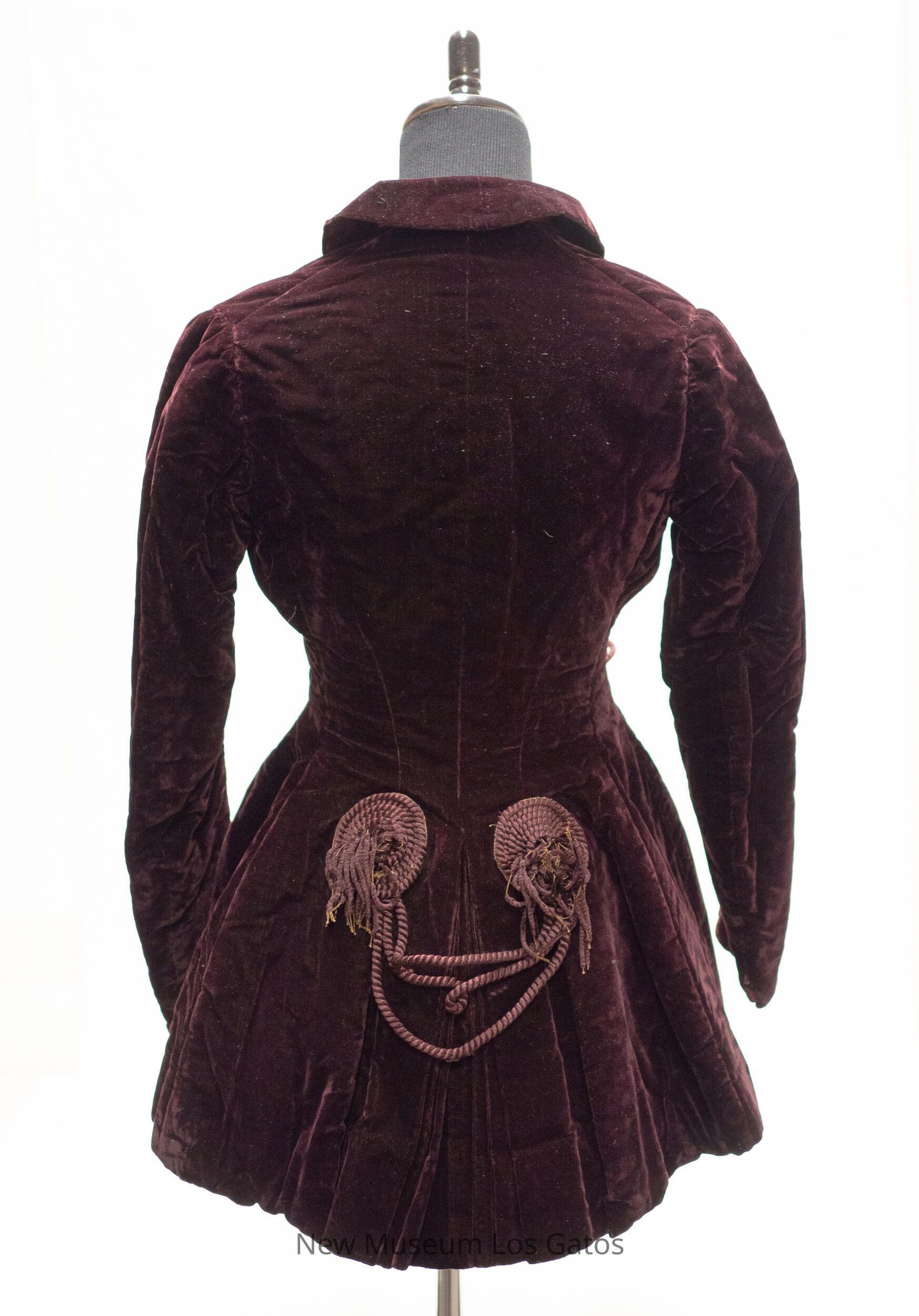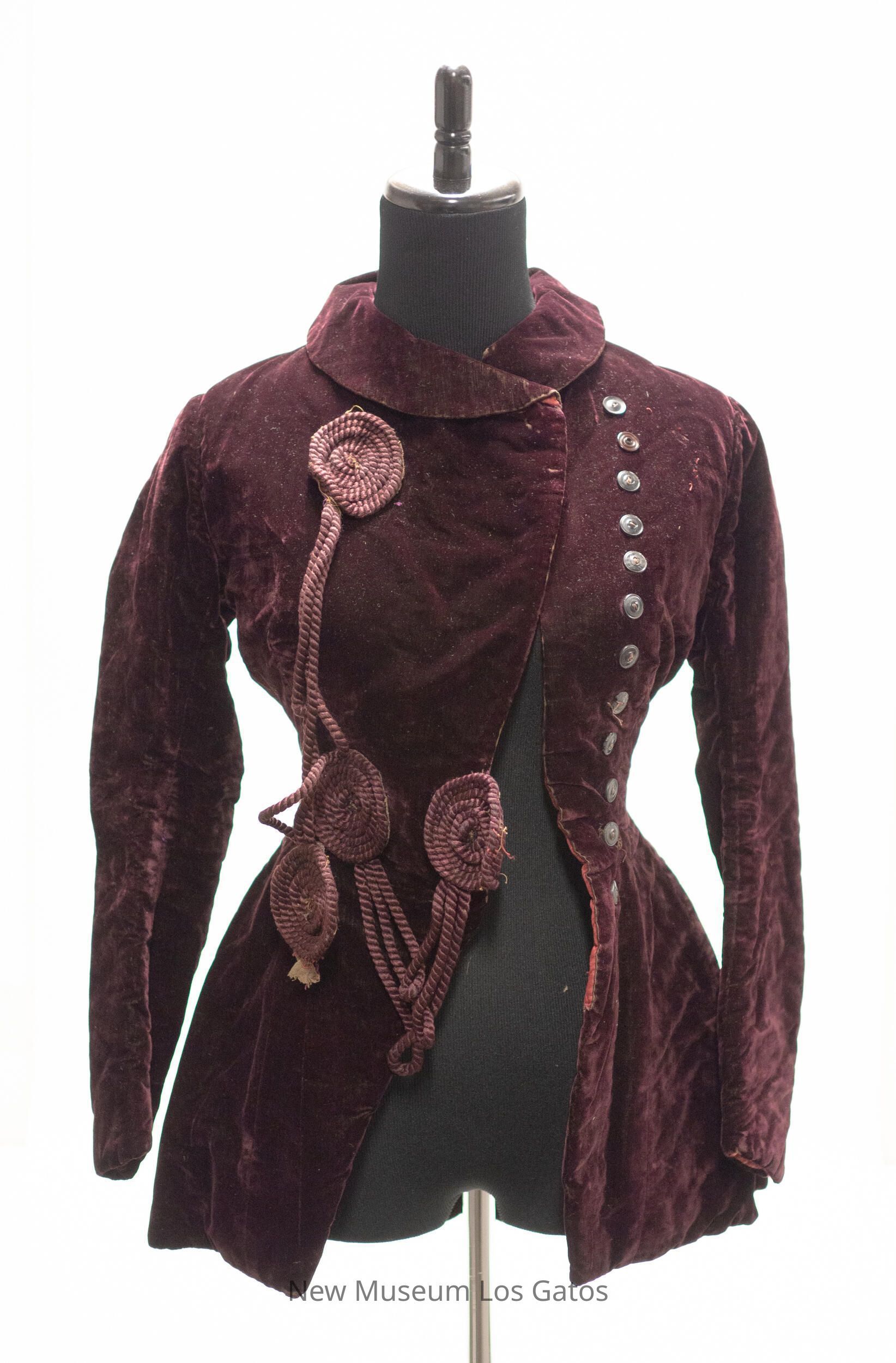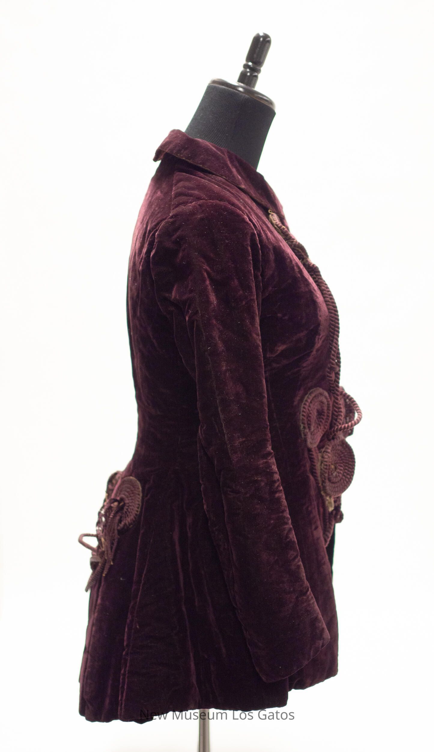 A velvet, burgundy bodice. The bodice opens in the front, and closes slightly off-center to the left with large black buttons. There is decorative burgundy cording twined into circles, two on each side at the waist and the chest, that attach to each other with three cords; there is also cording twined into two circles and attached with three corded ropes at the lower back. The interior of the bodice is a lighter burgundy/maroon, and is quilted.Collection