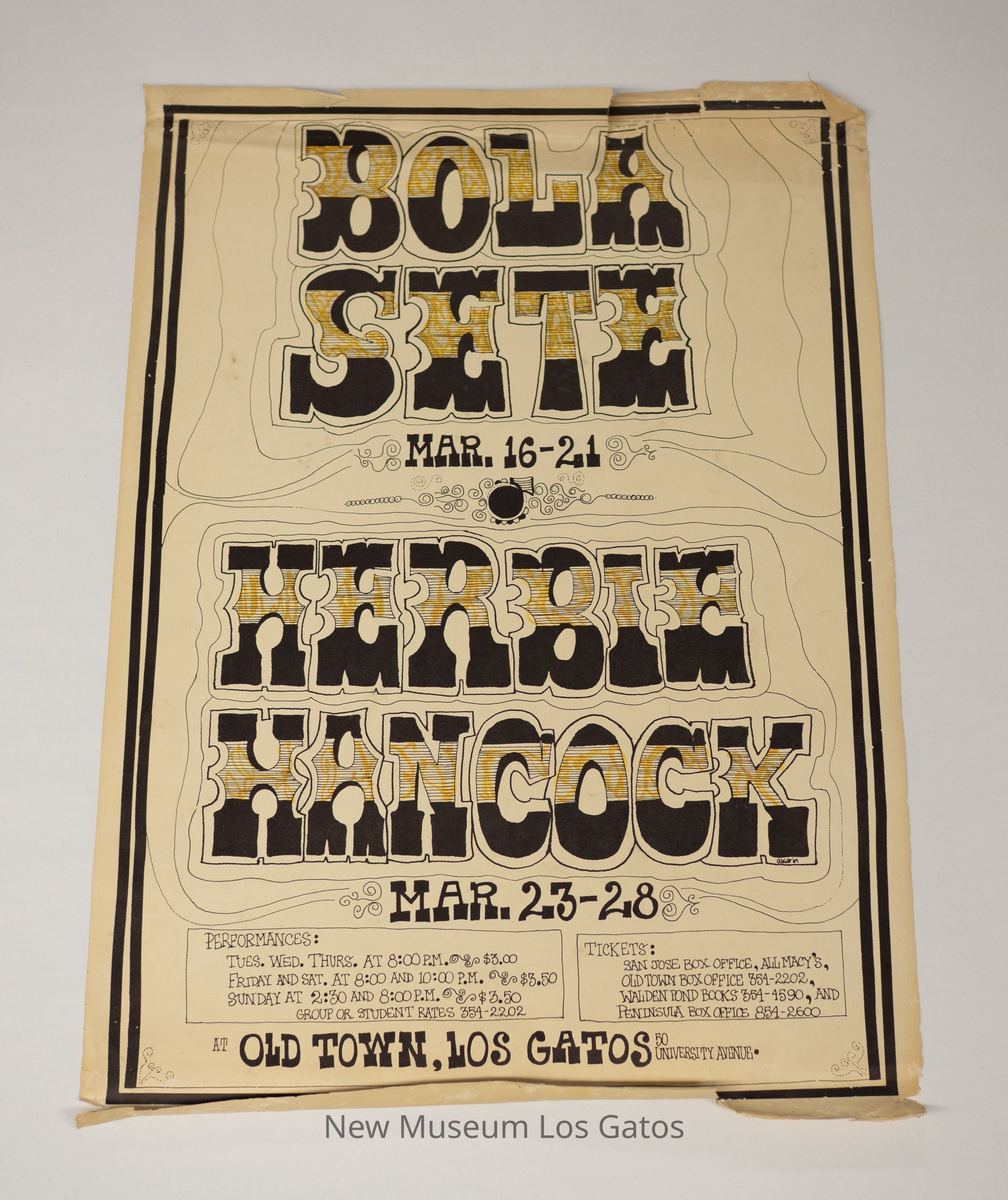 A single poster, for a series of performances by artists Bola Sete and Herbie Hancock at Old Town in Los Gatos. The poster is white, with large stylized lettering of the performers' names. At the bottom of the poster is information about performance times, ticket prices, and where to buy tickets.Collection