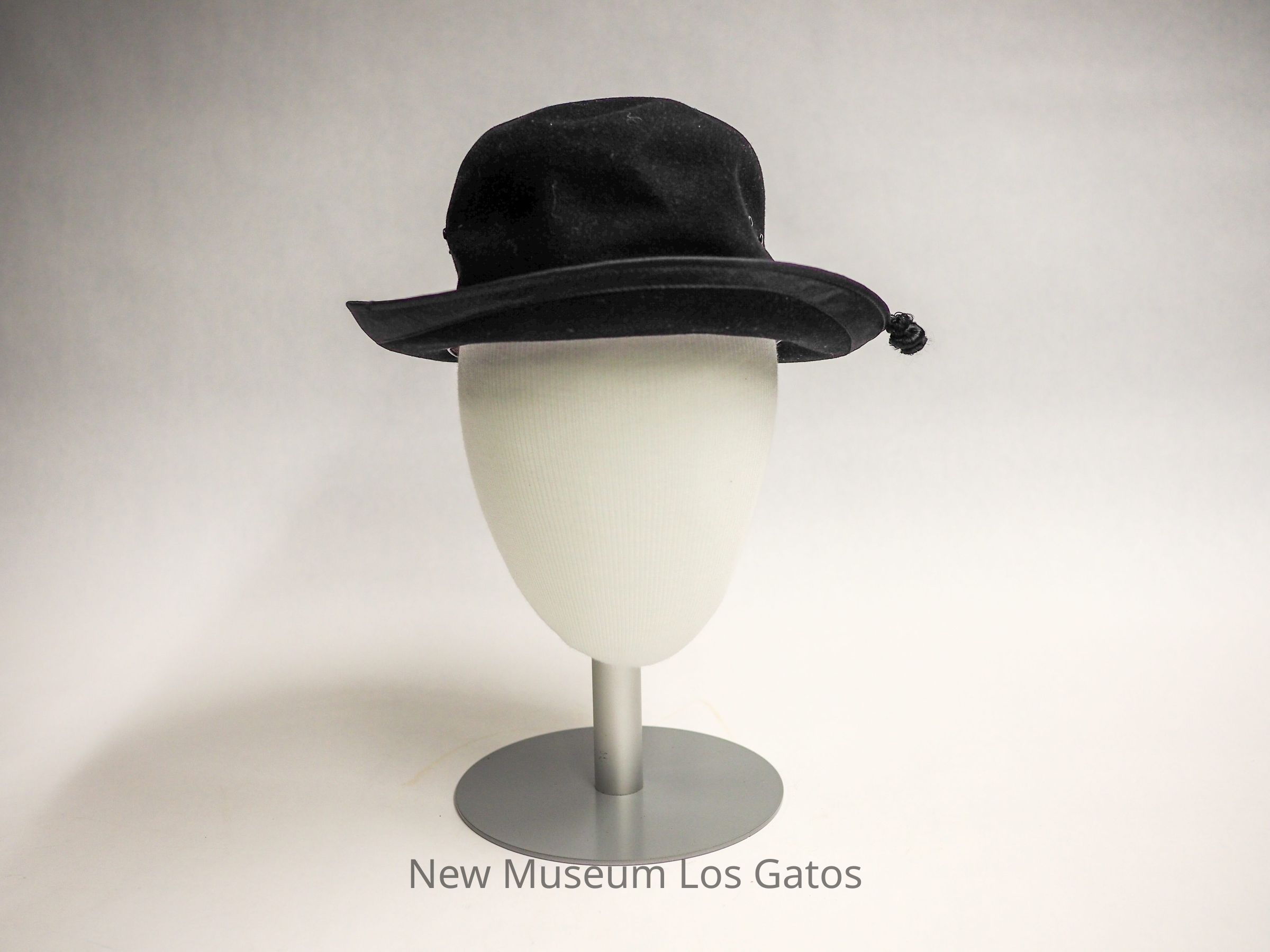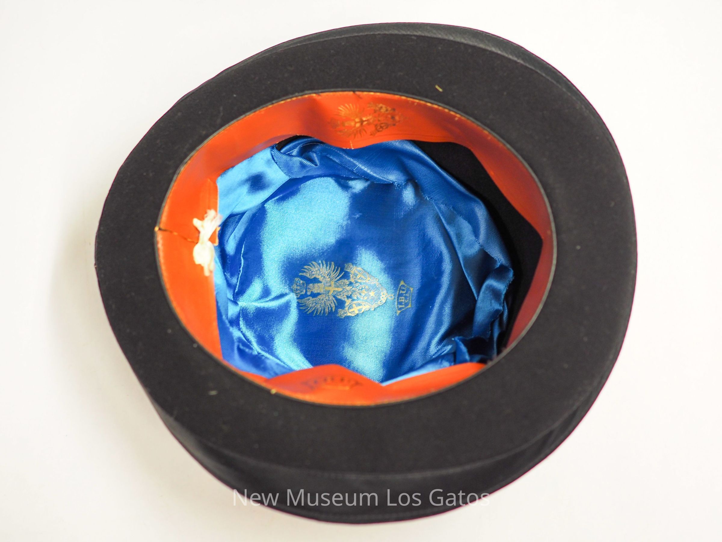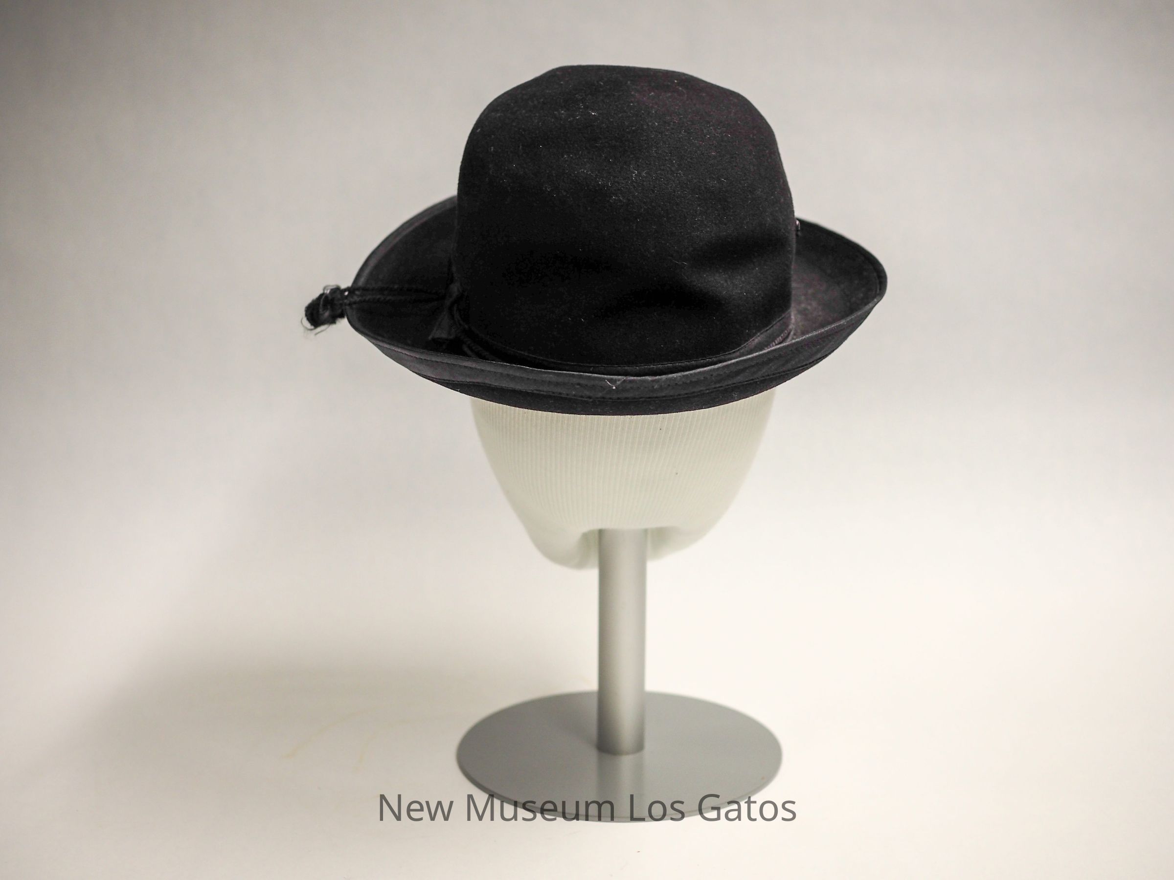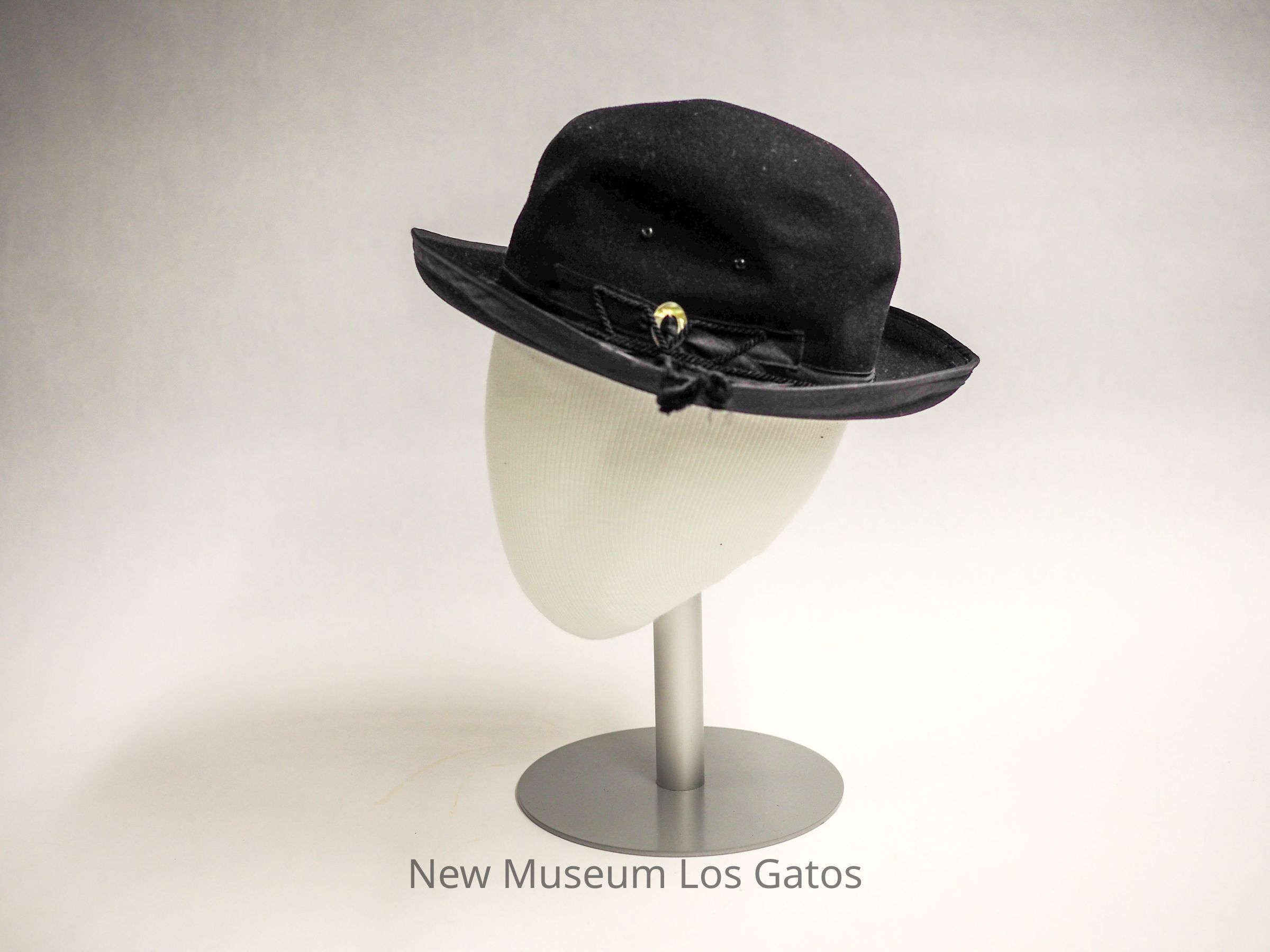 A round black felt hat with a curled brim. There is a black ribbon tied into a bow serving as the hatband with a mother of pearl buckle, and a decorative cord with baubles on the ends. Inside the hat is a thick paper hatband made to look like leather, and blue satin lining with a gold crest at the center. The underside of the brim is partially lined with black satin.Collection