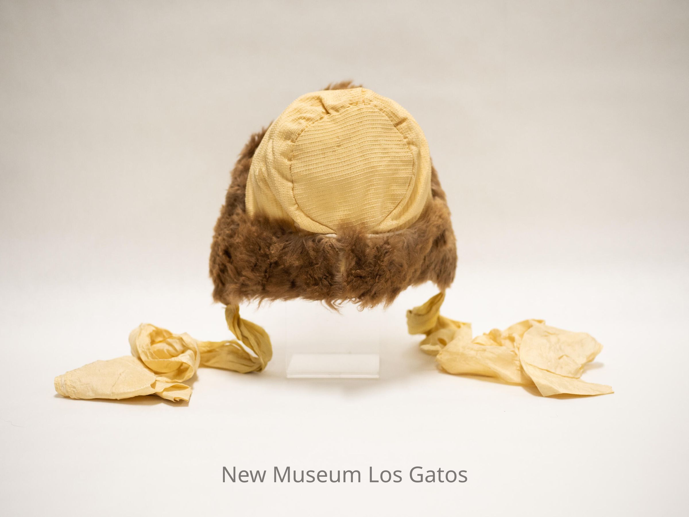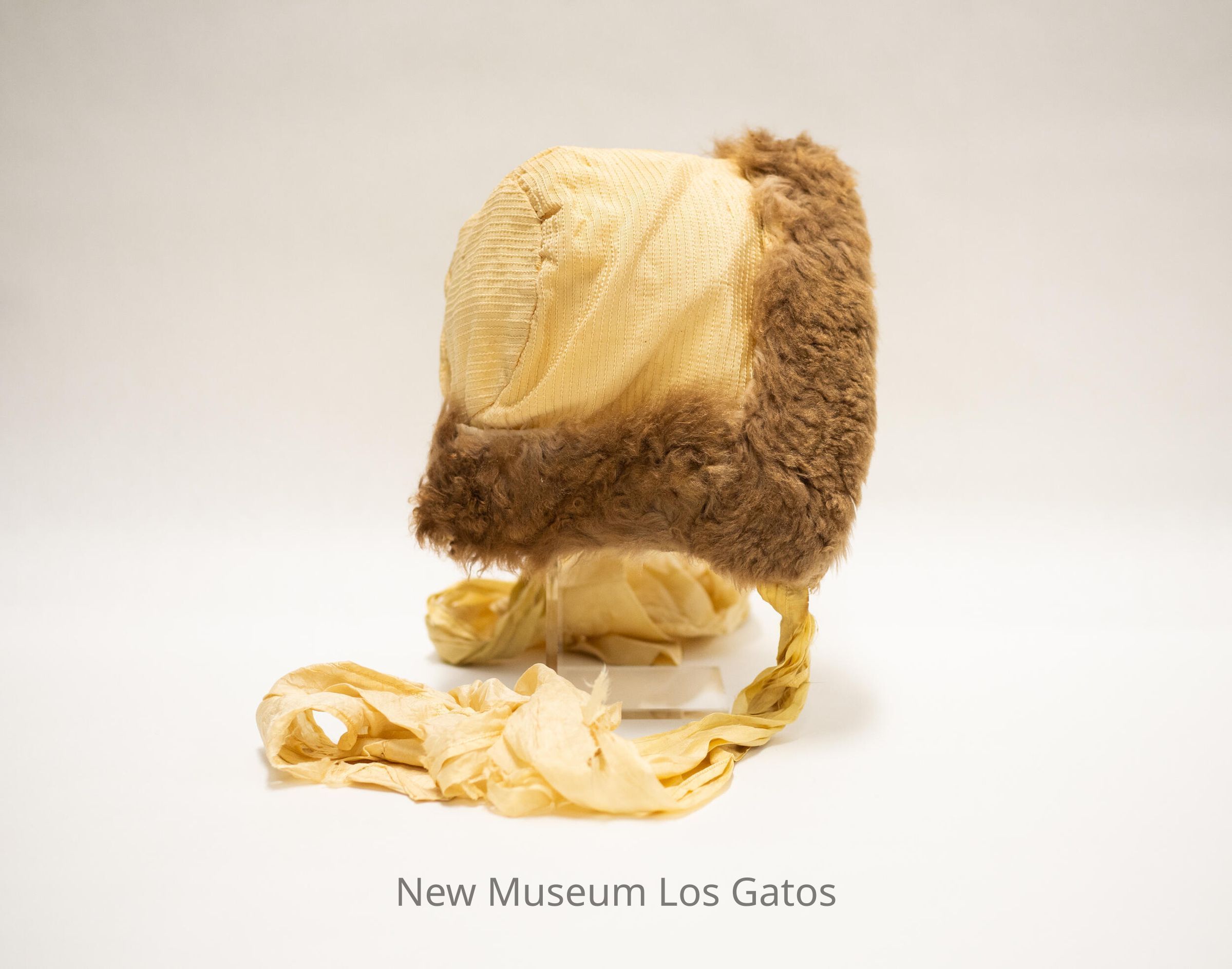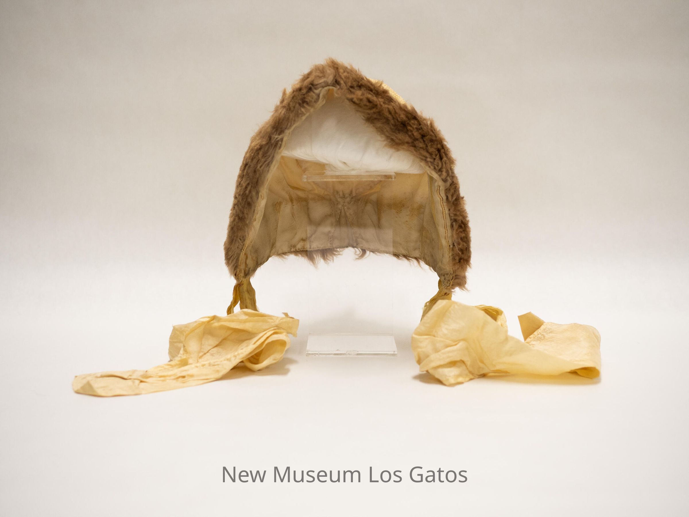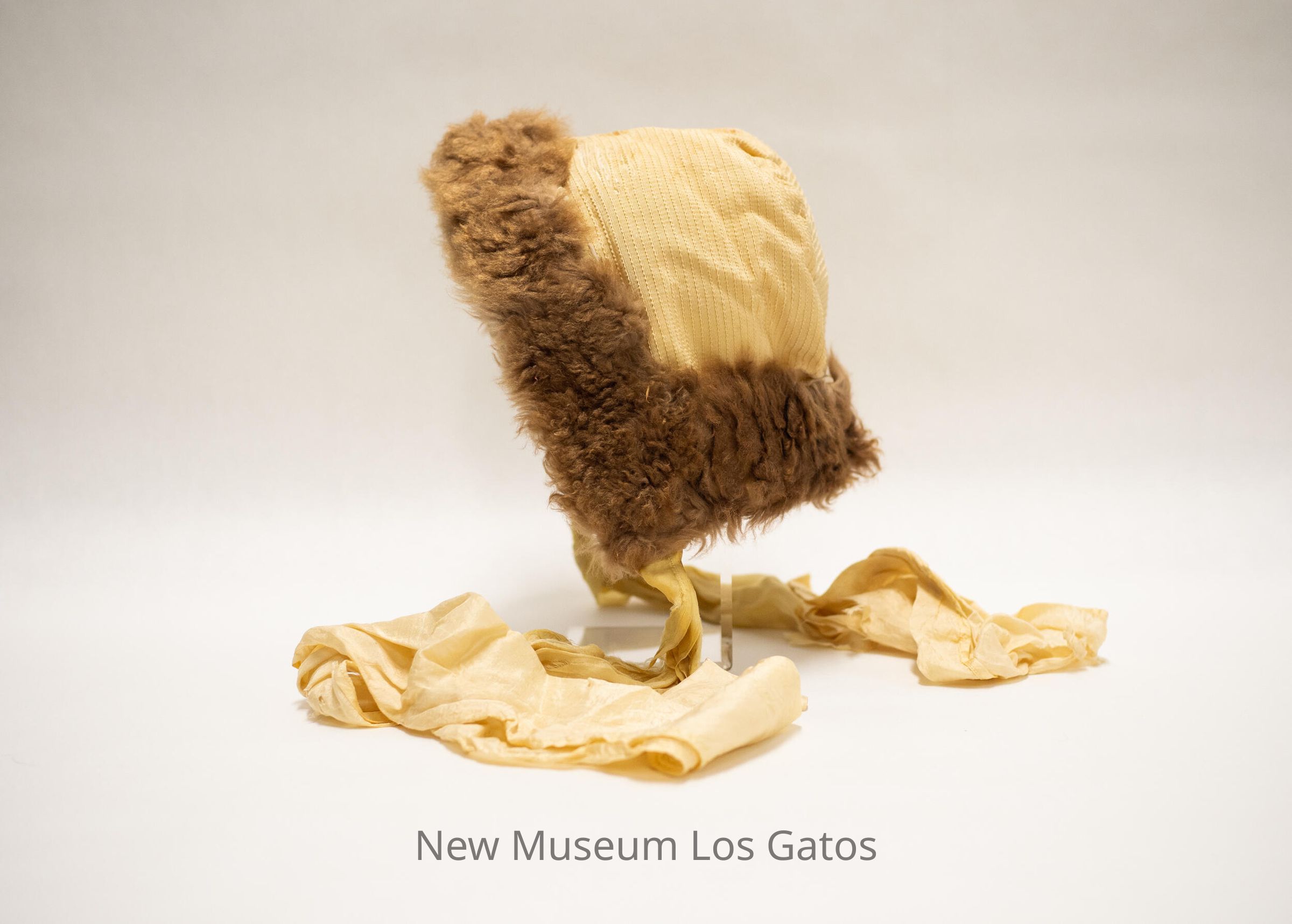 A cream colored silk bonnet, with brown fur trim.