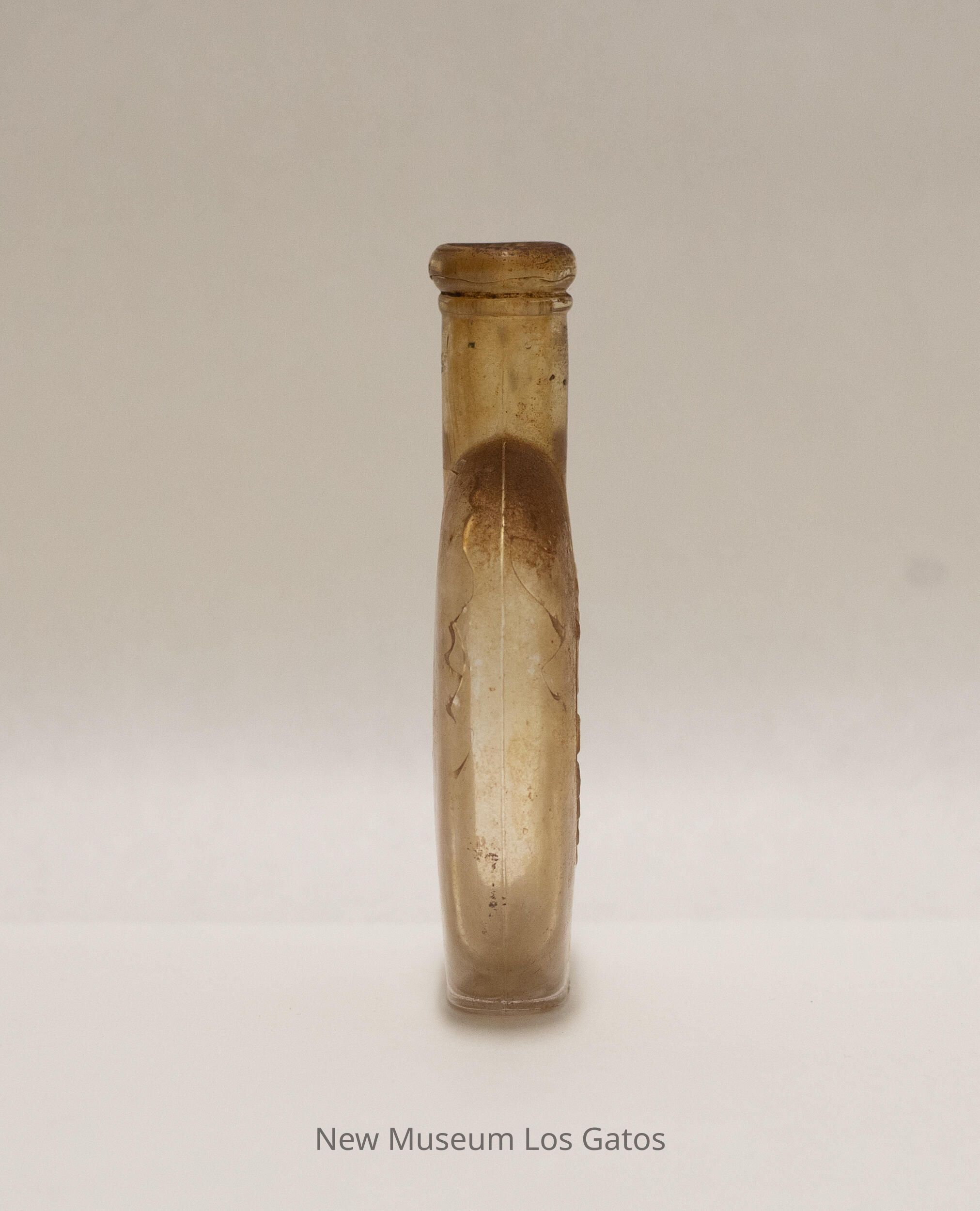 A small clear bottle. The main body of the bottle is slightly square and slightly rounded, with a moderately long neck. There is an inscription embossed on one side of the body, which is detailed below.Collection