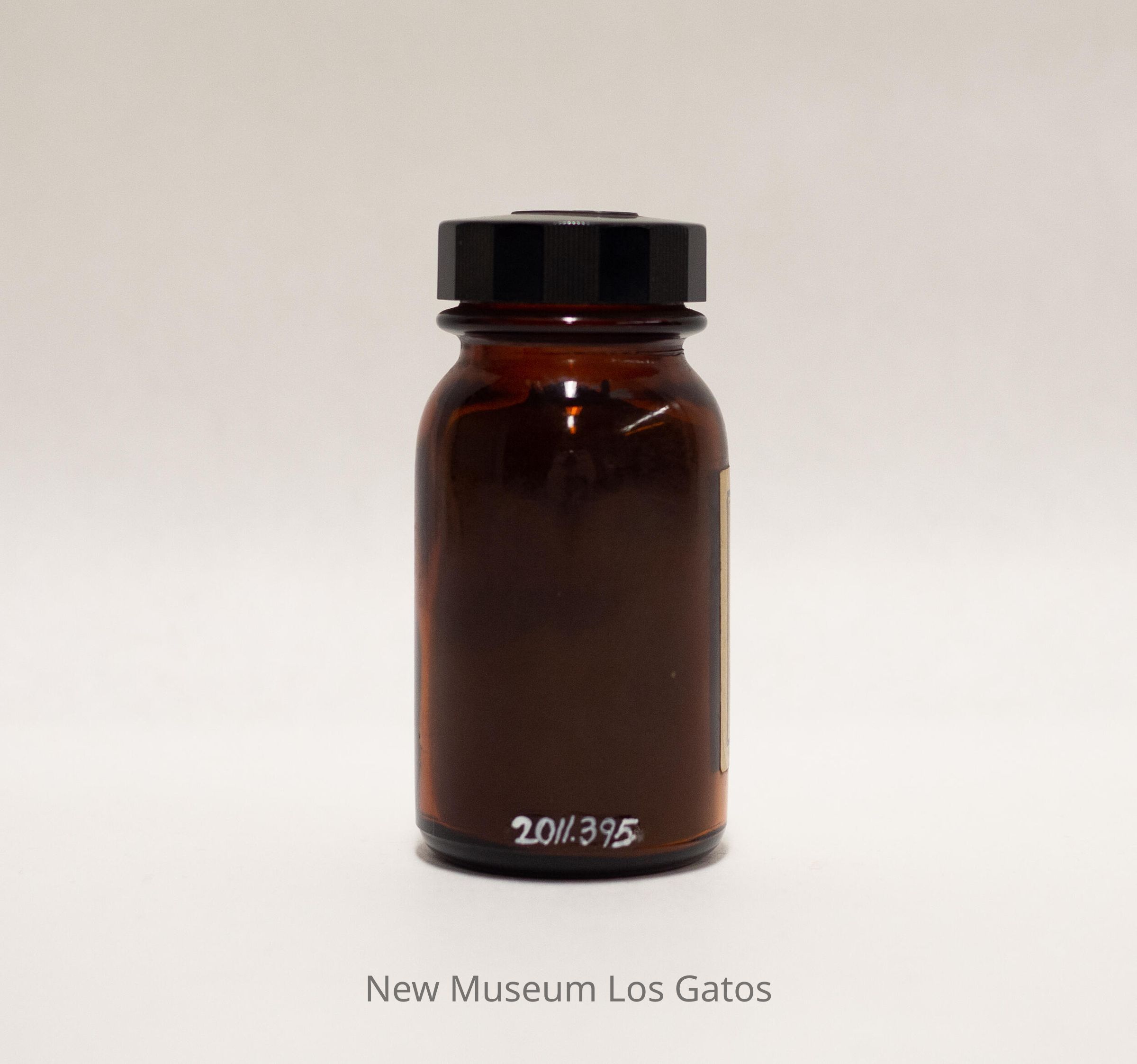 A small, quarter pound, amber-colored bottle of reduced iron. The bottle is mostly full of the powdered substance. The lid of the bottle is a black plastic screw-top, and there is a label attached to the front of the bottle.