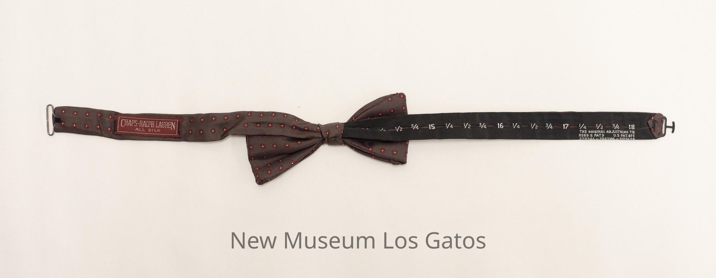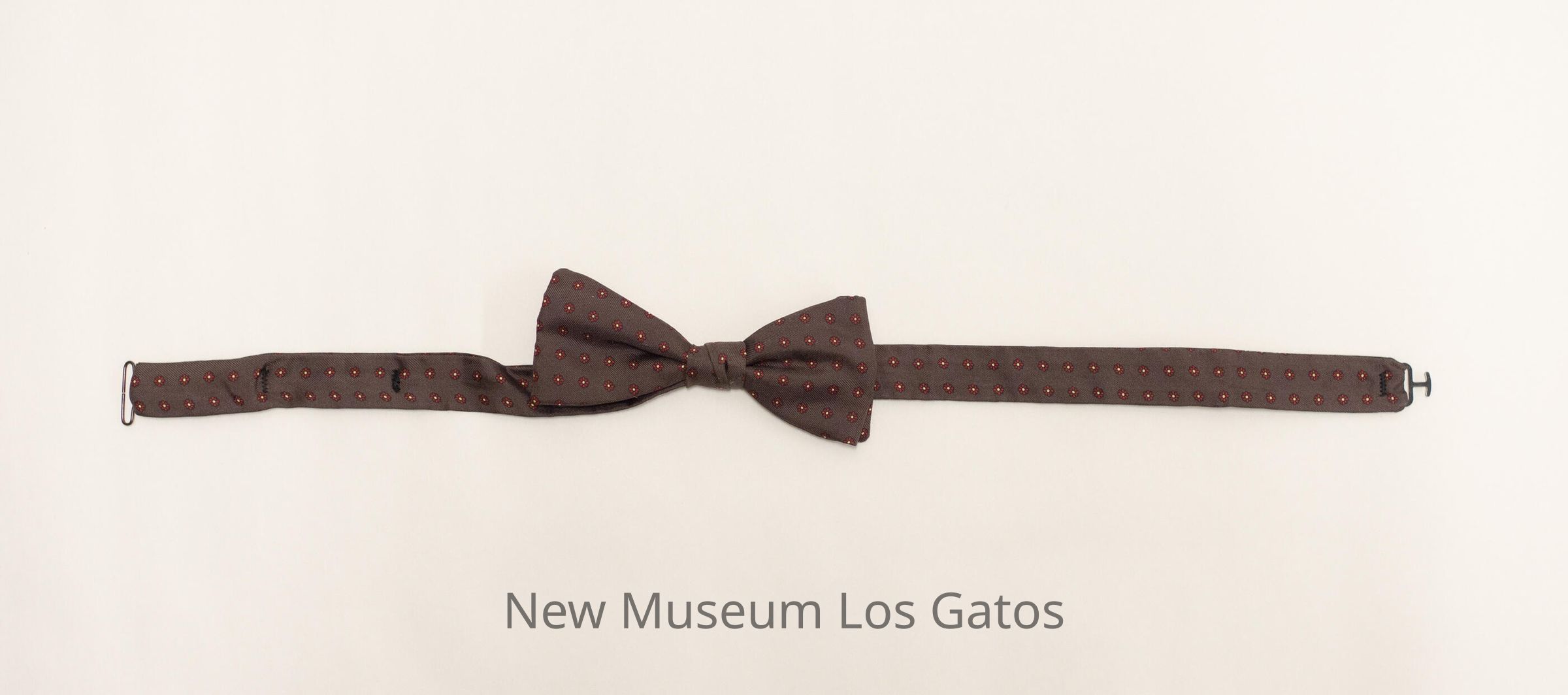 A dark gray, adjustable bow tie. There are two strands coming out of the bow, with a metal hook on one side and a metal clasp on the other. There are small red and white flowers throughout the entire bow tie.Collection