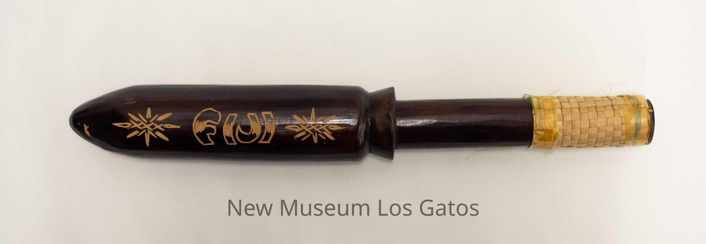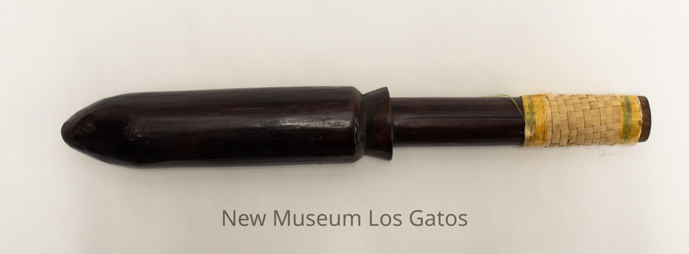 A mostly cylindrical piece of wood, that tapers to a point towards the bottom. The handle portion is skinnier than the rest of the club, and the wood tapers inward where the handle meets the rest of the club. There is a woven cover around the end of the handle, and etched decorations along the main body of the club.Collection