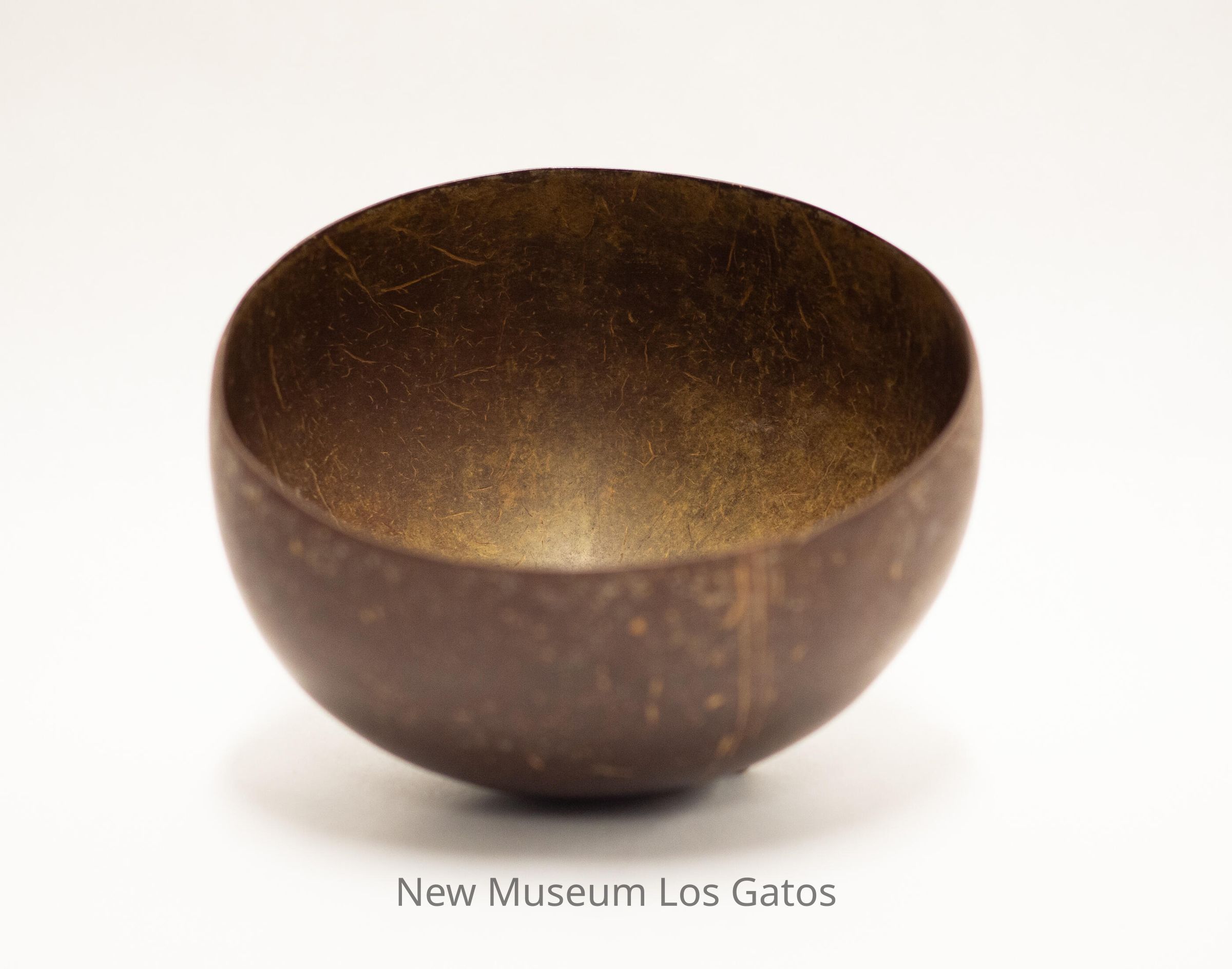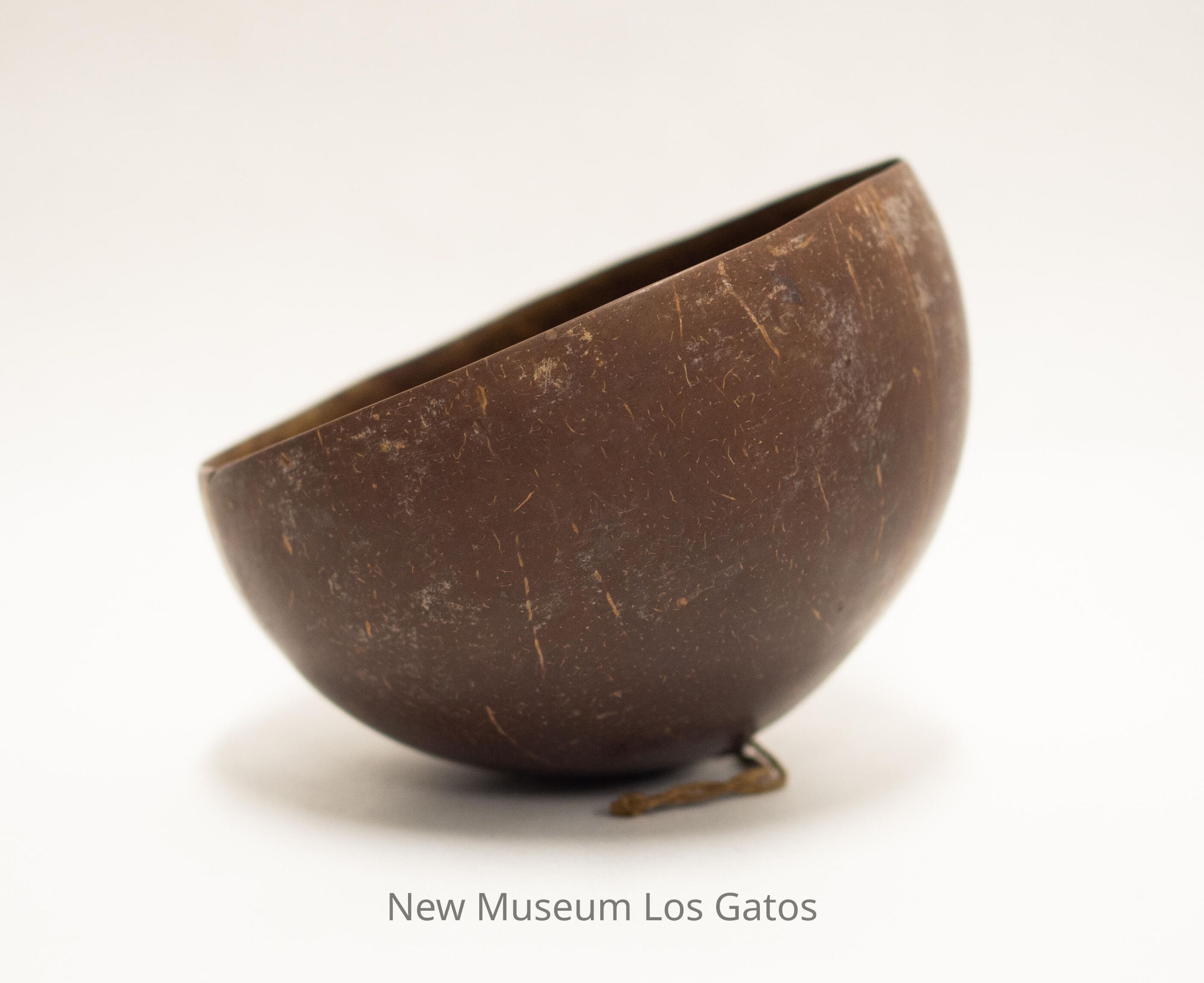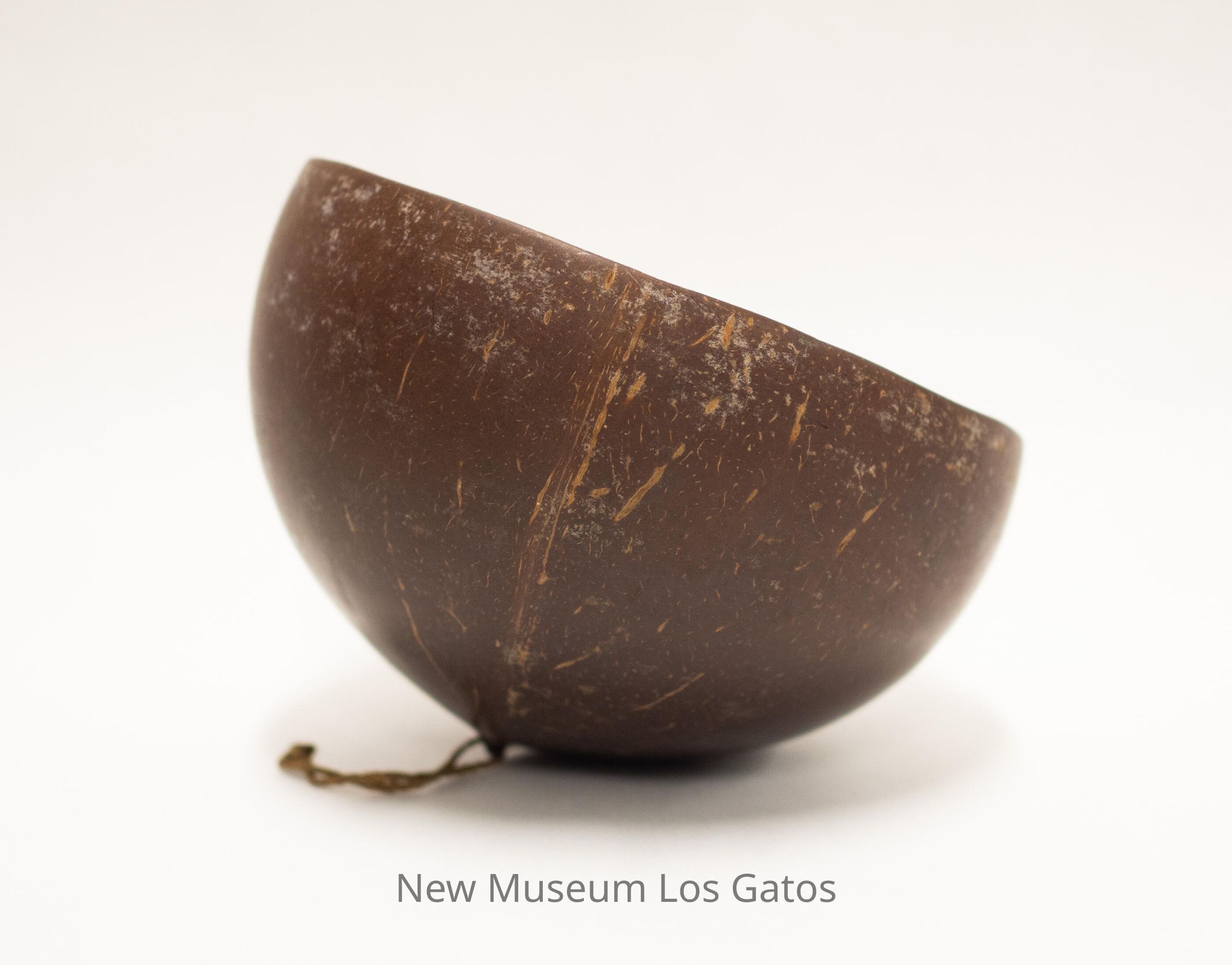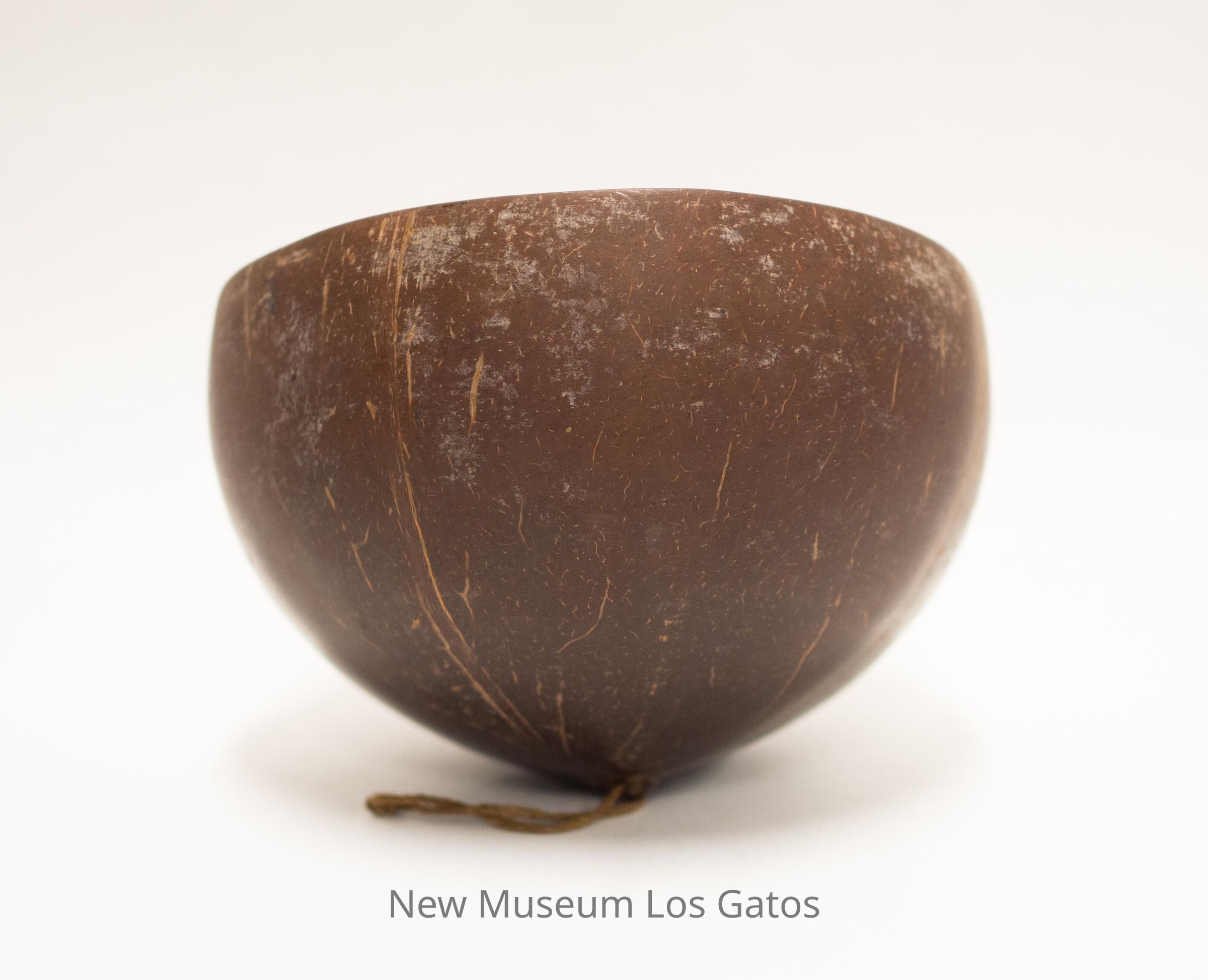 A deep, circular brown bowl with a rounded bottom. At the bottom of the bowl is a small loop of light brown string, threaded through a small, raised hole on the bowl.Collection