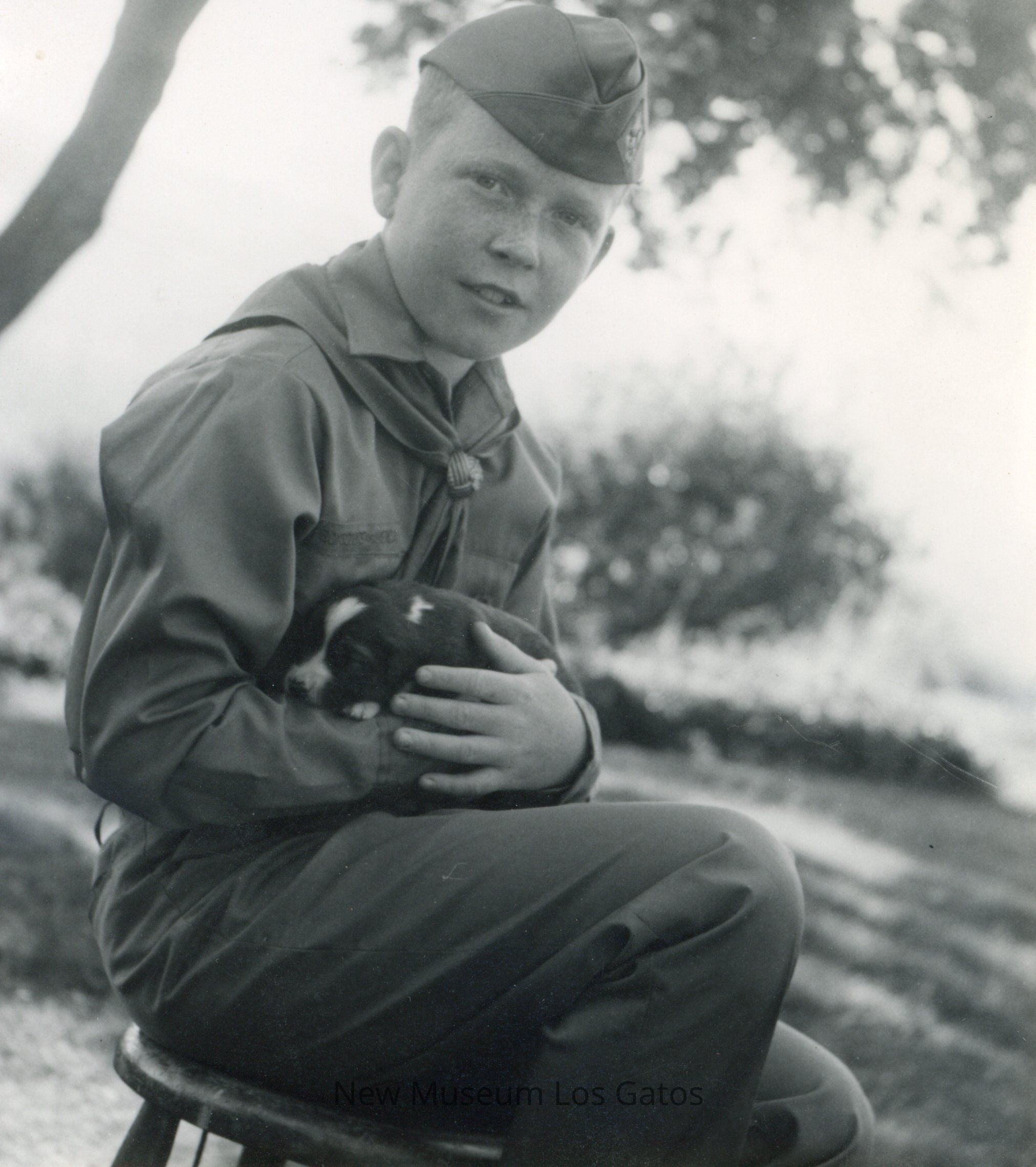 Black and white photograph of a boy in uniform holding a puppy.