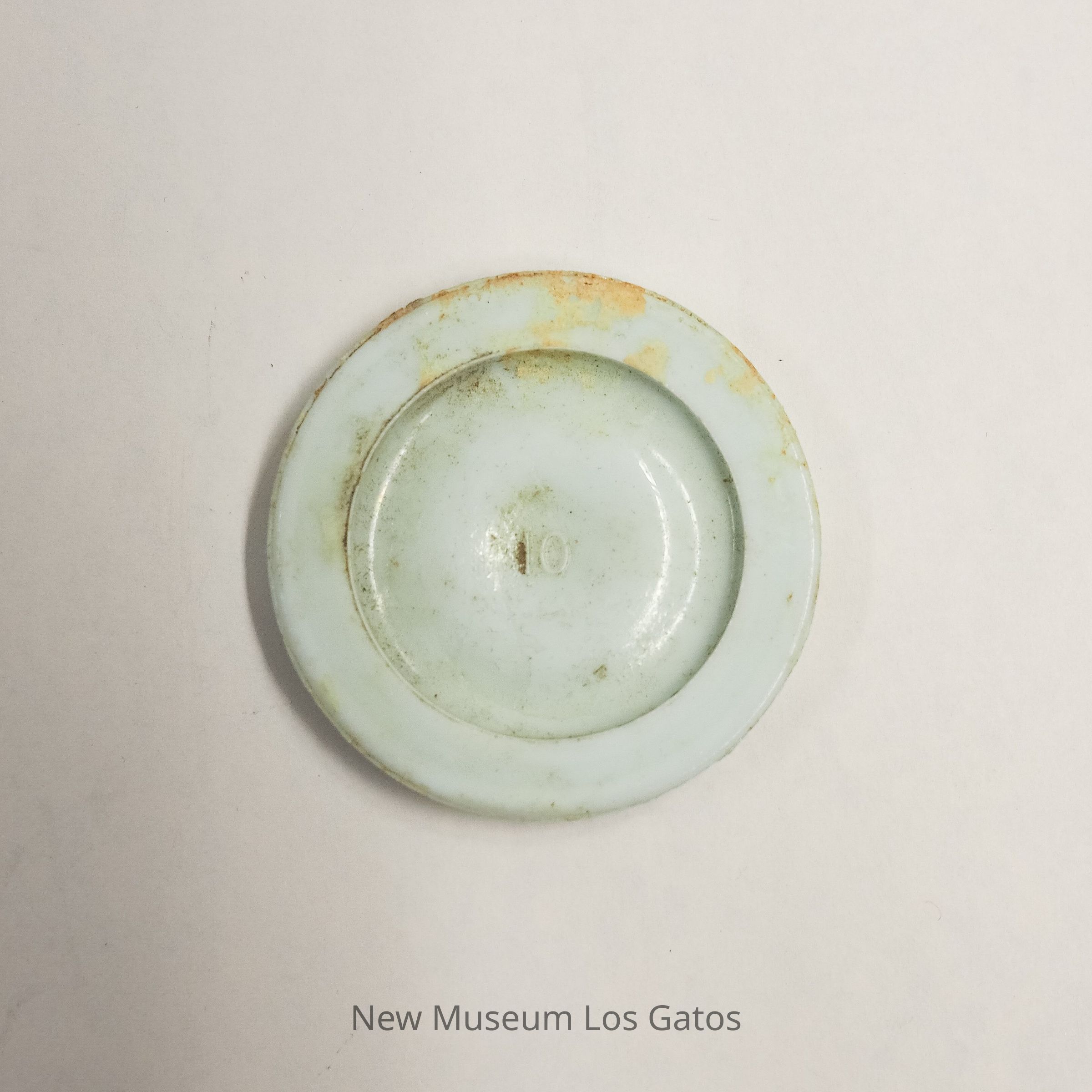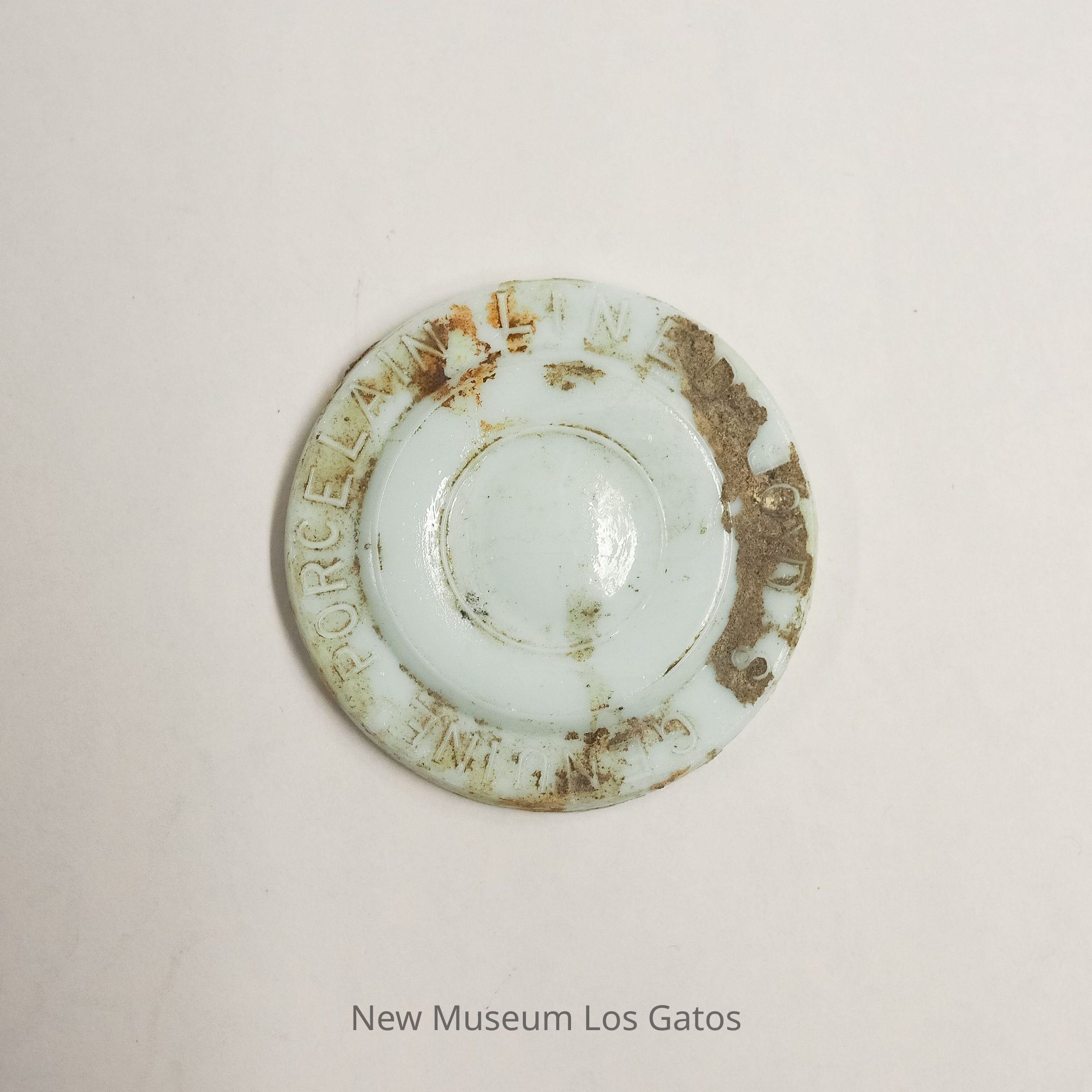 A small, flat, round light blue bottle cap with the inscription "Boyd's Genuine Porcelain Lined" around the edge.