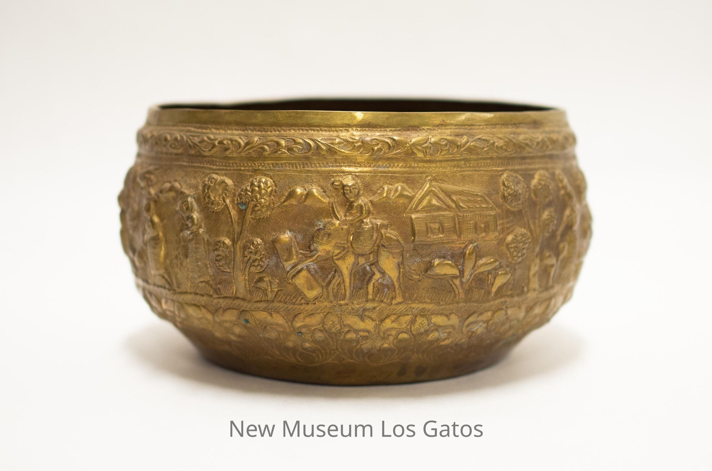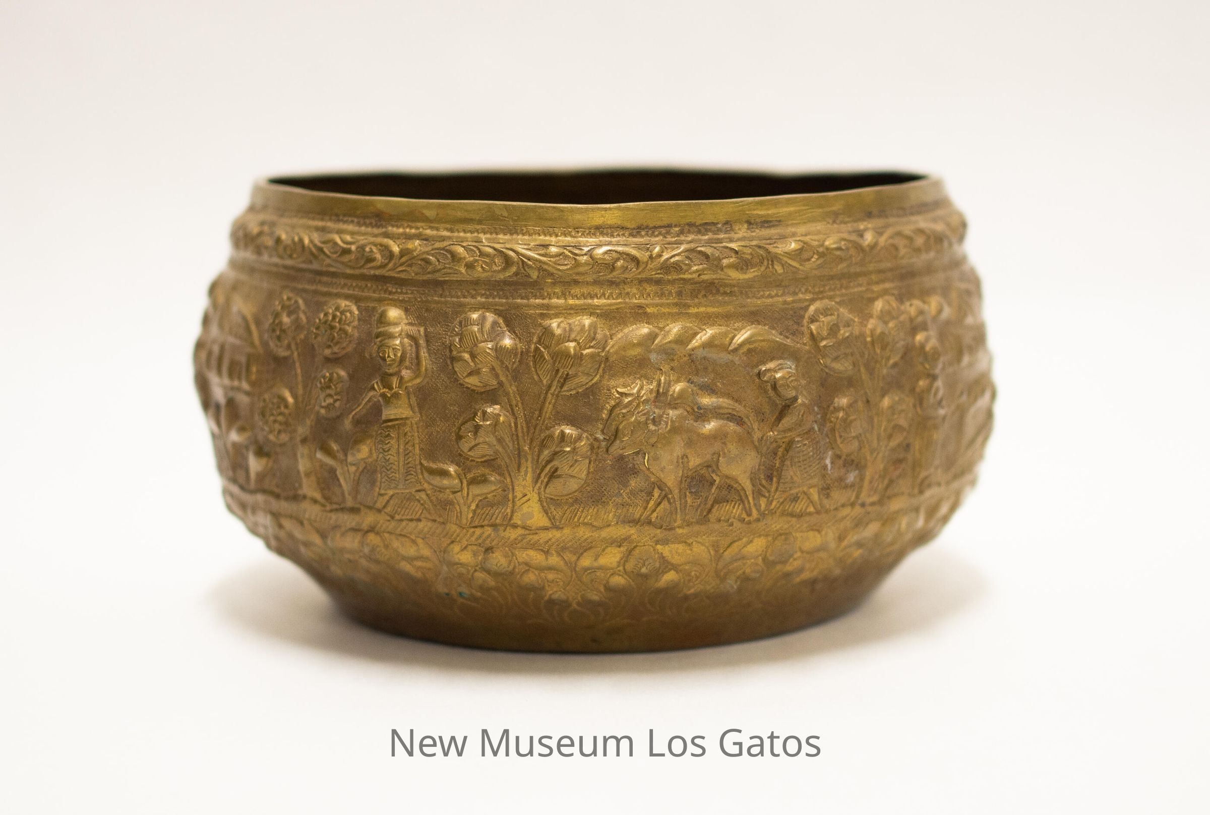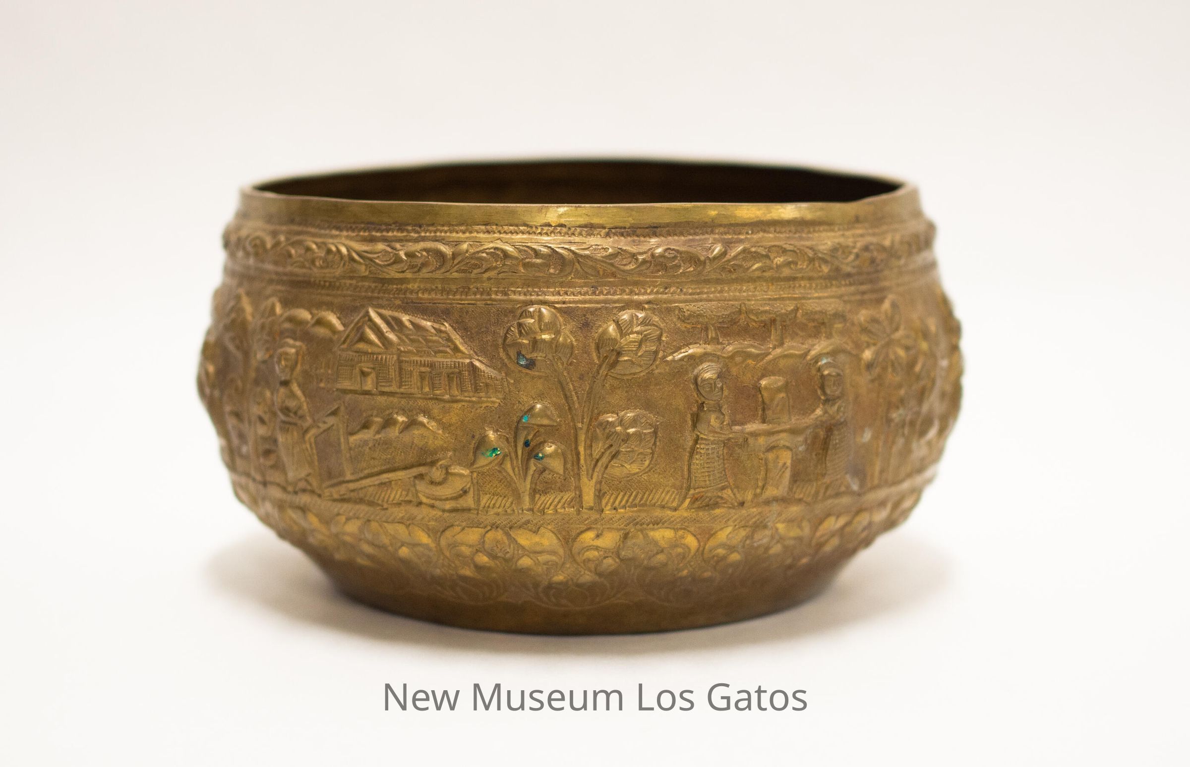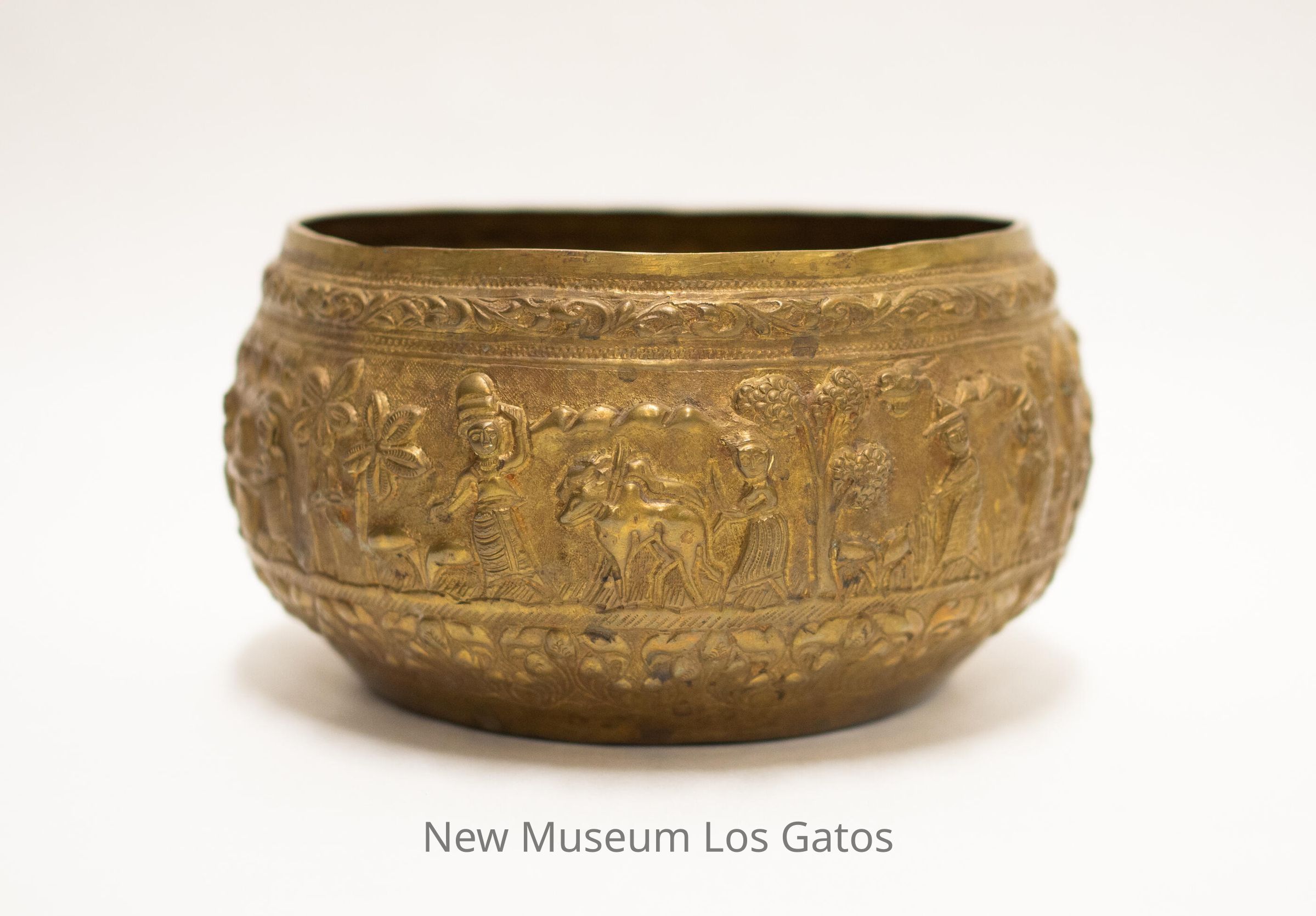 A medium, circular brass bowl featuring repoussé motifs. The main motif depicts an agrarian scene, with many people doing a variety of tasks outdoors, with a few animals assisting. There are many trees and flowers depicted as well, with a few buildings in the background. There is a thin band of leaf motifs around the rim above the main motif, and a larger band of floral motifs around the base under the main motif.Collection