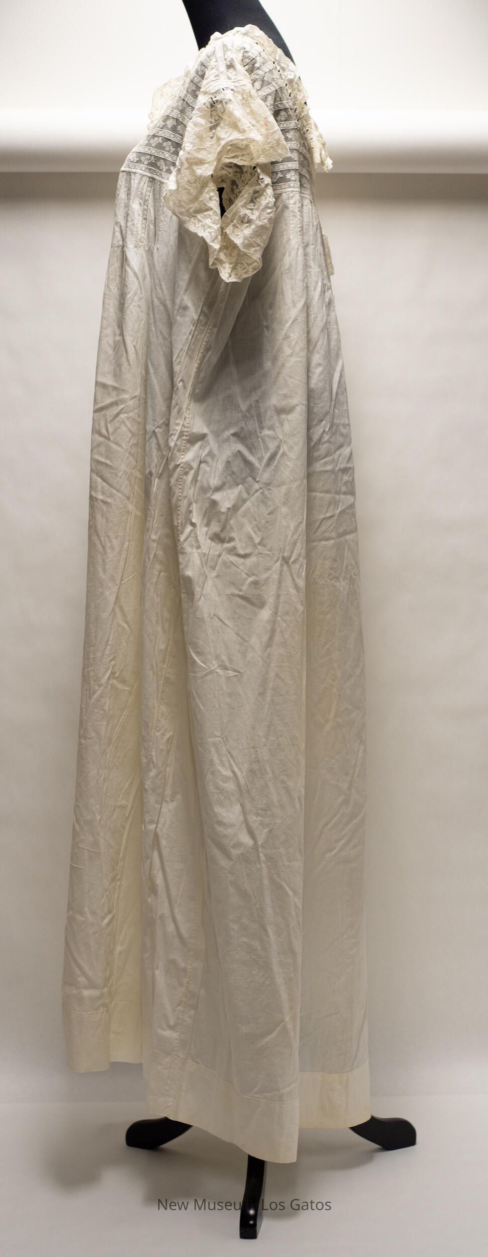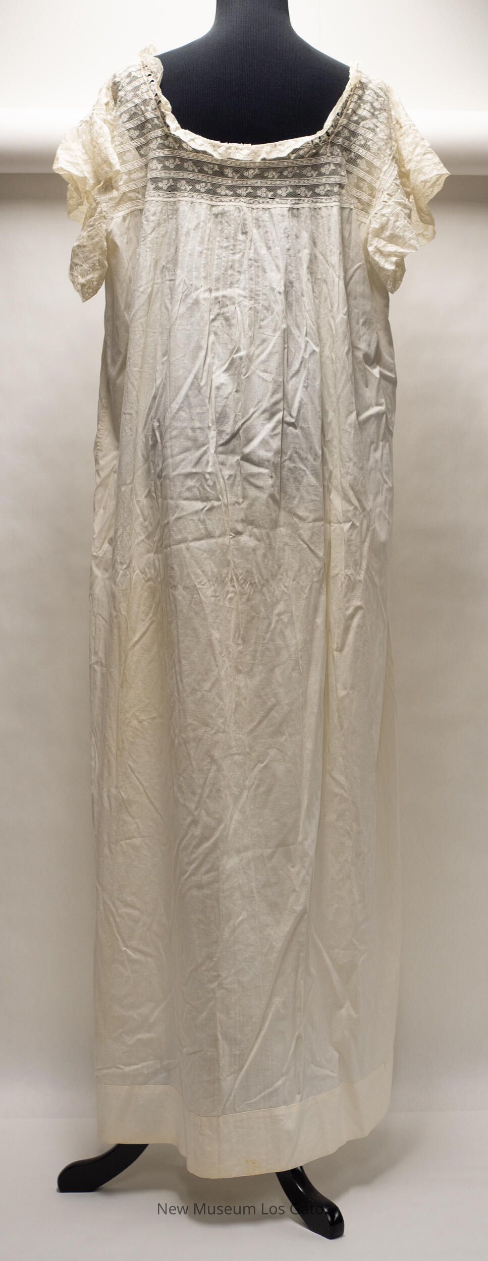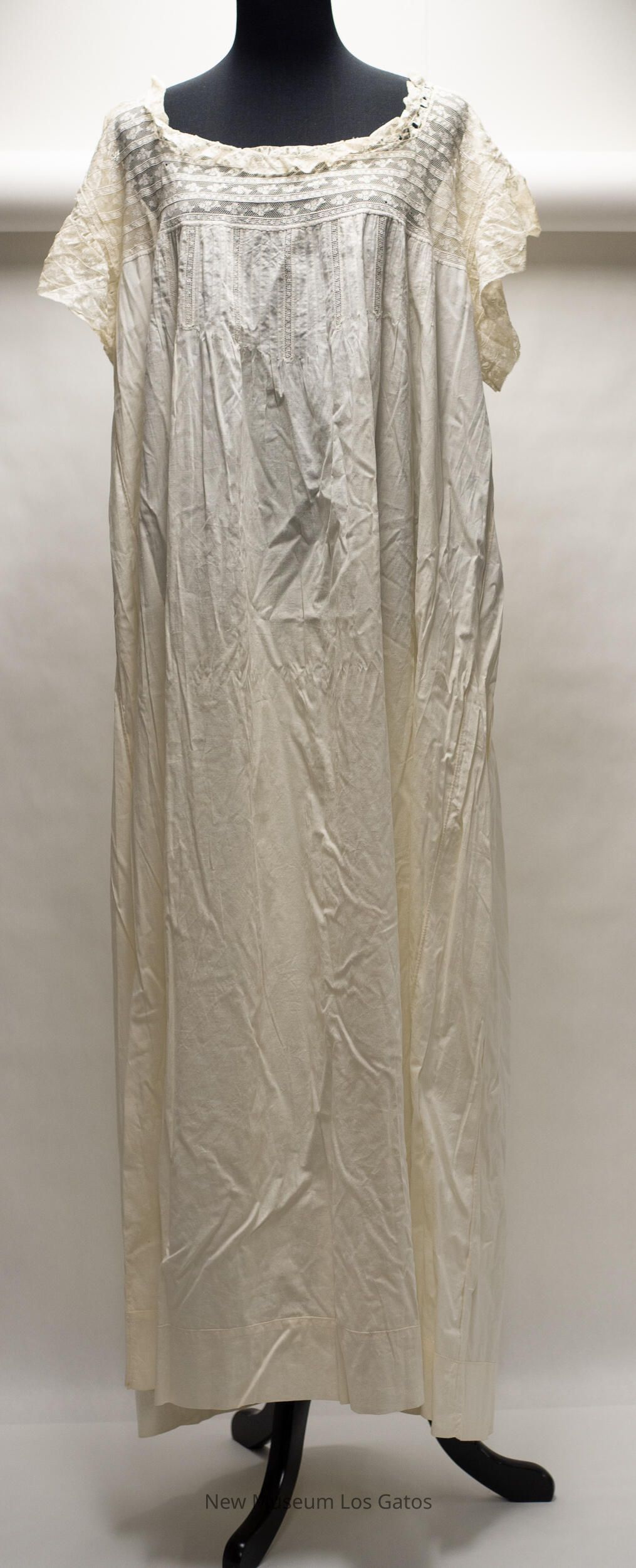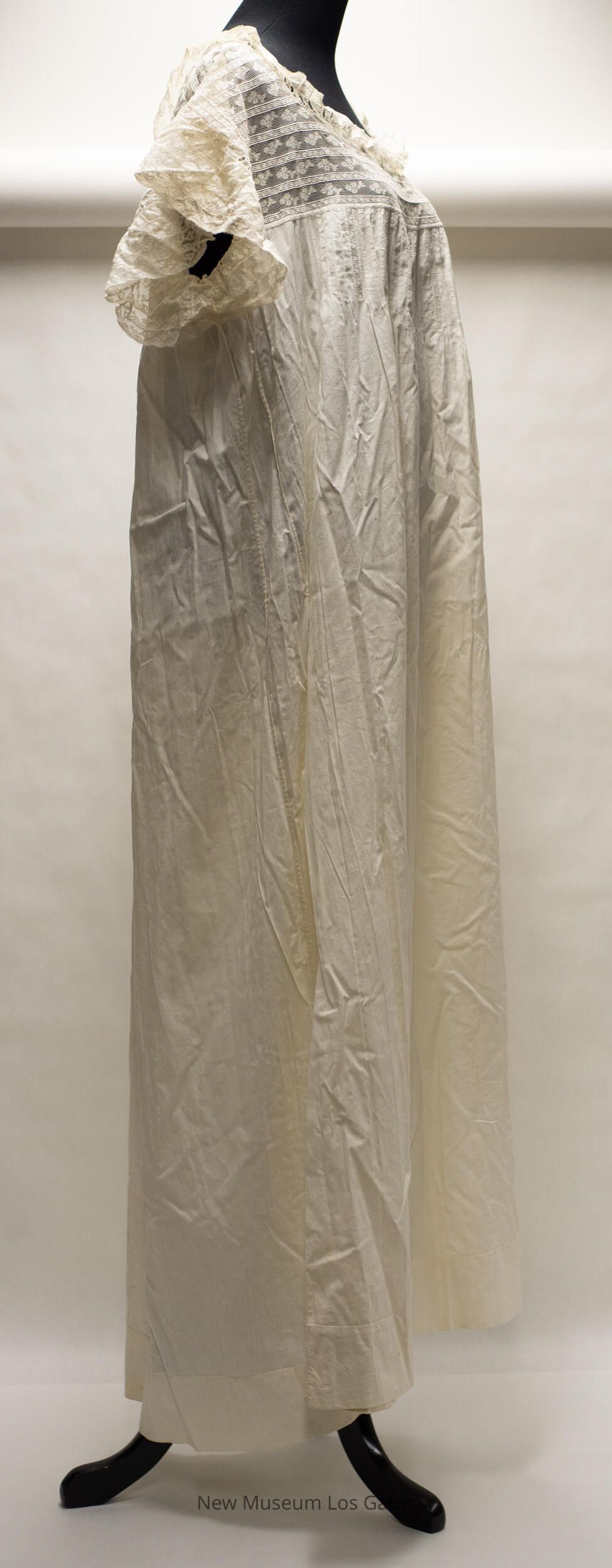 A long, white cotton nightgown. The bodice, shoulders, and sleeves are lace, with a floral pattern and horizontal stripes. There are also seven vertical lace stripes extending down from the bodice on the front of the nightgown, and fabric ruching on the back of the nightgown.Collection