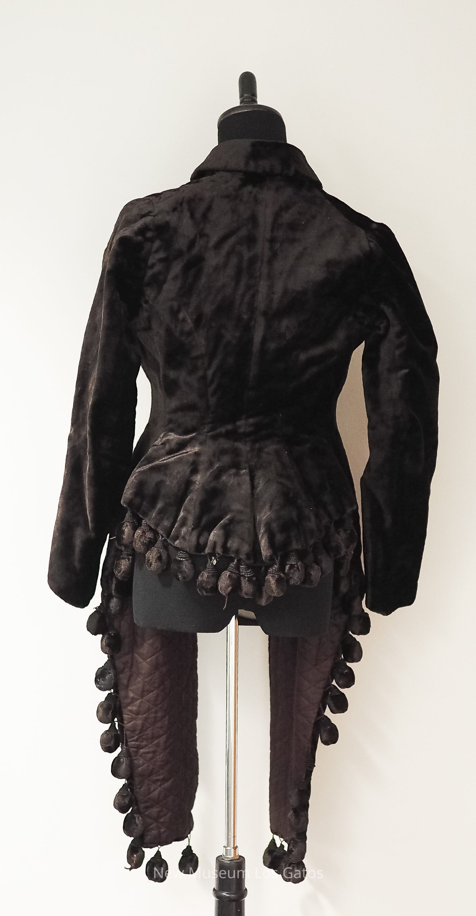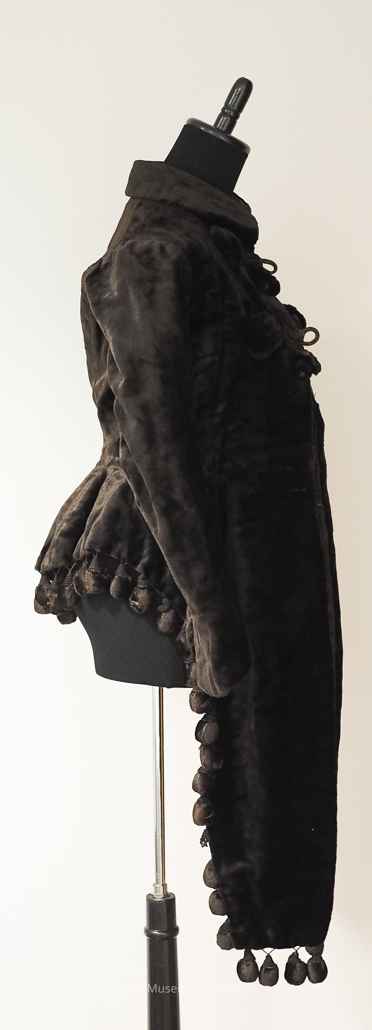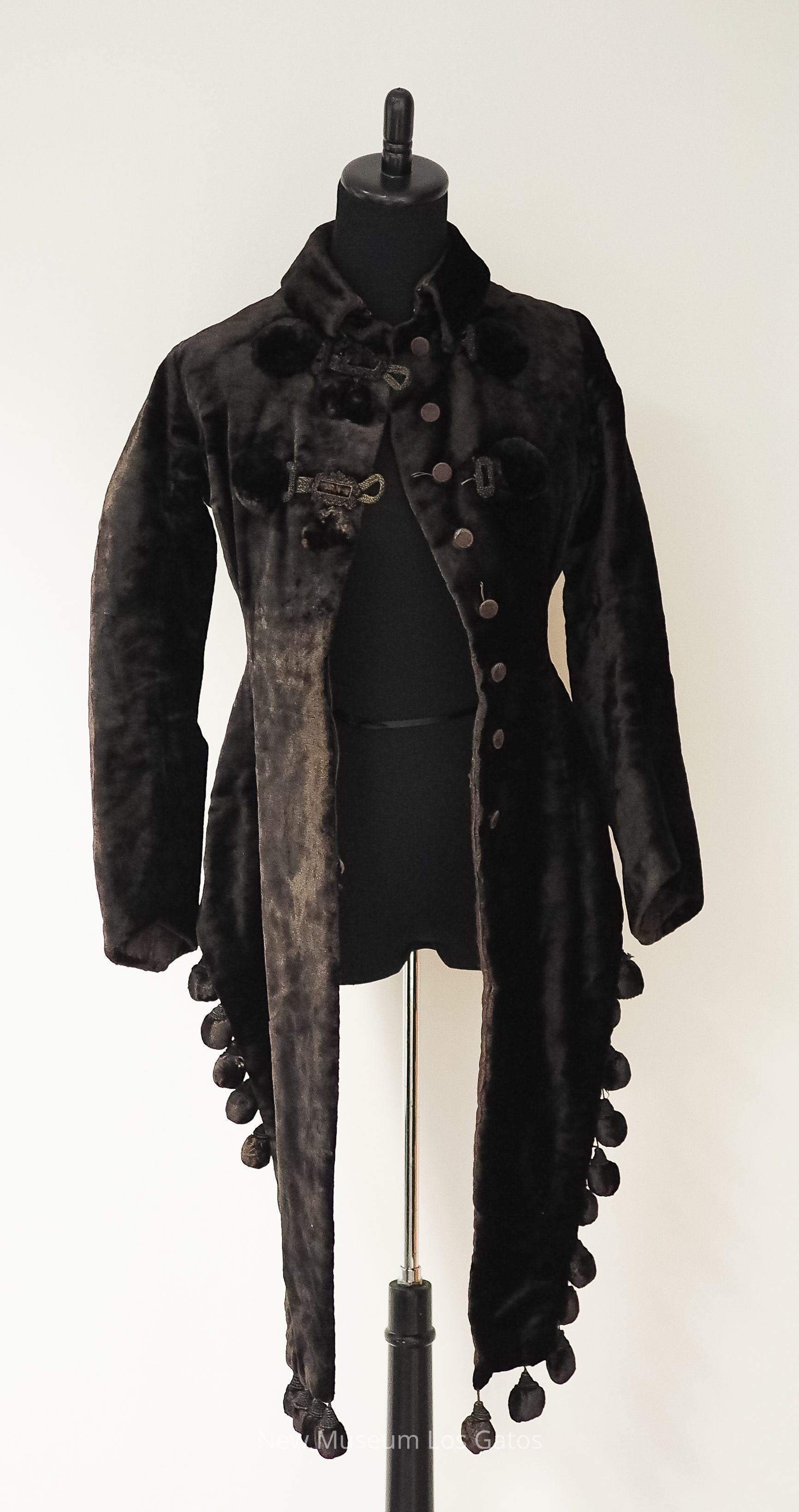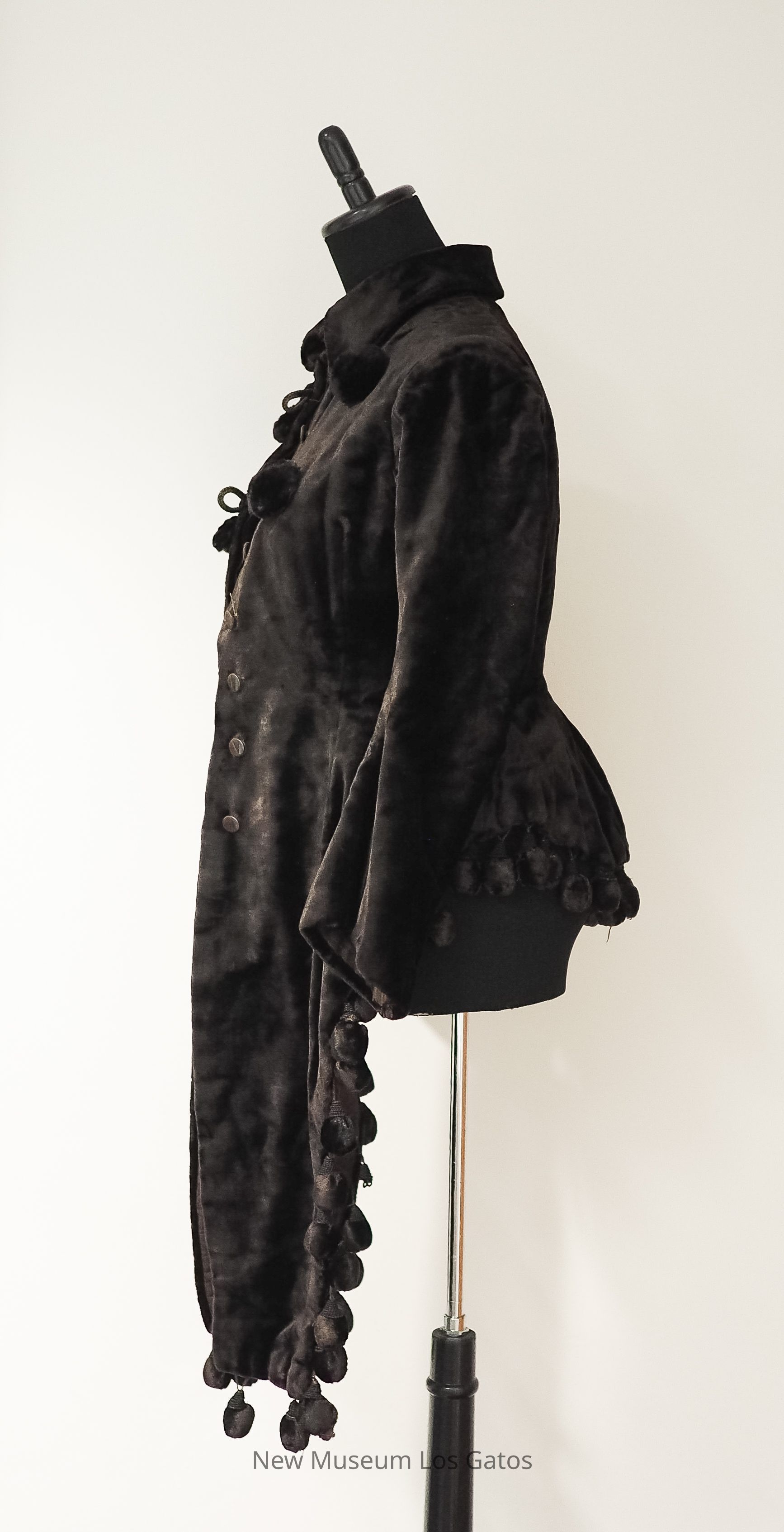 A dark brown velvet women's jacket, with ball trim. The jacket front has long coattails, and the back is short.Collection