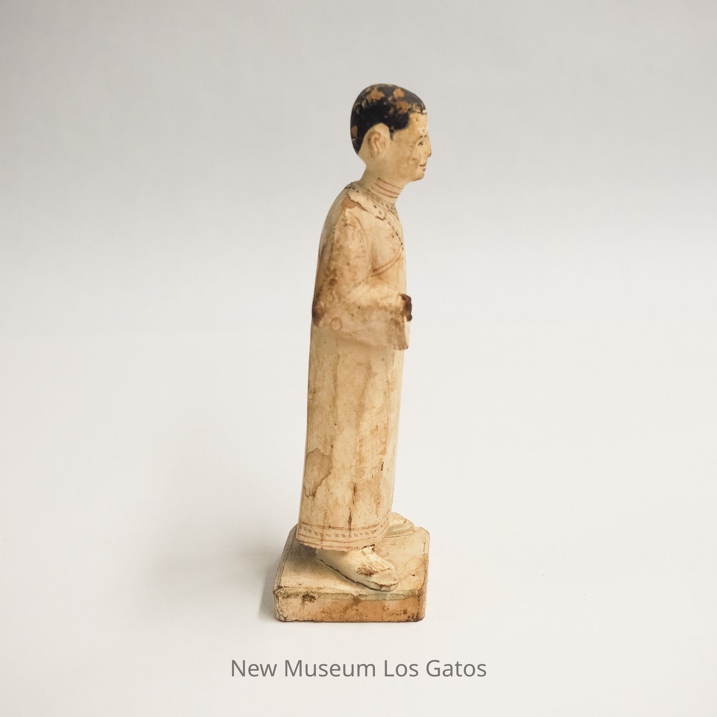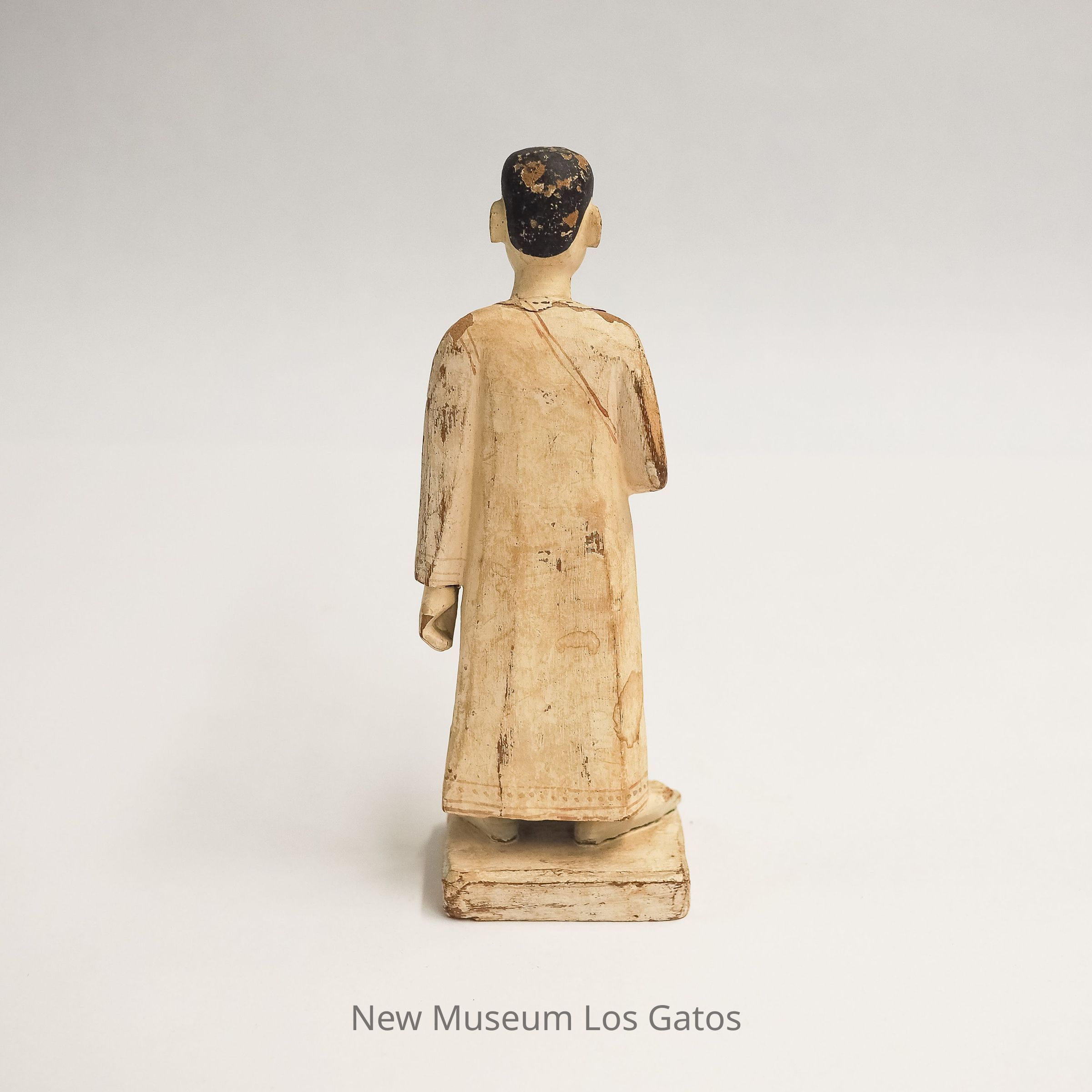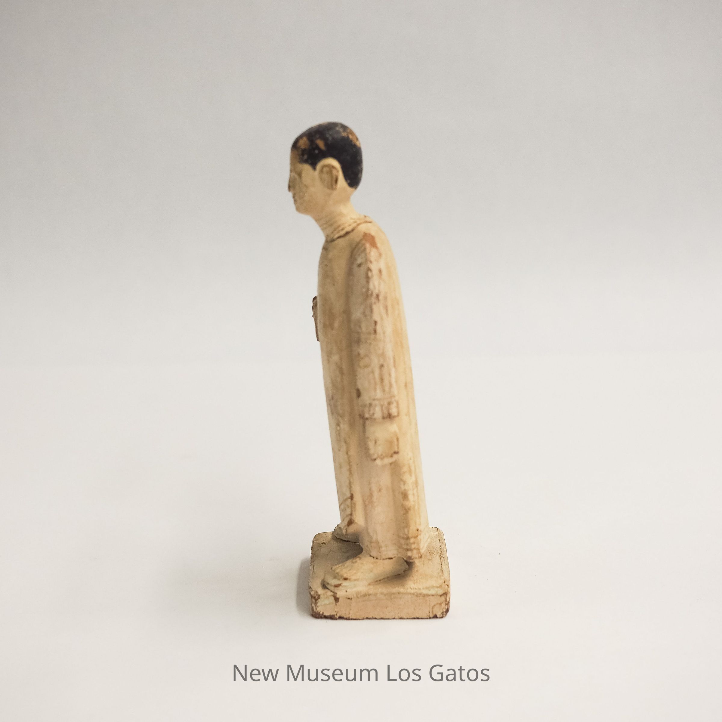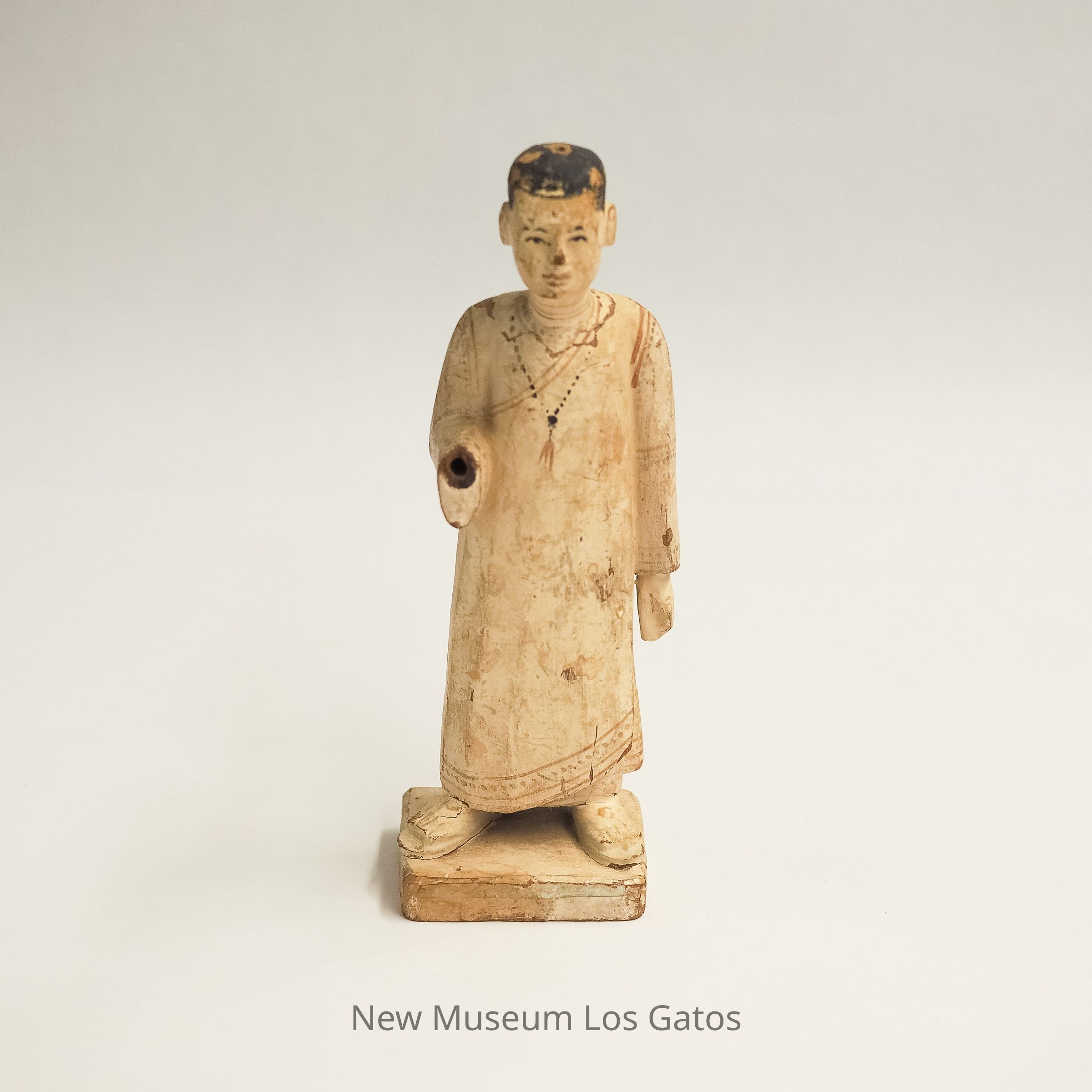 A small, painted wooden figure in a long white tunic and prayer beads (mala), with a close-shaved head representing a Buddhist monk. The figurine has a small hole in its head and is possibly missing a decoration, or to hold an incense stick.Collection