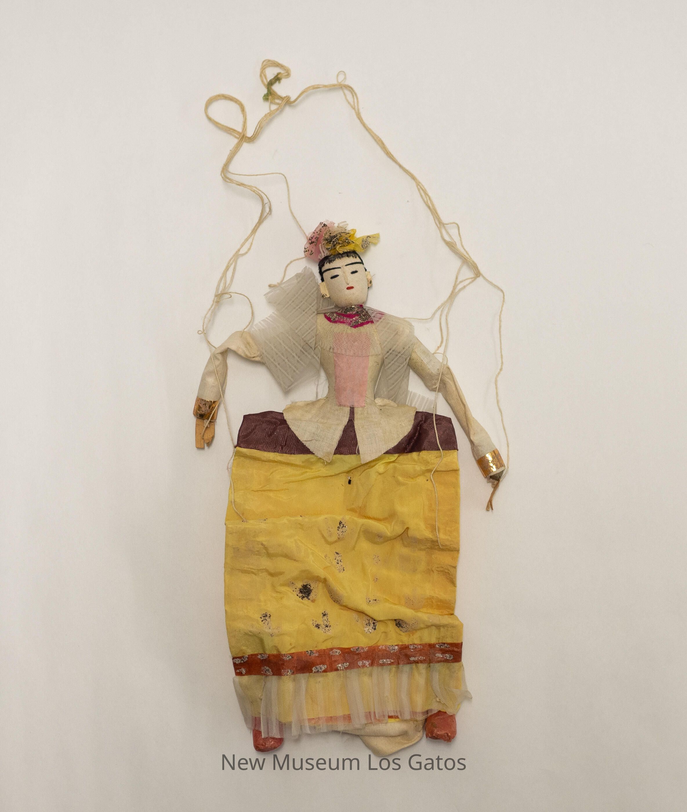 A female marionette, with white strings attached to the hands, arms, shoulders, and feet. The doll itself is wearing red/brown shoes and a long yellow skirt with glitter dots throughout the center, a red/brown stripe near the bottom above a sheer ruffle, and a purple/maroon stripe at the top. The shirt is a white long-sleeved shirt with a light pink stripe down the center and a peplum extending over the skirt. The shirt also has a fuschia collar with sheer fabric flowing around the shoulders. The doll is wearing a hat made from sheer, yellow, white, and pink fabric. The doll's hair is black, and the facial features are sewn on; the eyes and eyebrows in black, the nose in white, and the lips in red.Collection