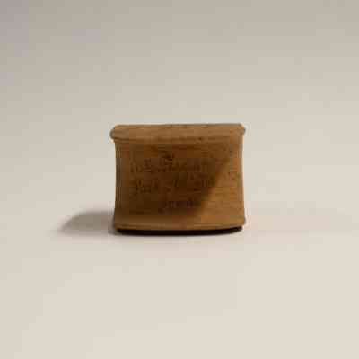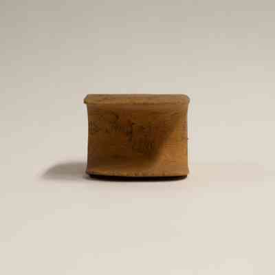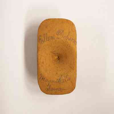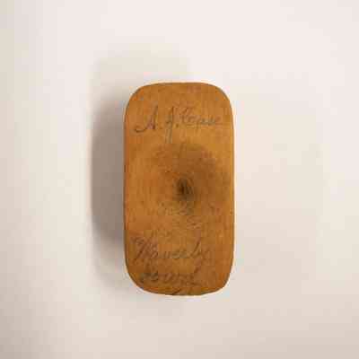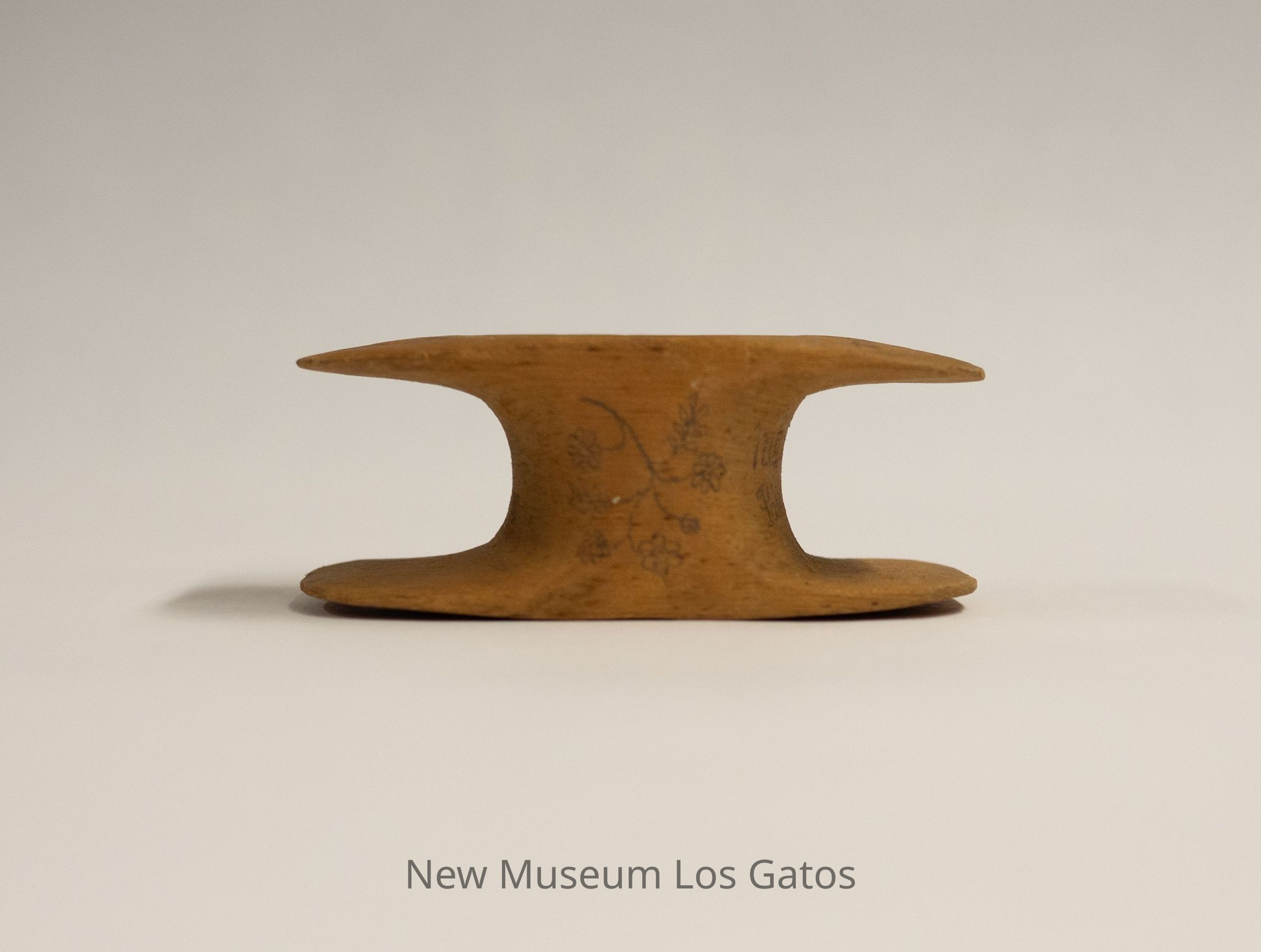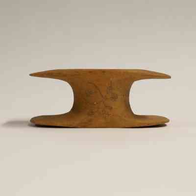 A small, unidentified wooden object. The object is flat on the top and bottom, with a thick base/stem in the center. There is a concavity/divet on each flat side.Collection